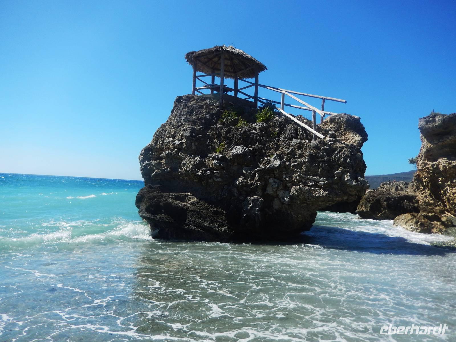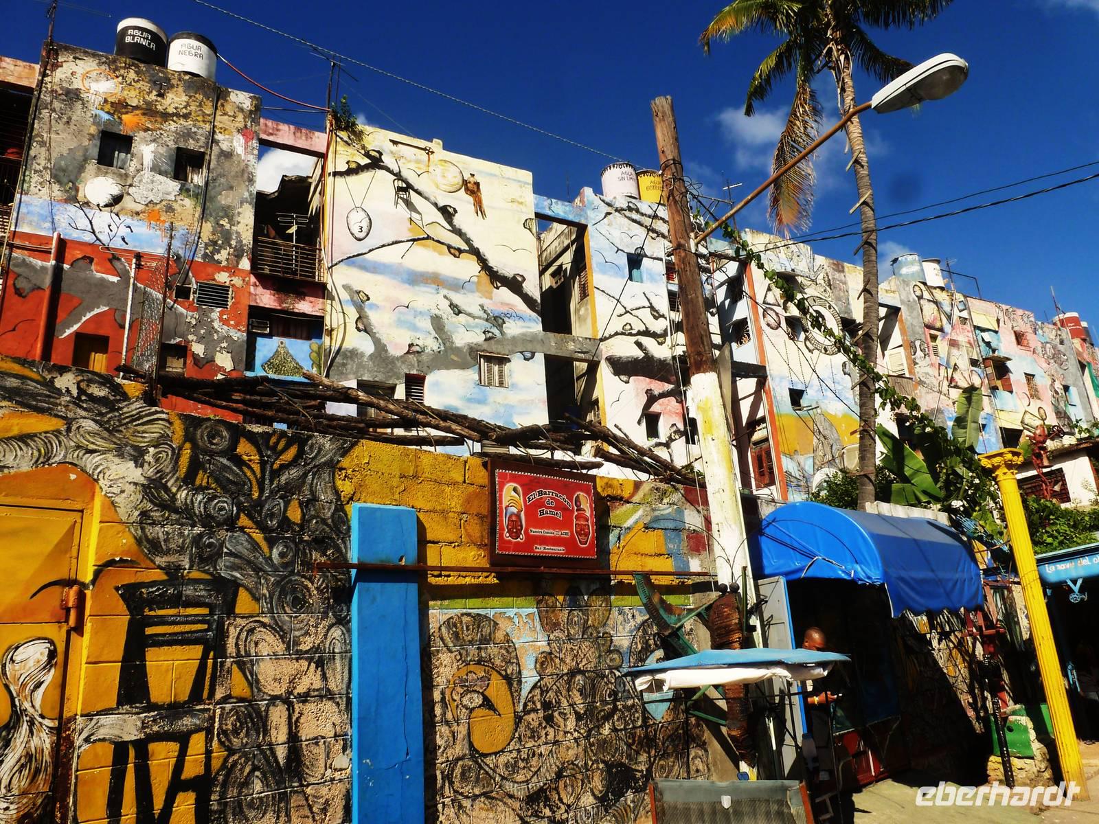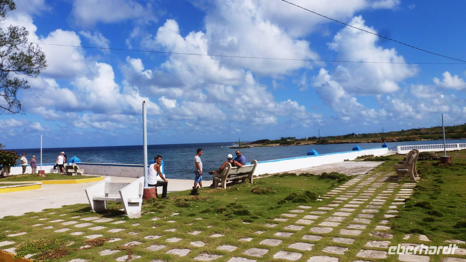 Luis fährt mit uns zur Festung Fuerte Matachin, welche das Museo Municipal beherbergt. Ein unscheinbares, aber sehr interessantes Museum. Wir erfahren von präkolumbianischer Kultur, Piraterie, Sklaverei und Unabhängigkeitskriegen und von Königin Maria Christina von Habsburg. Hübsch anzusehen ist auch die Sammlung von Polymita-Schnecken, die wir auch schon am Vormittag am Strand gefunden haben. Entlang der Strandpromenade spazieren wir zurück ins Zentrum und entdecken zwischen den Ruinenhäusern eine hübsche, bunte Bar. Hier halten wir und genießen einen Mojito Especial oder eine Pina Colada bei Meerblick.