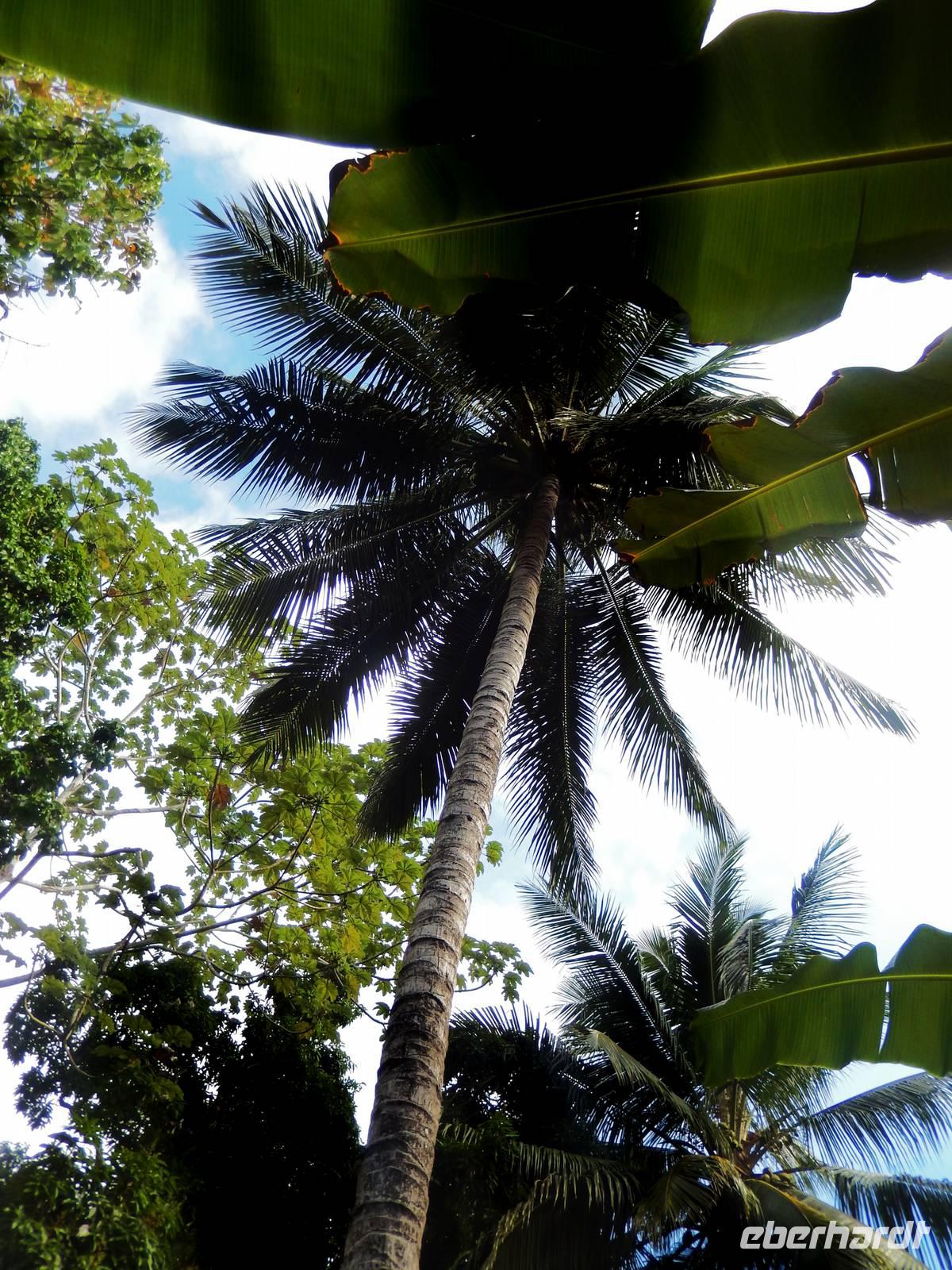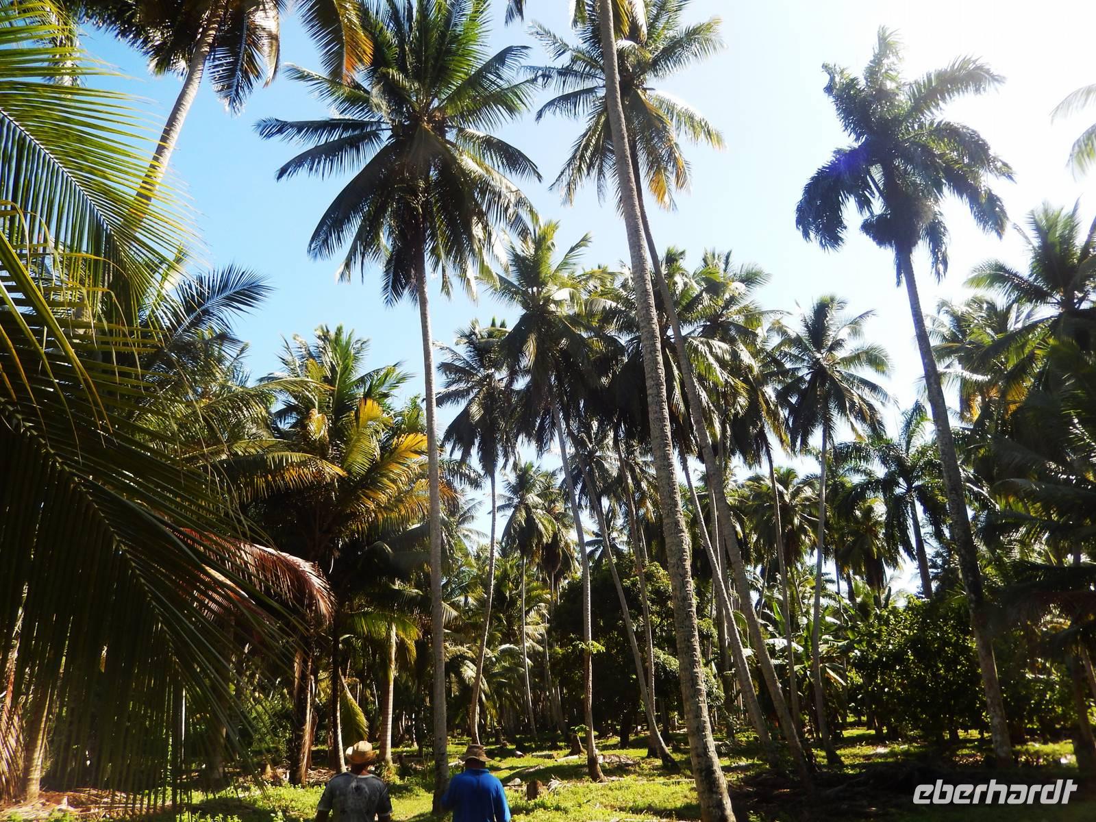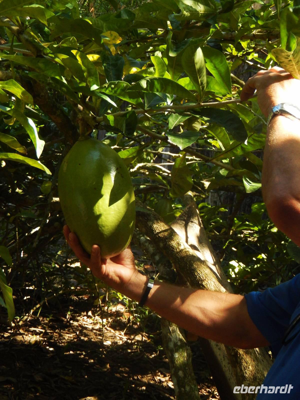Dann erreichen wir die Finca Duaba. Hier wohnt eine Kakaobauerfamilie, welche uns mit Luis heute außerplanmäßig als Überraschung ihre Finca zeigen. Der Kakaobauer führt uns durch die Plantage, zeigt uns die Kakaobäume und anderen tropische Gewächse. Wir verkosten viele leckere Früchte, so zum Beispiel Pomelos, Cahel, Kakaokerne, Kokosnussfleisch und die ganz Mutigen unter uns probieren auch mal Termiten. Wir spazieren unter einem dichten Mix aus riesigen Bananenstauden und schönen Palmen. Luis erklärt uns die unterschiedlichen Palmenarten. Hinterher gelangen wir zu einer Konstruktion, welche die Bauern bei der Kakaoproduktion unterstützt und erfahren wie man diese handhabt. Zum Abschied trinken wir leckeren, dickflüssigen, selbstgemachten Kakao, welcher mit Kokosmilch zubereitet wurde.