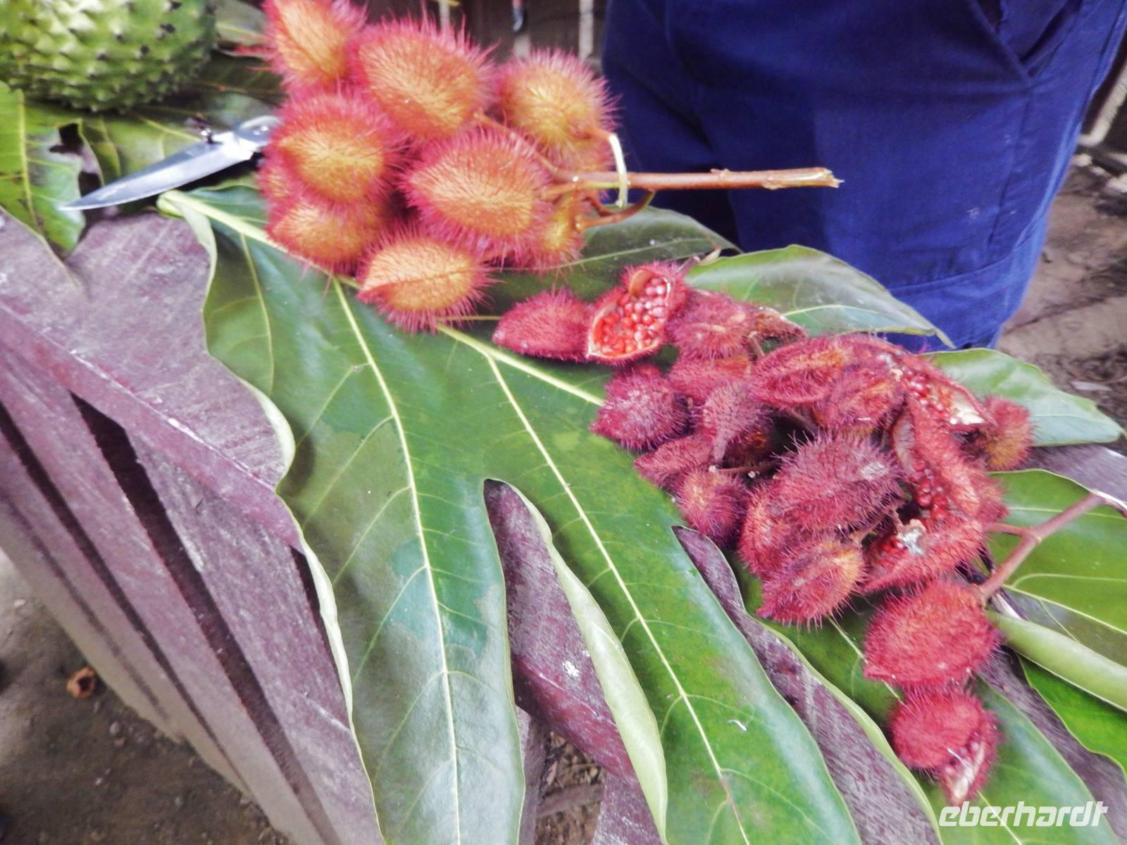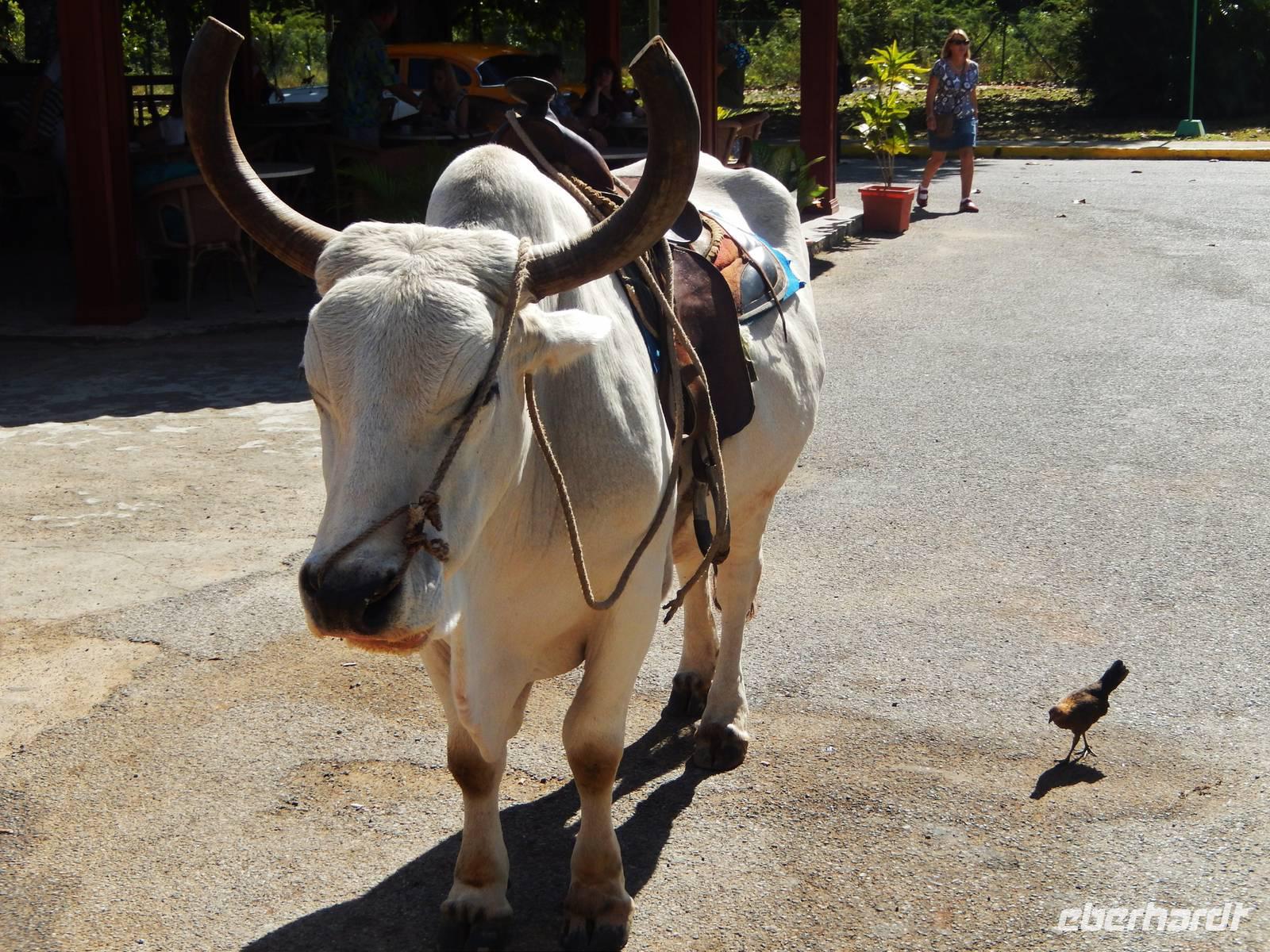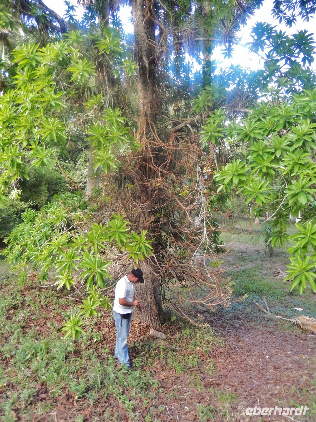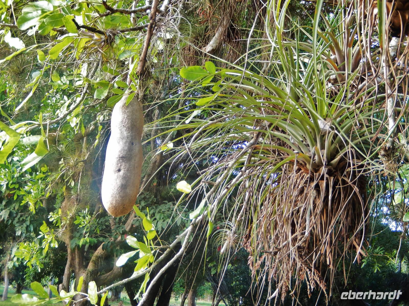 Zum Mittagessen fahren wir ins Hotel Los Caneyes, wo uns ein leckeres Buffet mit kubanischen Spezialitäten, darunter knusprig gebratenem Maniok, erwartet. Am Hotel zeigt Luis und auch einen Feuerbaum, dessen interessante, steinharte Rasselfrüchte wir mit nach Hause nehmen.