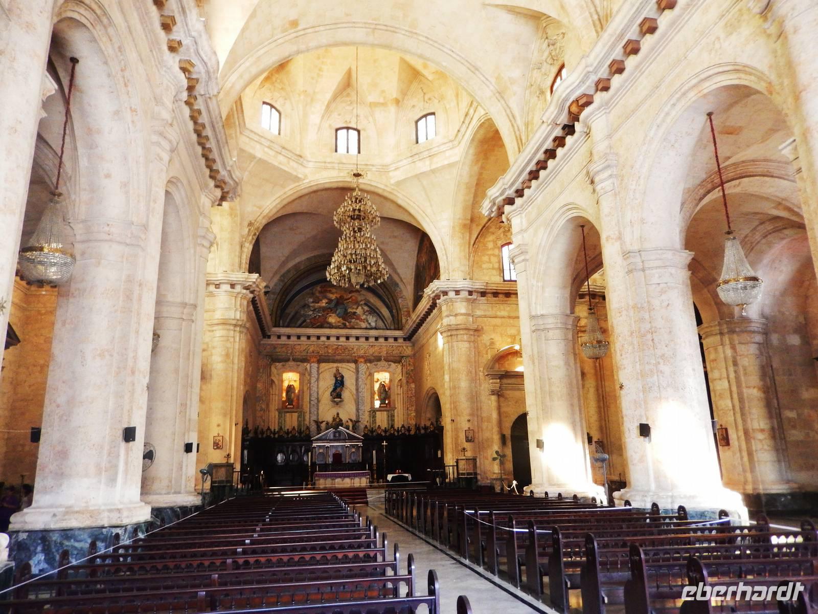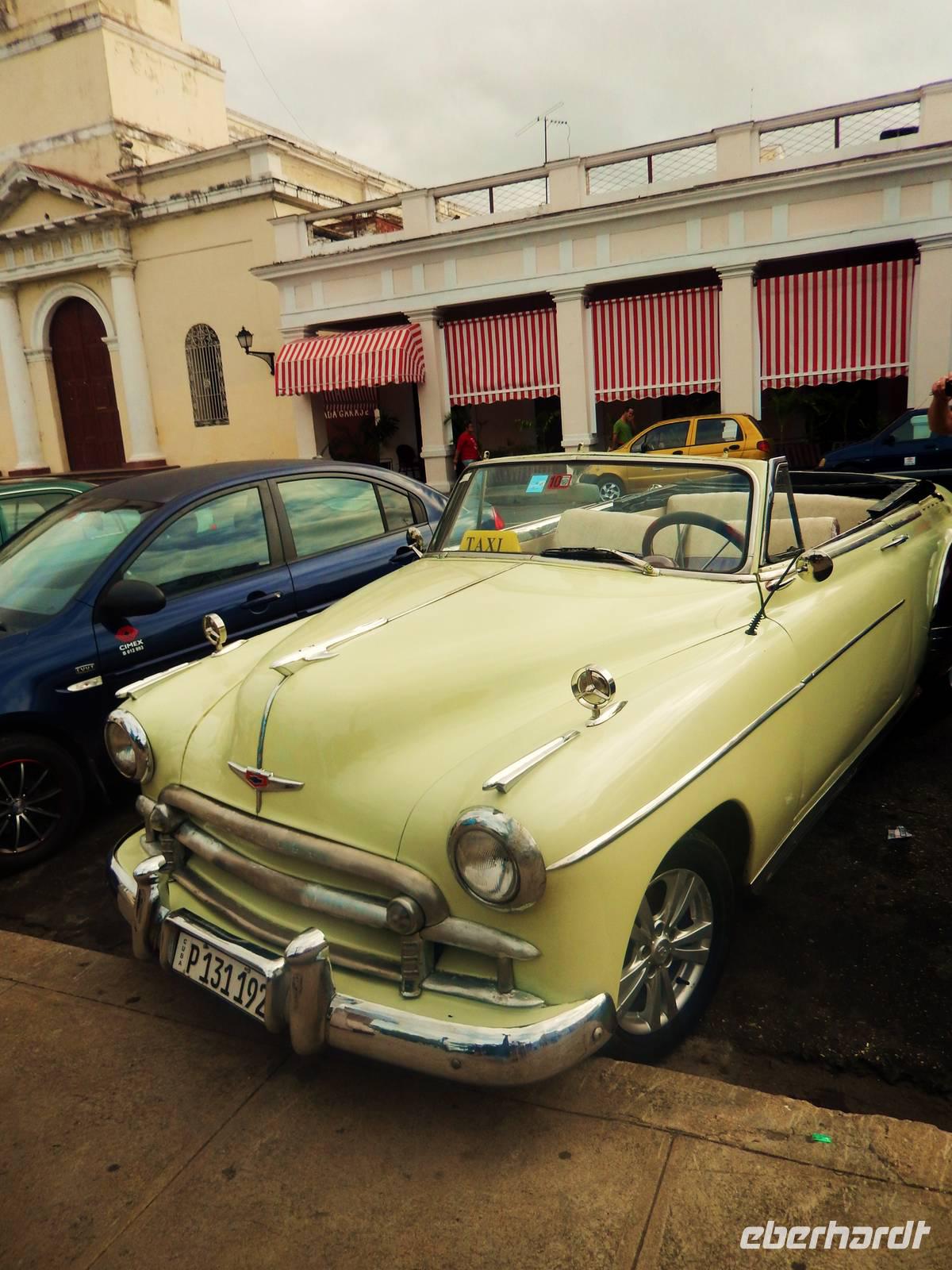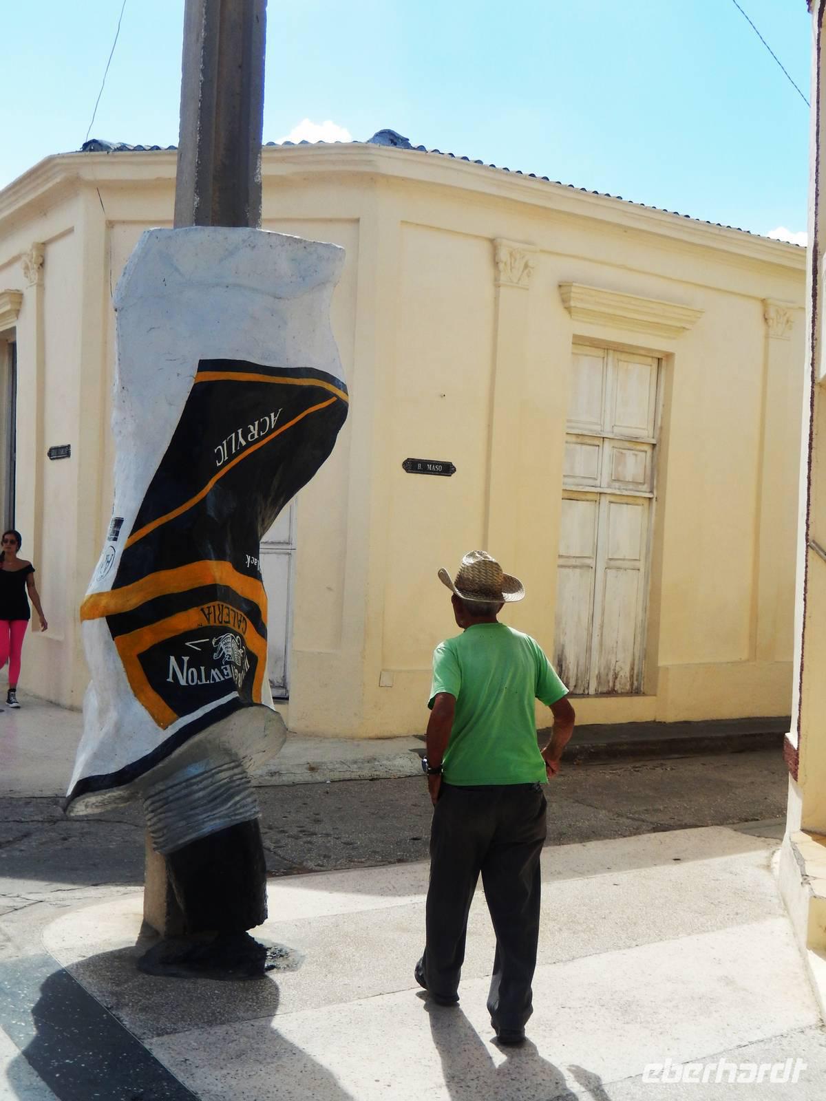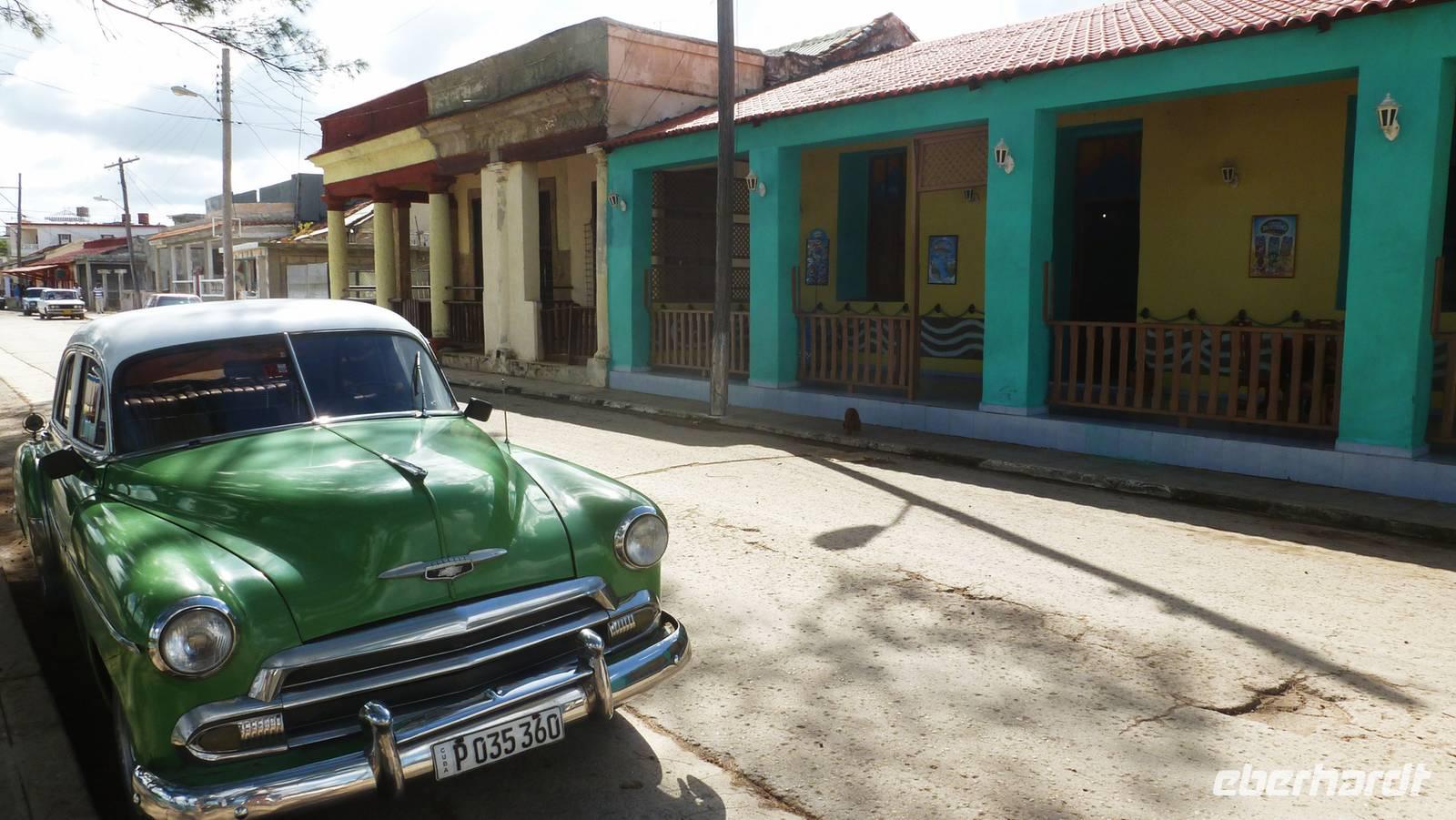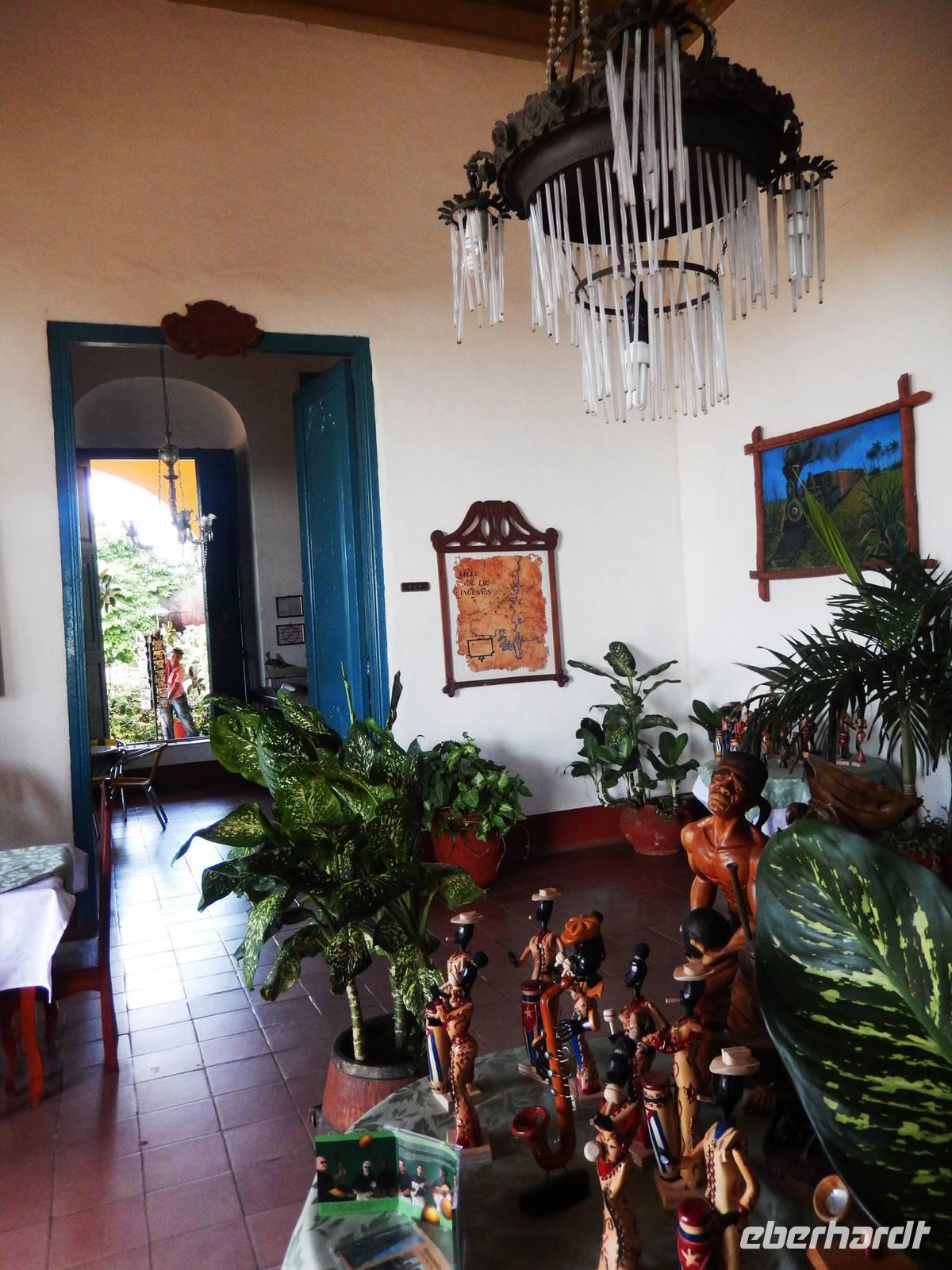 In der Innenstadt sind die wichtigsten Gebäude und Einrichtungen der Stadt rund um die Plaza Marti angeordnet. Luis zeigt uns eine Apotheke und die Kathedrale mit dem 500 Jahre altem Holzkreuz. Kolumbus hatte 29 solcher Kreuze bei seinen Landgängen erhalten. Bei diesem Kreuz handelt es sich um das einzige noch erhaltene! Pilger haben aus dem Holz Stücke herausgebrochen, somit wurden die Ecken in Silber gefasst und das Kreuz in eine Vitrine gesperrt. Anschließend begeben wir uns in unser Hotel, welches direkt im Zentrum des Städtchens liegt, und essen in einem Restaurant der Stadt zu Abend. Beim Abendessen bemerken wir heute, dass die Kubaner nicht unbedingt für ihre gute Küche berühmt sind.