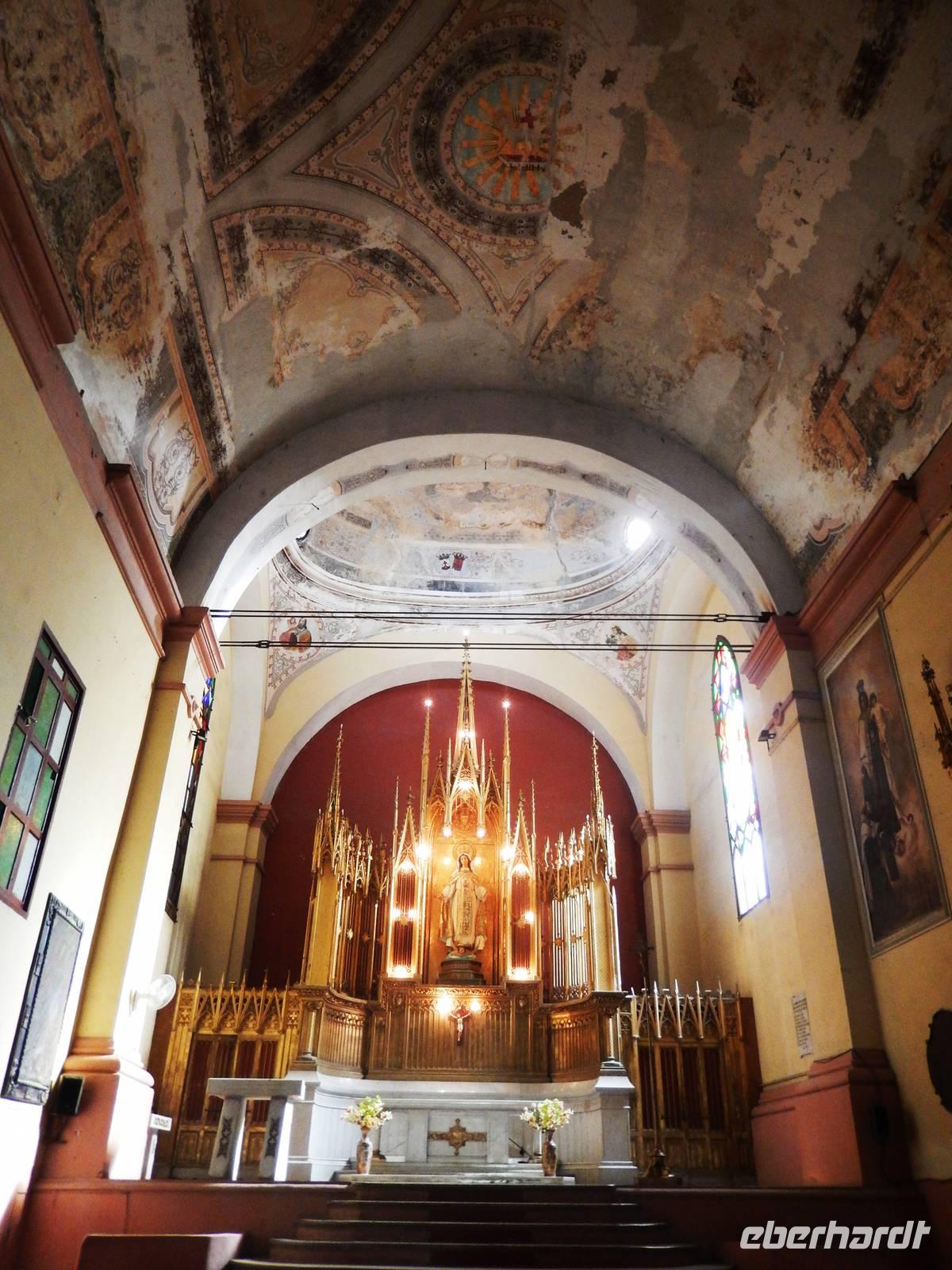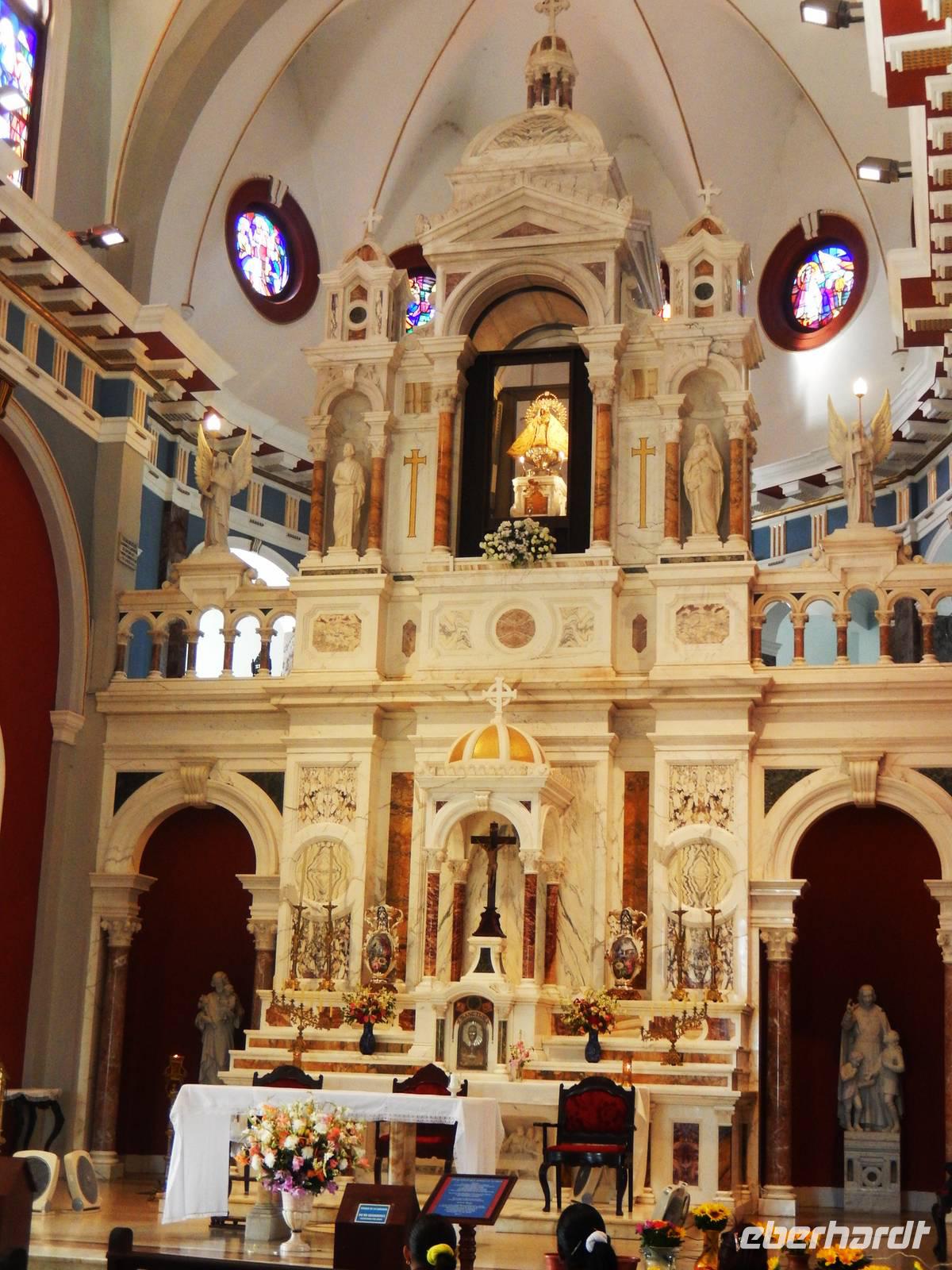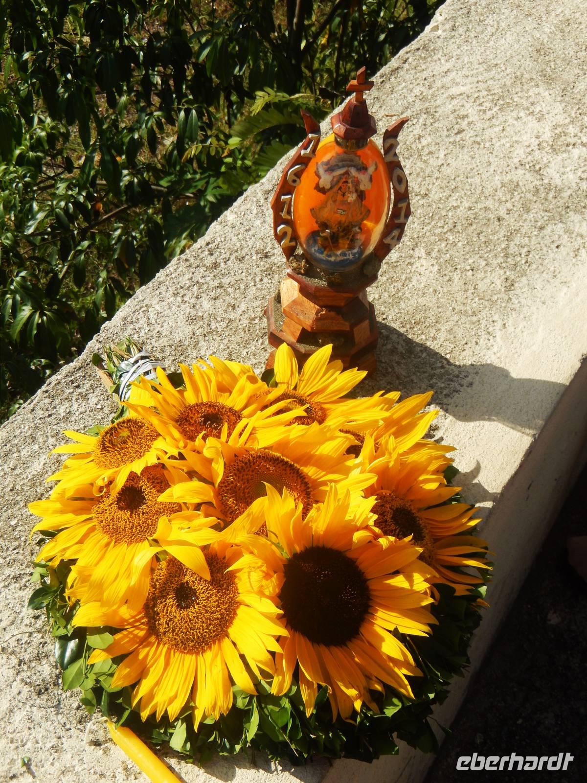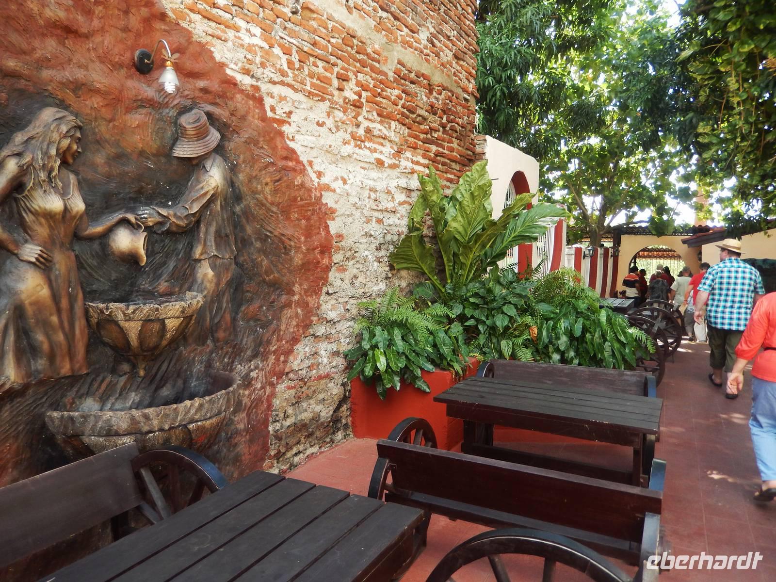 Nach einem reichhaltigen Frühstück im Casa Granda begeben wir uns erneut gestärkt auf die Reise. Heute wollen wir die berühmte Wallfahrtskirche El Cobre besichtigen. Im Jahre 1606 sollen hier drei Fischer von der heiligen Maria vor dem Ertrinken gerettet worden sein. Diese Fischer haben zum Dank eine Kapelle erbauen lassen. Der Name El Cobre (Das Kupfer) ist auf die nahegelegene Kupfermine zurückzuführen. Die damals hier arbeitenden Sklaven verehrten die Jungfrau von El Cobre besonders stark. Auf dem Weg dahin fahren wir nochmal durch die revolutionäre Stadt Santiago de Cuba. Dann erhebt sich schon vor uns vor den grünen Hängen der Sierra Maestra die schöne Kirche mit den drei gelben Türmen. Die Straßen sind voll von kubanischen Händlern, die entweder Marienstatuen oder gelbe Sonnenblumensträuße kaufen. Wir kaufen einen Strauß und verfahren nach der Tradition der afrokubanischen Kultur: jede Sonnenblumenblüte wird mit Honig beschmiert. Die Blumensträuße, die man auf Kuba den Heiligen bringt, verfügen immer über eine ungerade Anzahl an Blütenköpfen, wieder afrokubanischer Brauch. Schon erreichen wir den Wallfahrtsort und besichtigen die imposante Kirche. In Vitrinen häufen sich Abzeichen, Urkunden, Medaillien von Danksagenden. Auch viele berühmte Sportler, Schriftsteller oder Musiker haben hier Ihre Abzeichen verewigt. Die Gebete dieser Menschen sind in Erfüllung gegangen. Anschließend fahren wir über die Örtchen Palma Soriano, Contramaestre, Baire und Santa Rita weiter in die Hauptstadt der Provinz Granma, Bayamo. Die rebellische Stadt wurde durch Sklavenaufstände, Indianerkämpfe und sonstige Befreiungsaufstände bekannt. Luis führt uns durch die Einkaufsstraße der Stadt bis zum Parque Cespedes und zeigt uns tolle Skulpturen und Keramikmosaike. Außerdem werden wir endlich über den Unterschied zwischen CUC-, Peso- und Lebensmittelkartenladen aufgeklärt. Zum Mittag kehren wir in ein hübsches Terrassenrestaurant ein, wo wir in gemütlicher Runde mit einem Moijto erst einmal auf die drei Geburtstagskinder unserer Reisegruppe anstoßen. Dann gibt es Ropa Vieja, der auf Kuba fast nie ausbleibende Bohnenreis, ein Guavendessert und Cafe Mambi, die leckere Spezialität des Hauses.