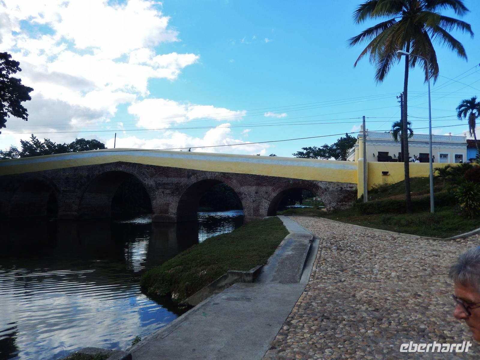 Nach einem Frühstück im fünften Stock des Hotels, auf der Aussichtsplattform, begeben wir uns auf einen Stadtrundgang durch Camagüey. Diese Stadt ist ein reinstes Labyrinth, die verwinkelten Gassen verlaufen kreuz und quer ohne jedes System. Bekannt ist Camagüey für seine riesigen Tonkrüge, die Tinajones, in denen früher Regenwasser aufbewahrt wurde. Diese finden wir auch im Stadtmuseum Ignacio Agramonte, in dem wir eine kleine Führung unternehmen und zahlreiche Dokumente aus den Unabhängigkeitskriegen sehen. Anschließend folgt der Höhepunkt des Tages: eine Rundfahrt auf Bici Taxis. Schnell organisiert Luis sechs Fahrradtaxis auf denen wir je zu zwei durch die Stadt geradelt werden. Das Orientierungs- und Ausweichvermögen der Taxifahrer in Camagüey ist mir dabei immer noch unbegreiflich. Wir legen drei Stopps an diesem Vormittag ein und verstehen jetzt auch, warum Camagüey als Stadt der meisten Kirchen auf Kuba bekannt ist. Die Stadt ist ein wahres Paradies an Sehenswürdigkeiten und tollen Kolonialbauten. Nach diesem tollen Erlebnis verabschieden wir uns von unseren Fahrradfahrern und fahren weiter nach Sancti Spiritus. Nach Passieren der Städtchen Florida und El Centro, halten wir noch zur täglichen Mojitopause, heute in einer hübschen Anlage bei Ciego de Avila. Hier gibt es leckere Pina Colada aus Naturzutaten, ein echter Geheimtipp! Auf der Weiterfahrt erklärt uns Luis das Gesundheitssystem der Kubaner. Jeder Kubaner hat seinen Familienarzt, wird von diesem nach seinem Gesundheitszustand in vier bestehende Kategorien eingeteilt und bekommt Medikamente, Untersuchungen, OPs etc. alles kostenlos. Aufgrund des guten Gesundheitssystems und den hervorragenden Fachkräften wurden viele kubanische Ärzte nach Afrika, zur Bekämpfung von Ebola entsandt. Nach einem leckeren Mittagsmenü und einem Sangria am Hauptplatz von Sancti Spiritus beziehen wir unser heutiges Hotel Encanto Rijo. Dieses besticht durch Gemütlichkeit und nette Details, hier fühlen wir uns sofort wohl. Anschließend unternehmen wir mit Luis noch einen Rundgang durch die Stadt. Wir besuchen die älteste Kirche von Kuba und begeben uns auf der Kopfsteinplasterstraße zur einzigen Steinbogenbrücke im Land, zum Puente Yayabo.