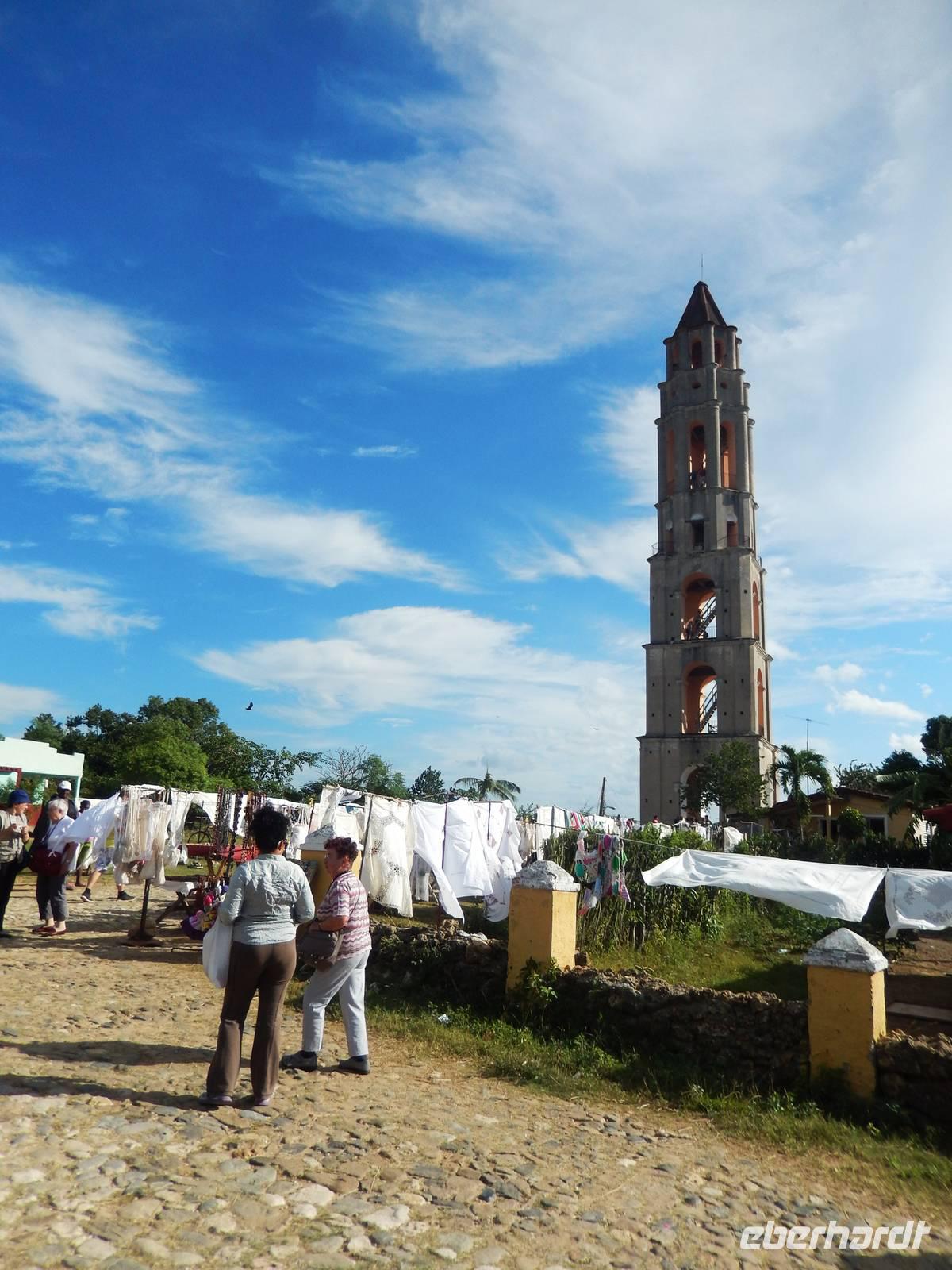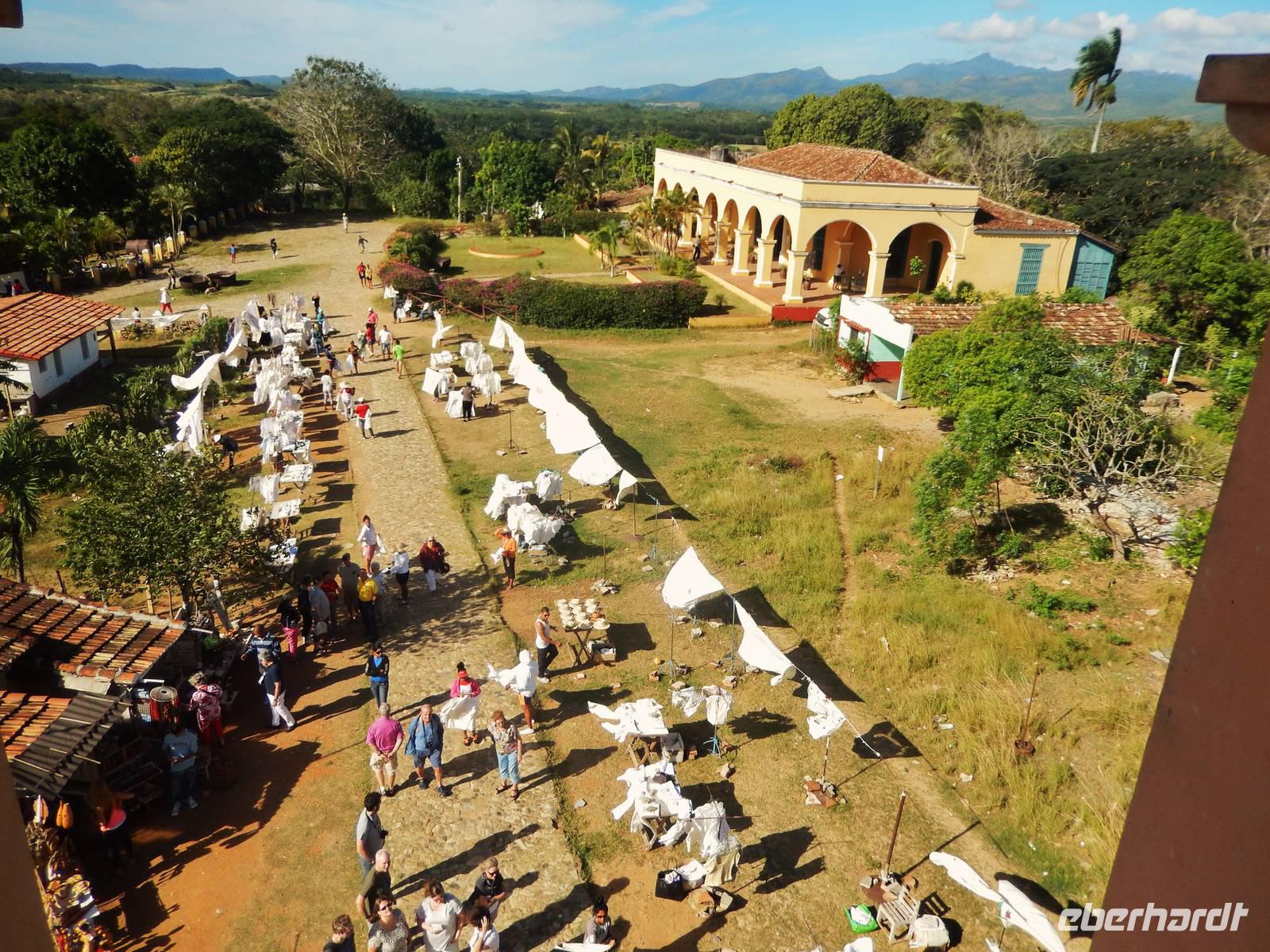 Heute fahren wir nach Trinidad, welches sich mit seiner bunter Kolonialpracht hinter der Gebirgskette der Sierra Escambray versteckt. Wir passieren einen Ort namens Rio Bauno, welcher für seinen Friedhof voller Kunstblumen bekannt ist. Auf der Fahrt sehen wir den Pico de San Juan, der mit seinen 1140 Metern der höchste Gipfel Kubas ist. In der Sierra Escambray fanden zu Revolutionszeiten viele Kämpfe statt, die bekannten Guerillenkriege. Luis erklärt uns die hier zu sehenden verschiedenen Palmen. Von Igelpalmen, über Fächer- und Kokosnusspalmen bis hin zu den majestätischen Königspalmen ist hier alles zu finden. Dann erreichen wir schon das Dorf Managas Iznaga, aus dessen Mitte der charakteristische 50 Meter Hohe Torre de Iznaga Turm ragt. Rund um dieses Dorf befand sich im 19. Jahrhundert die größte Zuckerrohrplantage, welche der Familie Iznaga gehörte. Um den Turm rankt sich eine Legende von zwei Brüdern die um die Liebe einer schönen Frau streiten. Luis führt uns durch das Haus des Zuckerbarons und erklärt die Zuckerrohrherstellung. Anschließend besteigen wir den 7-stöckigen Turm und genießen oben eine traumhafte Aussicht über das Zuckerrohrmühlental.