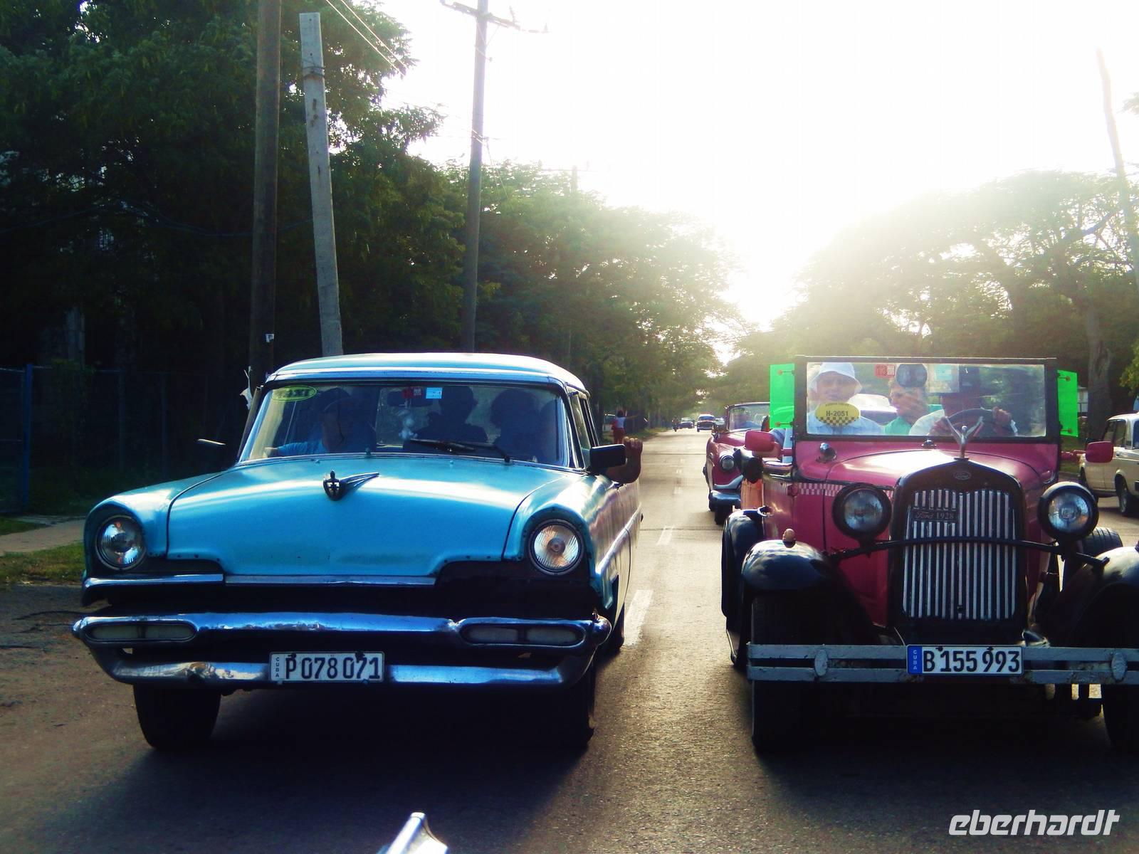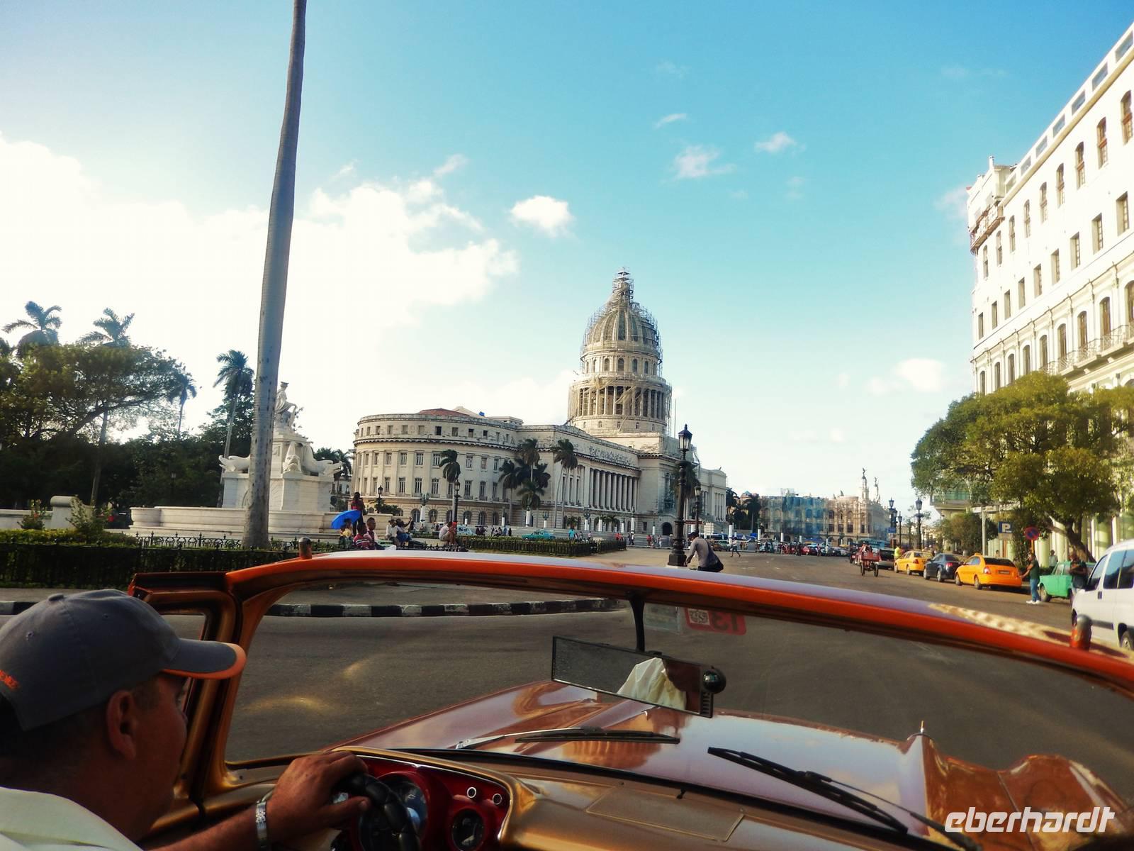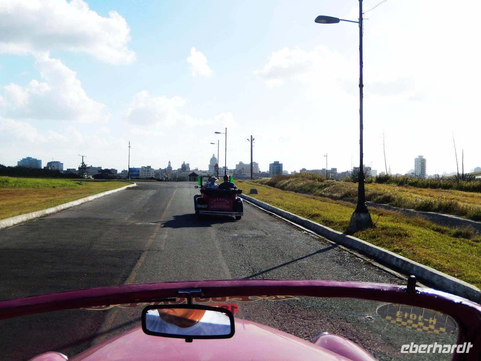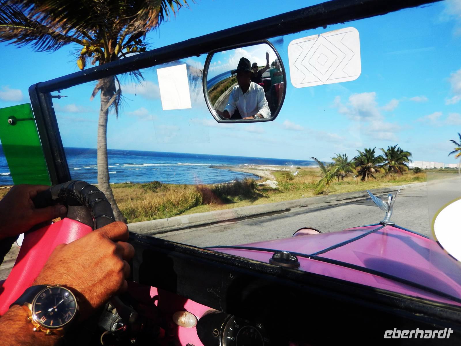 Anschließend erreichen wir Havanna, welche uns mit Ihrer Kolonialpracht bei besten Wetter begrüßt. Wir kehren in ein tolles Restaurant in Havannas Altstadt ein und genießen leckere Languste und Mojitos bei Live Musik mit Buena Vista Social Club Songs. Später begeben wir uns gestärkt auf einen kleinen Stadtrundgang durch Havanna Vieja. Um uns düsen die berüchtigten Coco- und Bici-Taxis und die schönsten Oldtimer. An den Straßen sitzen Afrokubanerinnen und nuckeln an riesigen Zigarren oder preisen lauthals ihre Wahrsagerkünste an. Zunächst inspizieren wir die Plaza de Armas (Armeeplatz) mit dem Stadtmuseum, der Columbus-Statue, dem großen Antiquitätenmarkt und dem berühmten, alten Ceibo-Baum. Dieser spielt hier am 16.11. jedes Jahr eine große Rolle. Es ist der Gründungstag Havannas (1519). Die Havaneros pilgern an diesem Tage traditionell um den Ceibo-Baum. Auf dem Weiterweg sehen wir Reste von Havannas Steinmauer und ein riesiges Bildnis aus Natursand, welches bekannte Persönlichkeiten der Kolonialzeit darstellt. Zu Fuß begeben wir uns zu Havannas Hafengelände, wo Luis uns drei farbenfrohe Oldtimer (Baujahr Mitte 19. Jahrhundert) besorgt. Nun begeben wir uns auf eine Spritztour durch ganz Havanna, lassen die Atmosphäre der Stadt auf uns wirken und uns den Wind um die Ohren pfeifen.