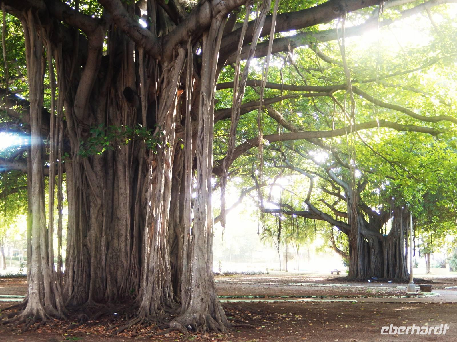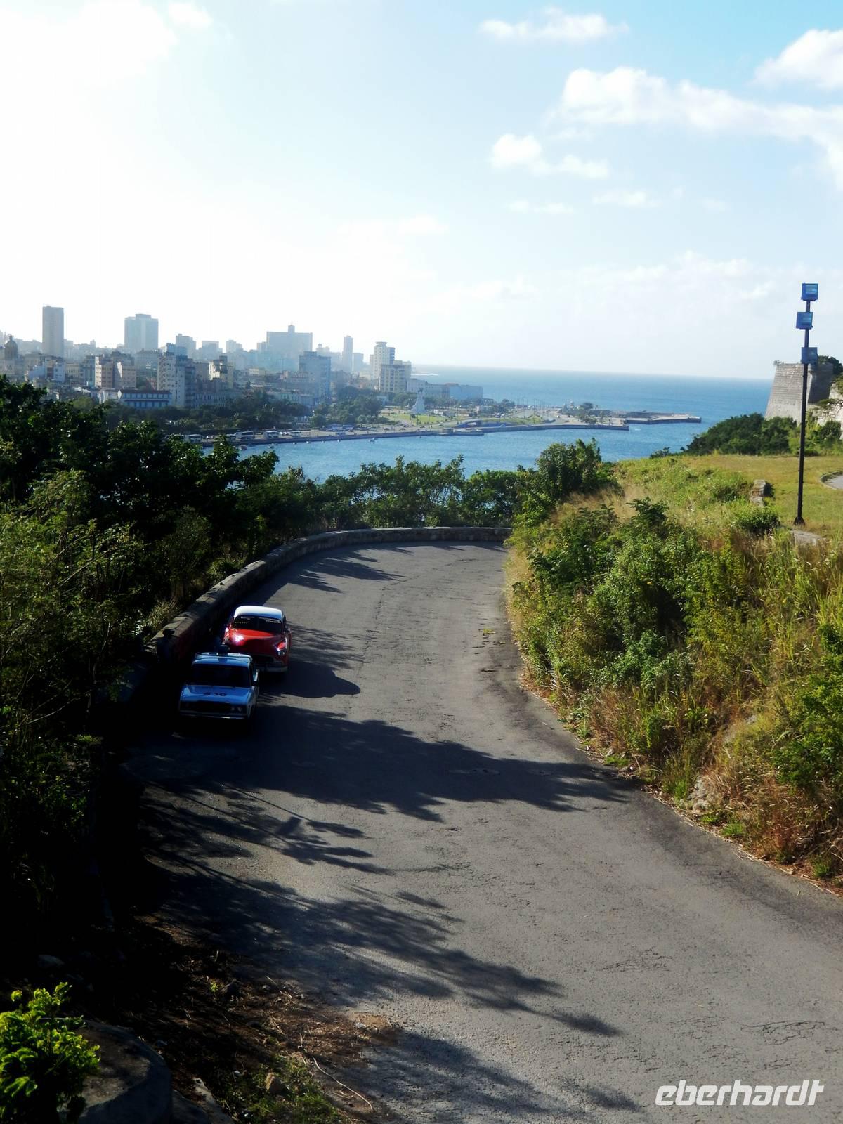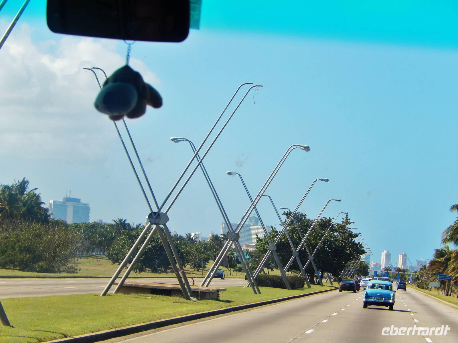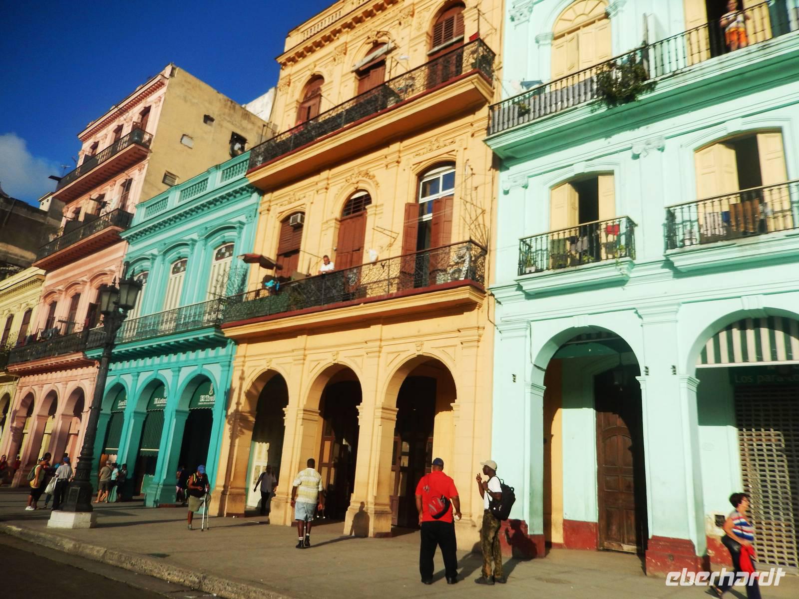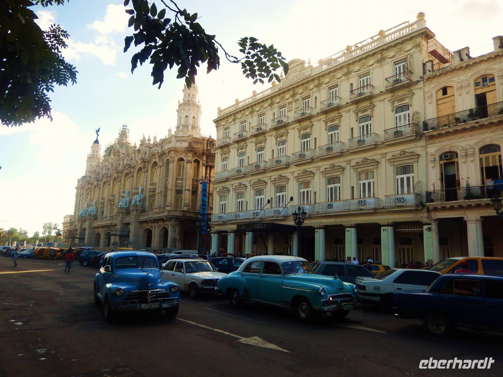 Anschließend erreichen wir Havanna, welche uns mit Ihrer Kolonialpracht bei besten Wetter begrüßt. Wir kehren in ein tolles Restaurant in Havannas Altstadt ein und genießen leckere Languste und Mojitos bei Live Musik mit Buena Vista Social Club Songs. Später begeben wir uns gestärkt auf einen kleinen Stadtrundgang durch Havanna Vieja. Um uns düsen die berüchtigten Coco- und Bici-Taxis und die schönsten Oldtimer. An den Straßen sitzen Afrokubanerinnen und nuckeln an riesigen Zigarren oder preisen lauthals ihre Wahrsagerkünste an. Zunächst inspizieren wir die Plaza de Armas (Armeeplatz) mit dem Stadtmuseum, der Columbus-Statue, dem großen Antiquitätenmarkt und dem berühmten, alten Ceibo-Baum. Dieser spielt hier am 16.11. jedes Jahr eine große Rolle. Es ist der Gründungstag Havannas (1519). Die Havaneros pilgern an diesem Tage traditionell um den Ceibo-Baum. Auf dem Weiterweg sehen wir Reste von Havannas Steinmauer und ein riesiges Bildnis aus Natursand, welches bekannte Persönlichkeiten der Kolonialzeit darstellt. Zu Fuß begeben wir uns zu Havannas Hafengelände, wo Luis uns drei farbenfrohe Oldtimer (Baujahr Mitte 19. Jahrhundert) besorgt. Nun begeben wir uns auf eine Spritztour durch ganz Havanna, lassen die Atmosphäre der Stadt auf uns wirken und uns den Wind um die Ohren pfeifen.