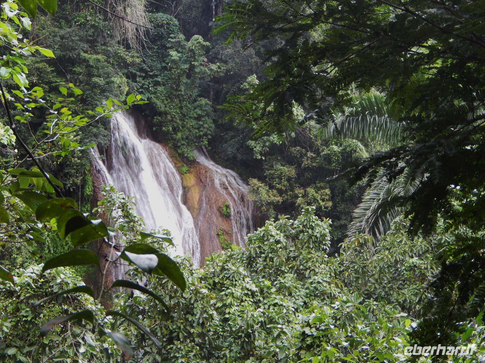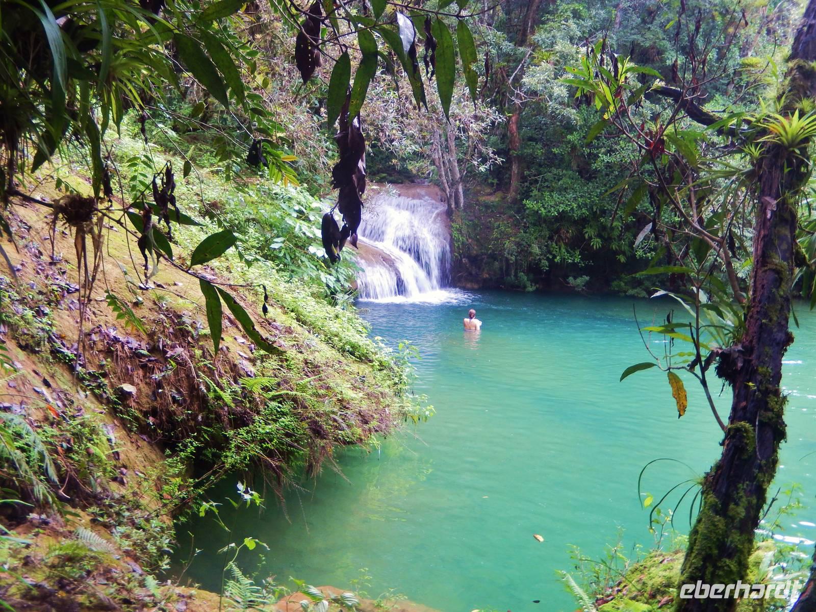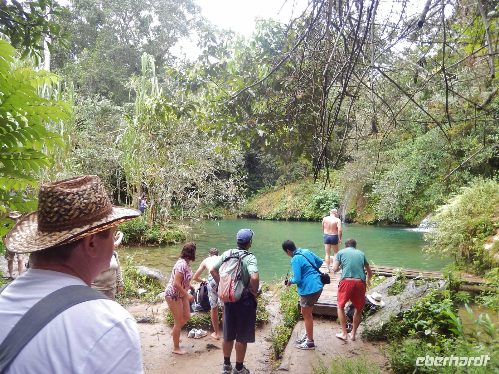 Am Tag zuvor wurden wir darauf hingewiesen uns heute warm anzuziehen, was wir bei dem morgentlichen Traumwetter an der Playa Ancon zunächst nicht begreifen wollten. Doch dies verstehen wir bald nur zu gut. An einer Haltestelle stehen für uns originelle, russische Lastwagen bereit, welche uns auf eine abenteuerliche und ziemlich wilde Fahrt quer durch das Escambray Gebirge mit seinen unzähligen Serpentinen nehmen. Wind und später auch Regen peitschen uns ins Gesicht, hier oben in den Bergen ist es plötzlich sehr frisch! In einem Bergdorf holen wir unsere Wanderführerin ab und dann geht es wider Erwarten auf dem Lastwagen weiter und noch tiefer hinein in das grüne, wild wuchernde Paradies. Wir sehen Bambusfelder, schönste Orchideen und kilometerlang undurchdringlichen Regenwald. Endlich halten wir am Nationalpark Guanayara, ungefähr 15 Kilometer von Topes de Collantes entfernt. Unsere Wanderführerin erklärt uns kurz die Besichtigungspunkte auf unserer drei Kilometer langen Wanderstrecke quer durch den tropischen Regenwald. Es nieselt manchmal und ist ziemlich frisch, doch wir fühlen uns eingelullt vom Urwald trotz dessen wohl und lassen und von dieser ganz anderen Vegetationszone faszinieren. Zunächst passieren wir an einer Kakaoplantage und lernen über die Verarbeitung und den Anbau von Kakao. Dann geht es weiter durch den Wald, vorbei an Mandelbäumen und klettenverhangenen meterhohen Bäumen bis wir schließlich an den den schönen, in dünnen Fäden herabfallenden Wasserfall Salto el Rocio gelangen. Ein toller Fotostopp! Weiter geht es über Stock und Stein, schlammigen roten Lehmboden und über kleine Kletterpassagen tiefer durch den Regenwald. Wir halten an der Lagune El Venado, wo die ganz Mutigen unter uns ein kühles Bad bei Regen nehmen. Am Ende unserer Wanderung erwartet uns das Restaurant Casa de la Gallega, ein ehemaliges galizisches Einwandererhaus. Hier genießen wir gut geschützt vom Regen, umgeben von Regenwald und schönen kräftigen, bunten Blumen, Hähnchen mit Gemüse und Reis.
