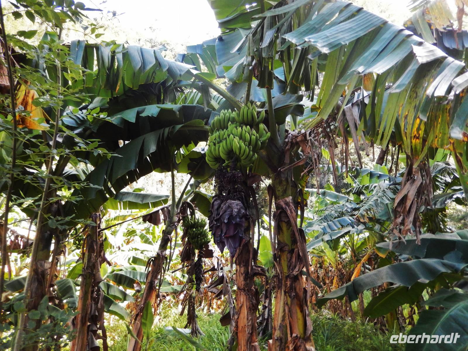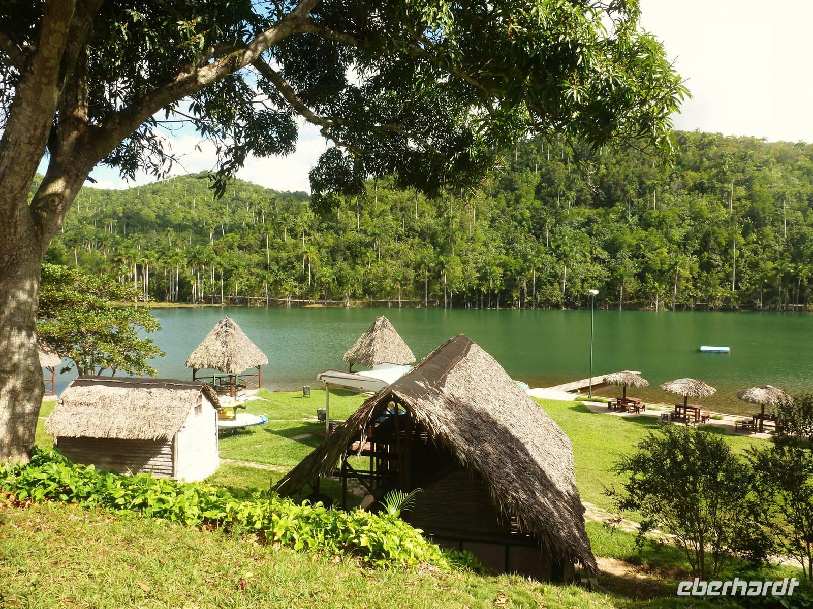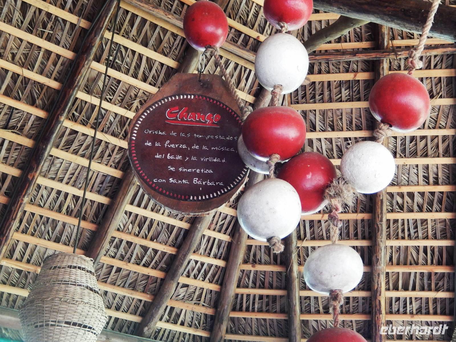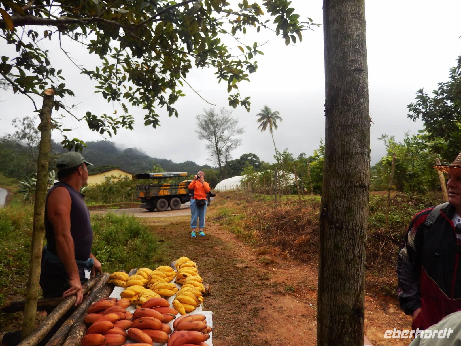 Anschließend geht es zum Mittagessen in die kleinen schilfbedeckten Hütten des Restaurants El Palenque de los Cimarrones. Das ehemalige Dorf geflüchteter Sklaven liegt neben der Höhle Cueva de San Miguel. Wir werden verwöhnt mit leckeren Schweinefleisch, Tomatenreis, knusprig frittiertem Malanga und typischen Guavendessert mit Käse. Zum Trinken gibt es hier etwas ganz besonderes, ein Liebestrank namens Chango. In der kleinen Bananenplantage nebenan erklärt uns Luis noch, warum die Banane krumm ist.