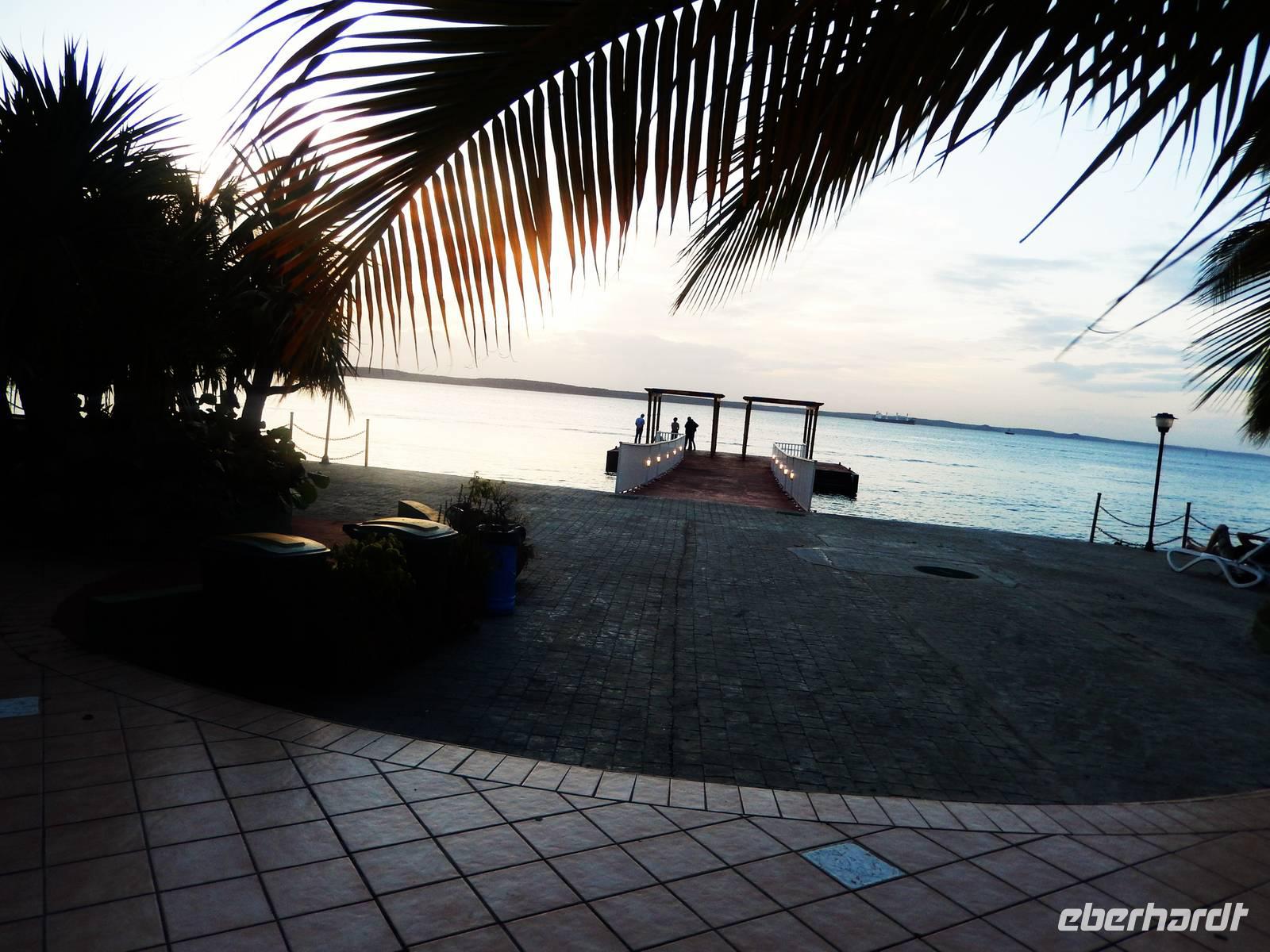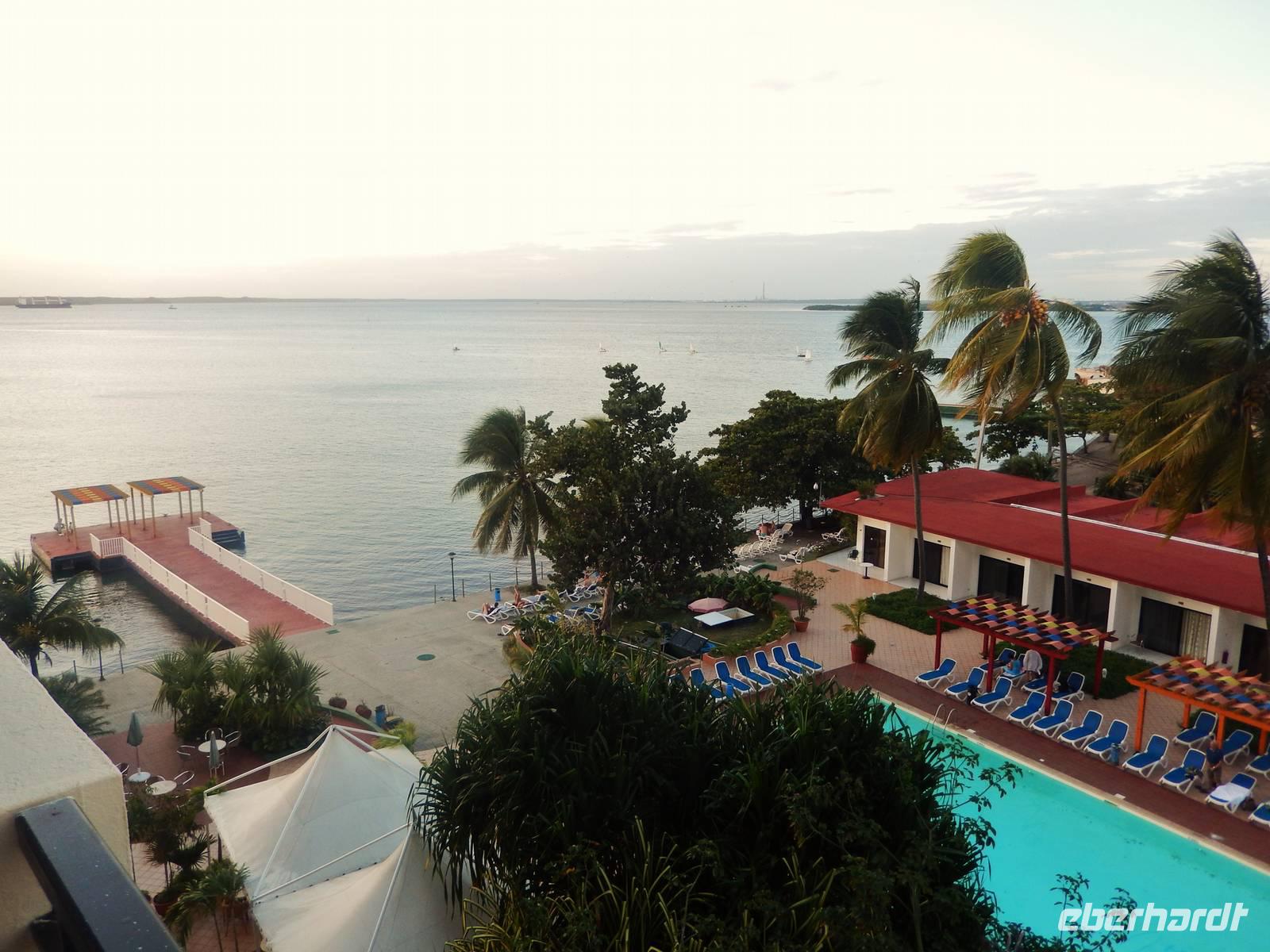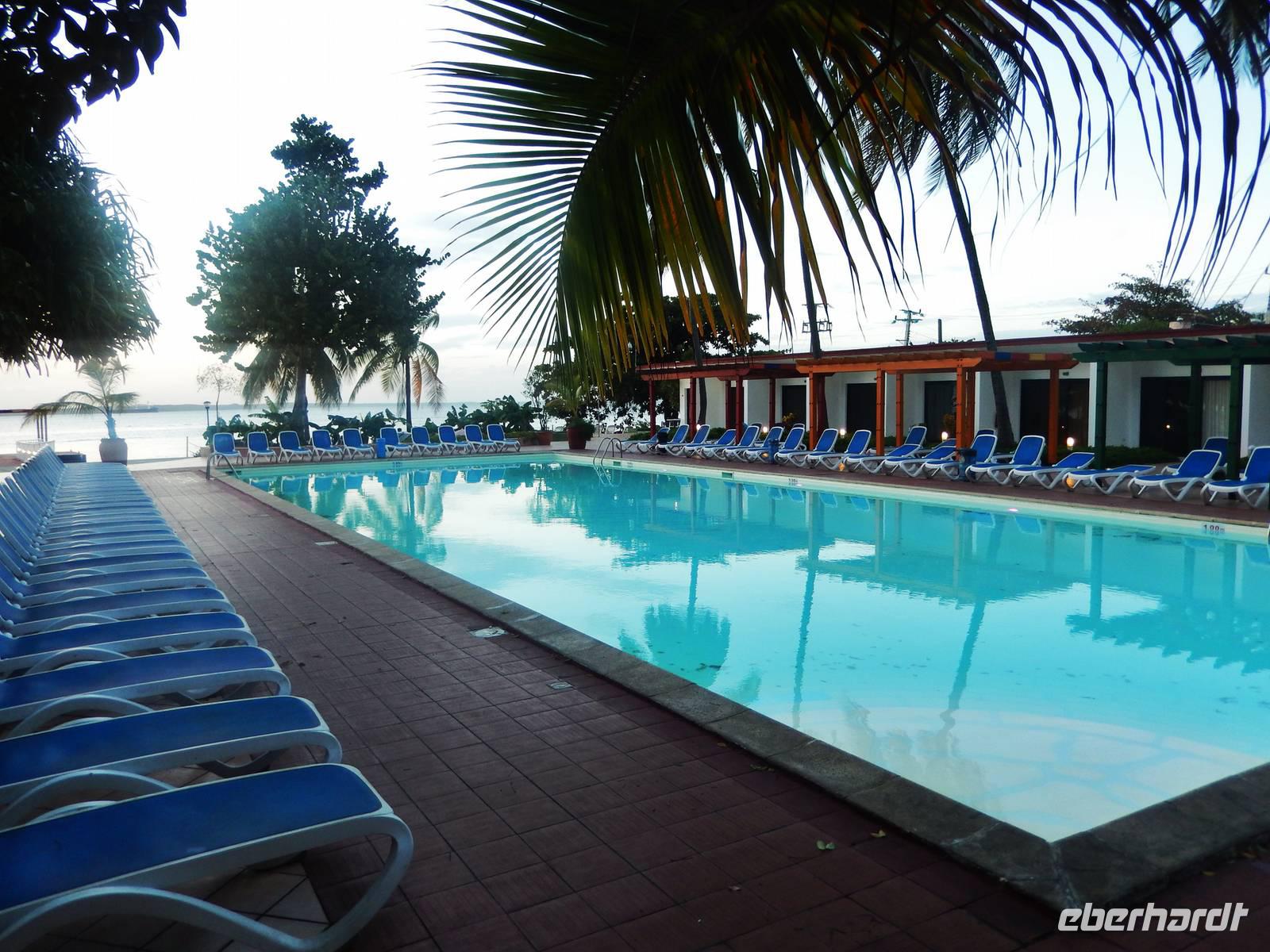Wir sind alle recht müde von der ungewohnten Hitze und der kurzen Nacht. Somit fahren wir nach dem Mittagessen in unser heutiges fünf Sterne Hotel Melia Santiago am Rande von Santiago de Cuba. Das Hotel verfügt über eine schöne Poollandschaft und eine Panoramaaussichtsplattform auf der 15. Etage. Wir legen uns am Nachmittag schlafen oder entspannen am Pool bei einem Cocktail.Um 19.00 Uhr treffen wir uns wieder mit Luis und Che Lenin, die uns ins Zentrum zum Restaurant des Hotels Casa Granda fahren. Auf der Panoramaterrasse des Hotel lassen wir den Tag ausklingen. Zurück im Hotel Melia zieht es einige von uns noch in die Bar im 15. Stock, wo wir noch eine Tanzshow in bunten Kostümen erleben dürfen.