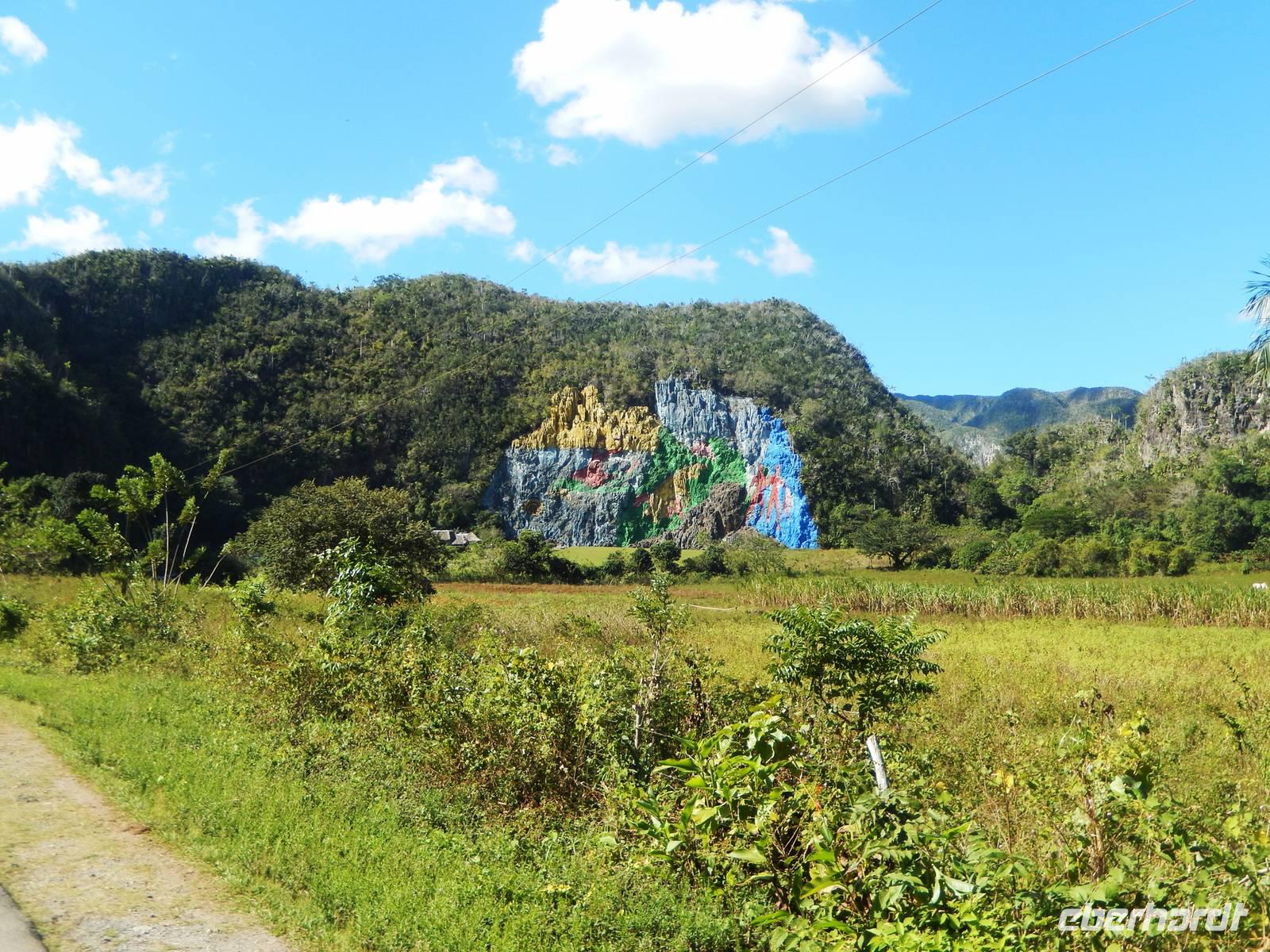 Schon geht es weiter ins schöne Vinales-Tal. An einem Aussichtspunkt halten wir zu einem Fotostopp, denn hier hat man einen wunderbaren Blick auf die vielfotografierten Kegelkarstfelsen, die Mogotes. Auf der Weiterfahrt hat Luis noch einen Überraschungsstopp für uns geplant: den Besuch einer Schule. Wir suchen schnell kleine Geschenke für die Kinder zusammen (Süßigkeiten sollte man nicht schenken!) und dürfen dann in ein authentisches, kleines Klassenzimmer schauen, aus dem uns die kleine Pioniere mit großen Augen mustern. Auf dem Weg zu unserem heutigen Restaurant passieren wir noch an einer besonderen Stelle, dem Mural de la Prehistoria. Die 120 Meter lange und 80 Meter hohen bunten Felswandgemälde sind von Leovigildo Gonzalez erschaffen werden und stellen die Evolution dar.