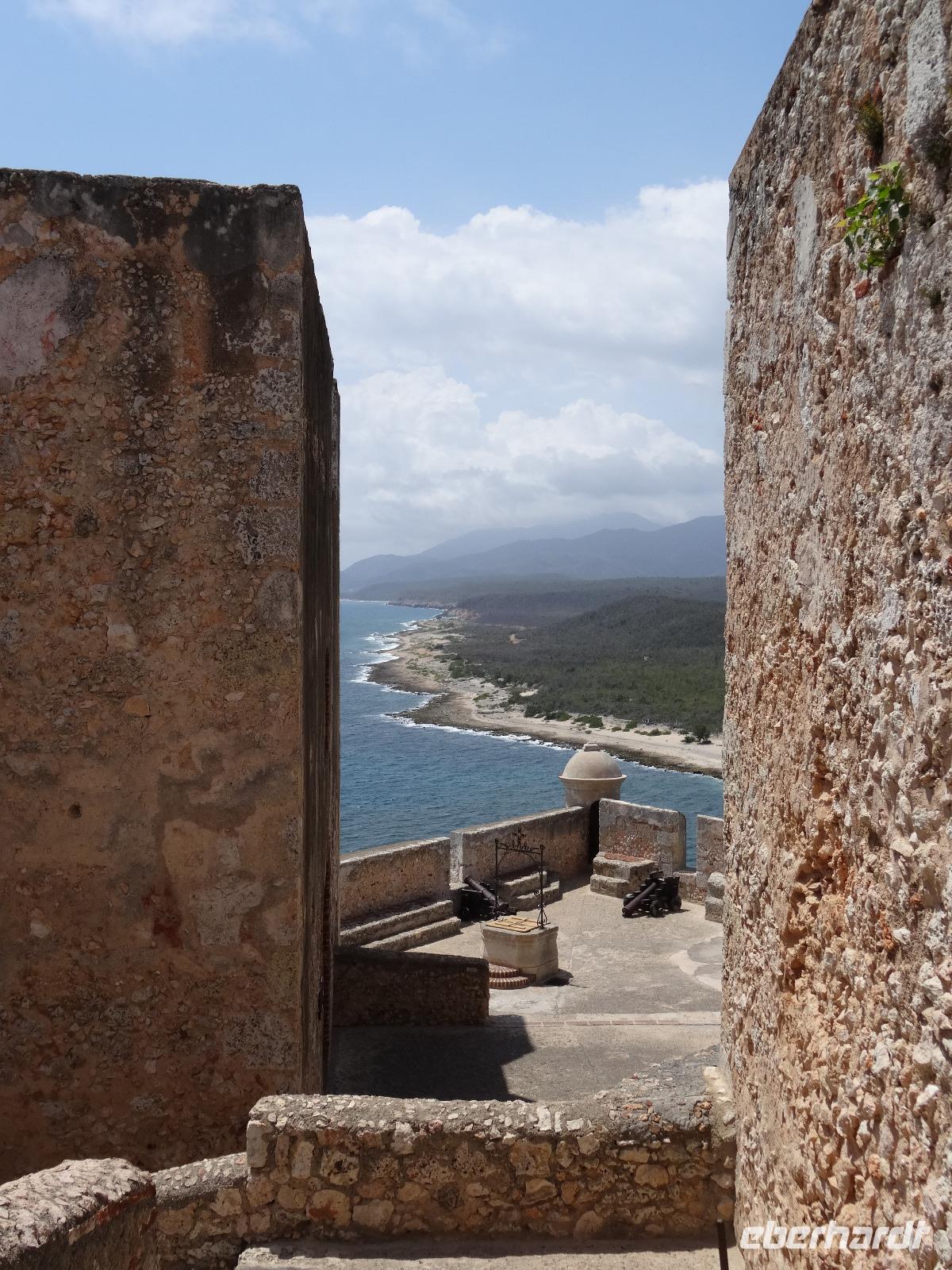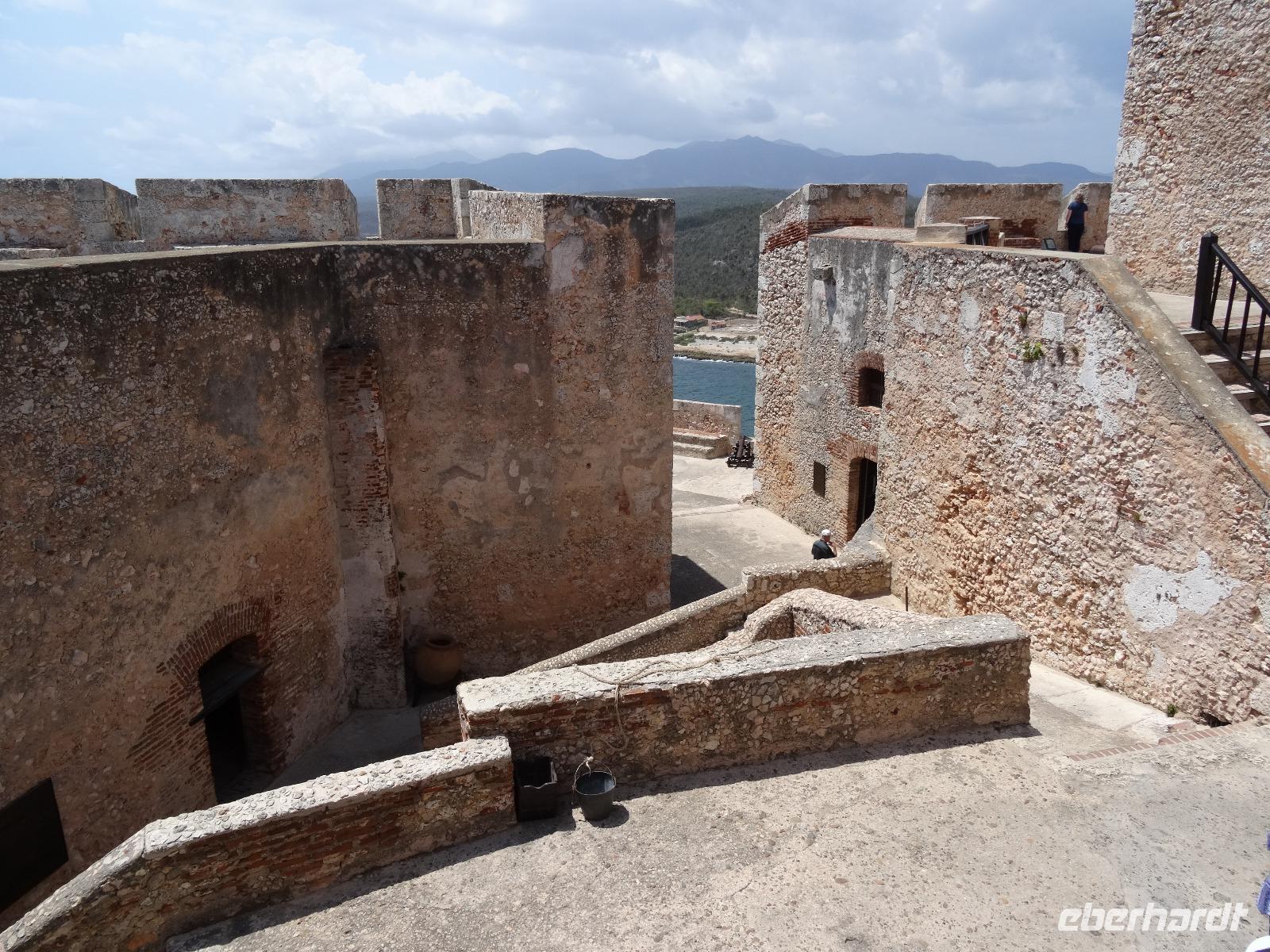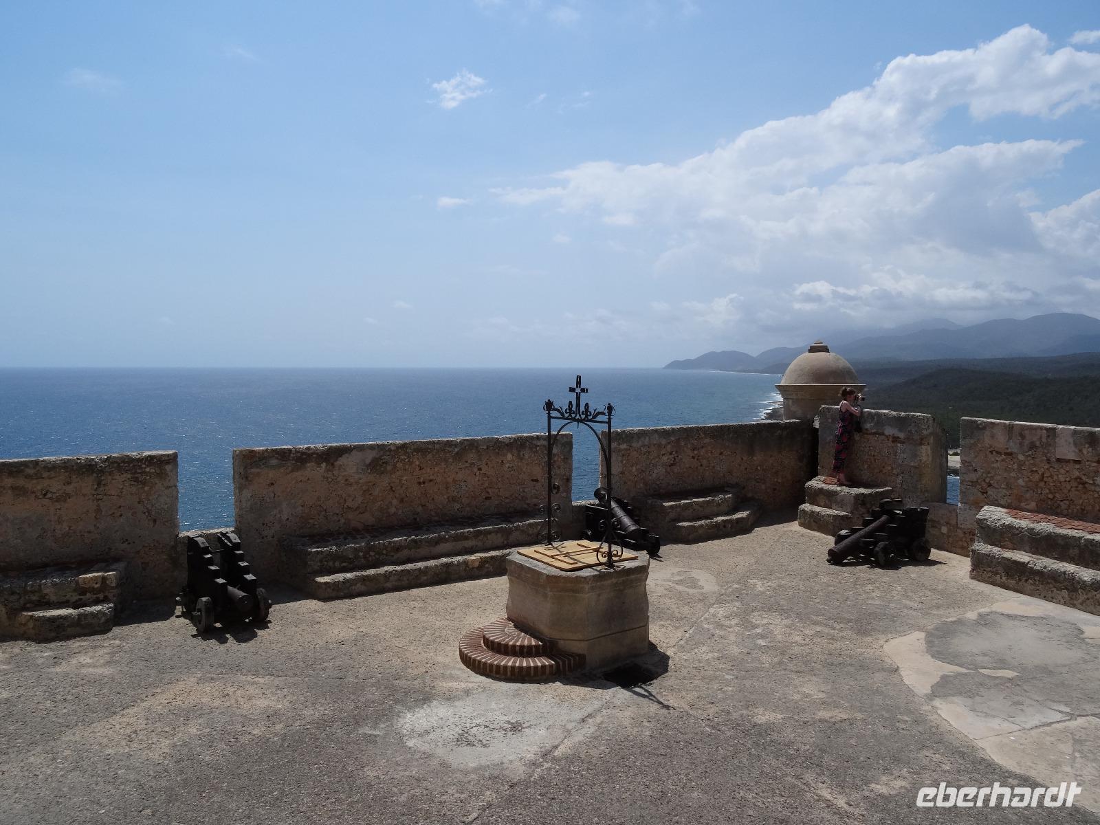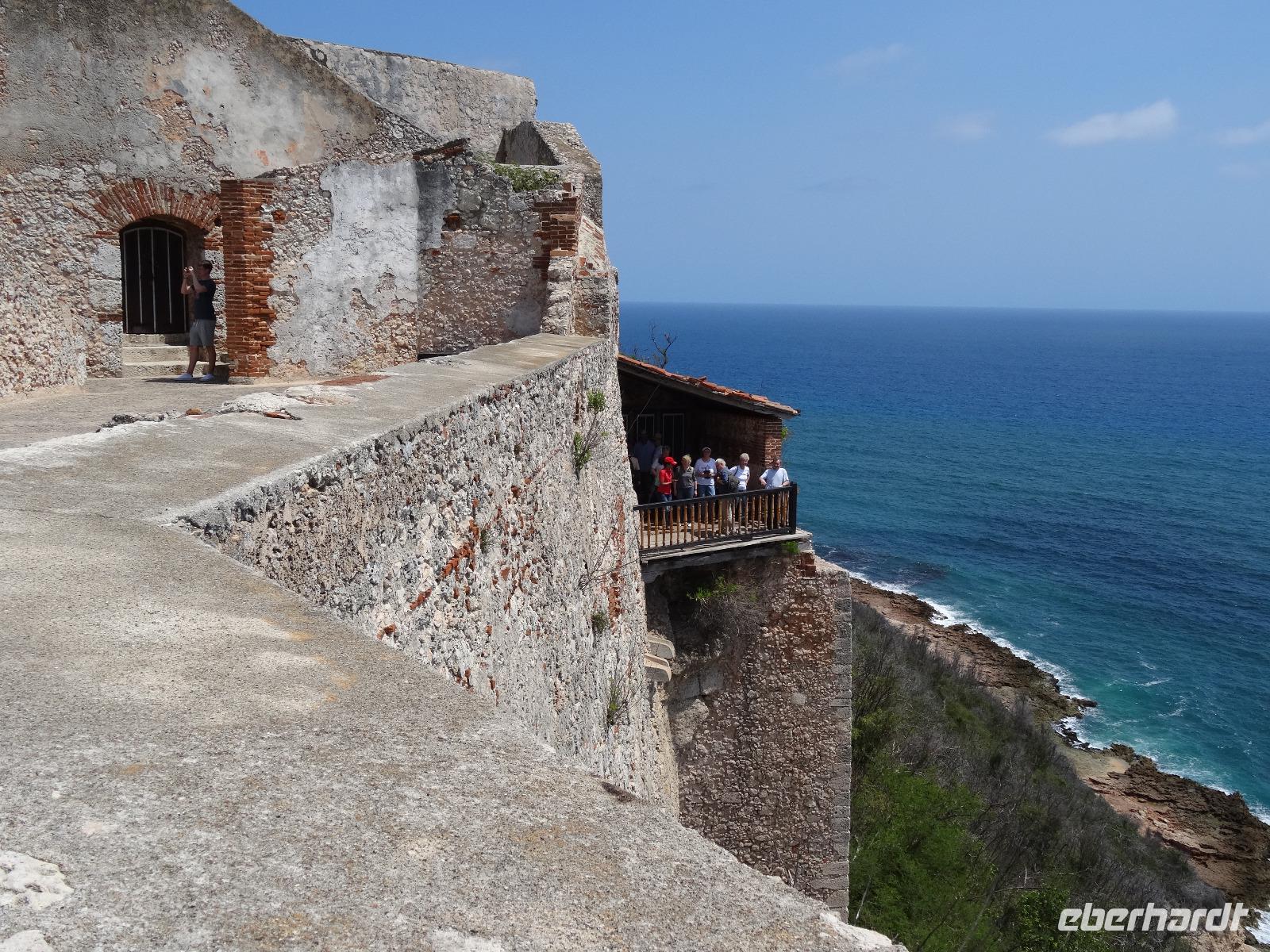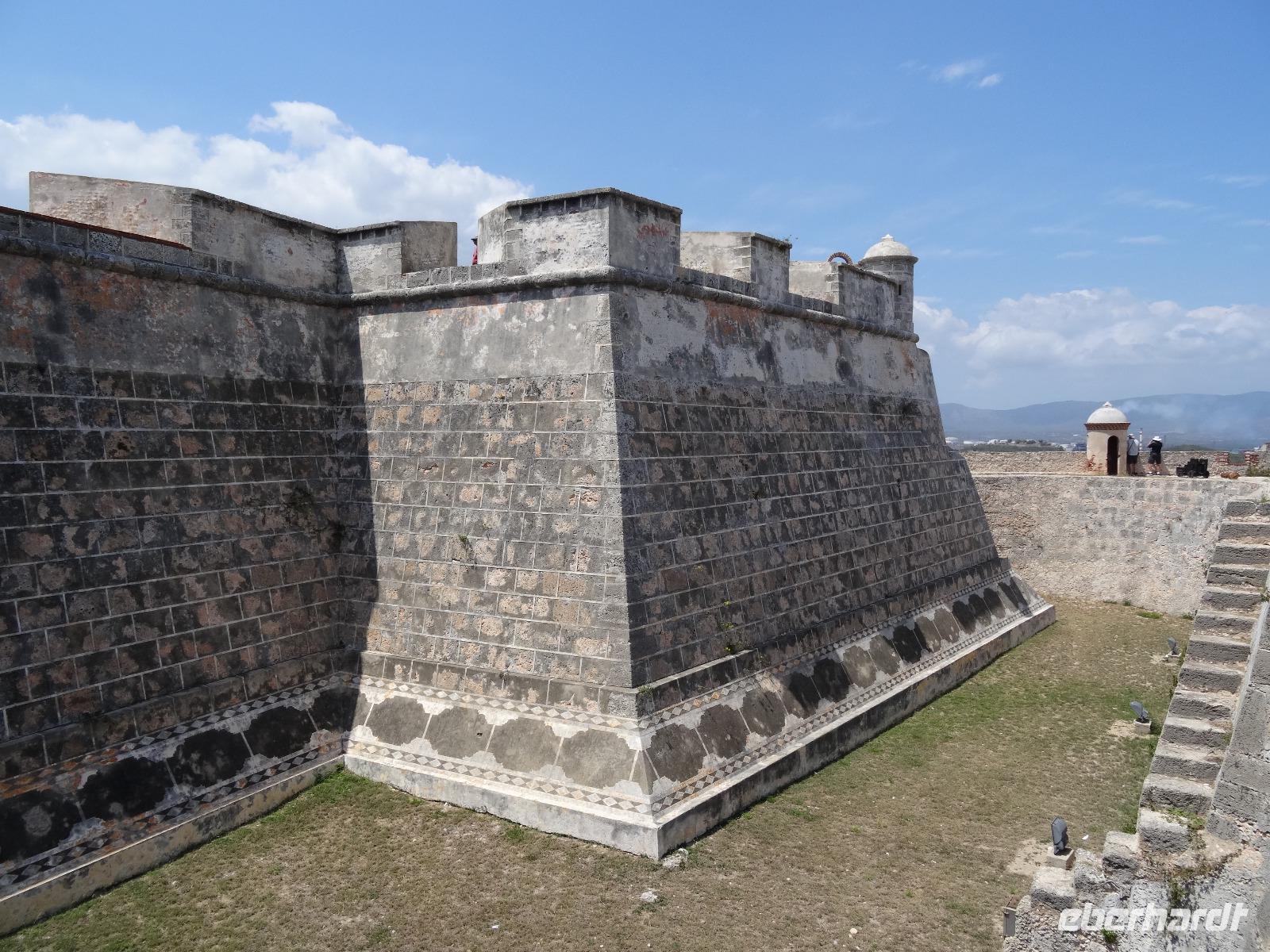 Nach dieser kleinen Odyssee wurden wir gegen Mittag endlich in Santiago de Cuba von unserem Busfahrer Rolando herzlich begrüßt. Er würde uns zusammen mit unserer Reiseleiterin Marvileivis sein Kuba zeigen und uns in den nächsten vierzehn Tagen die Schönheiten dieser Insel näher bringen. Um uns von den Strapazen der Anreise etwas zu erholen, begannen wir unsere Rundreise mit einem Mittagessen in dem Inselrestaurant El Cayo Grandma, wohin wir mit einem kleinen Boot übersetzten. Derart gestärkt, trotzten wir unserer Müdigkeit und besichtigten die im 17. Jahrhundert zum Schutz vor Piraten etwas außerhalb gelegene Festung "Castillo del Morro". Sie war seinerzeit für die Stadt Santiago, die Haupthafen für die Schiffe der spanischen Armada und die Sklavenschiffe aus Afrika war, von großer verteidigungspolitischer Bedeutung. Anschließend fuhren wir ins Zentrum von Santiago, der zweitgrößten Stadt Kubas und lernten bei einer Stadtführung den Parque Cespedes mit der Kathedrale und dem Rathaus kennen, wichen permanent längst ausgestorben geglaubten automobilen Fossilien aus und warfen des Öfteren einen Blick hinter die Fassade der kubanischen Wirklichkeit. Vorbei am Bacardi-Museum spazierten wir durch die Gassen der Altstadt zum Plaza del Marte mit der Büste von Jose Marti und einem Denkmal für Camilo Cienfuegos, bevor wir mit dem Bus zum ersten Haus der Stadt, dem Hotel Melia Santiago de Cuba, fuhren und eincheckten. Das Abendessen nahmen wir in einer urigen "Wohnungsrestauration" ein, dem Paladar Don Ramon, wo uns der Patron persönlich in familiärer Atmosphäre bediente. Das Essen war sehr reichhaltig und lecker und der abschließende Kaffee mit einem ordentlichen Schuss Rum (wahlweise auch pur), versöhnte uns schlussendlich mit den zurückliegenden Anstrengungen der vergangenen vierzig Stunden.