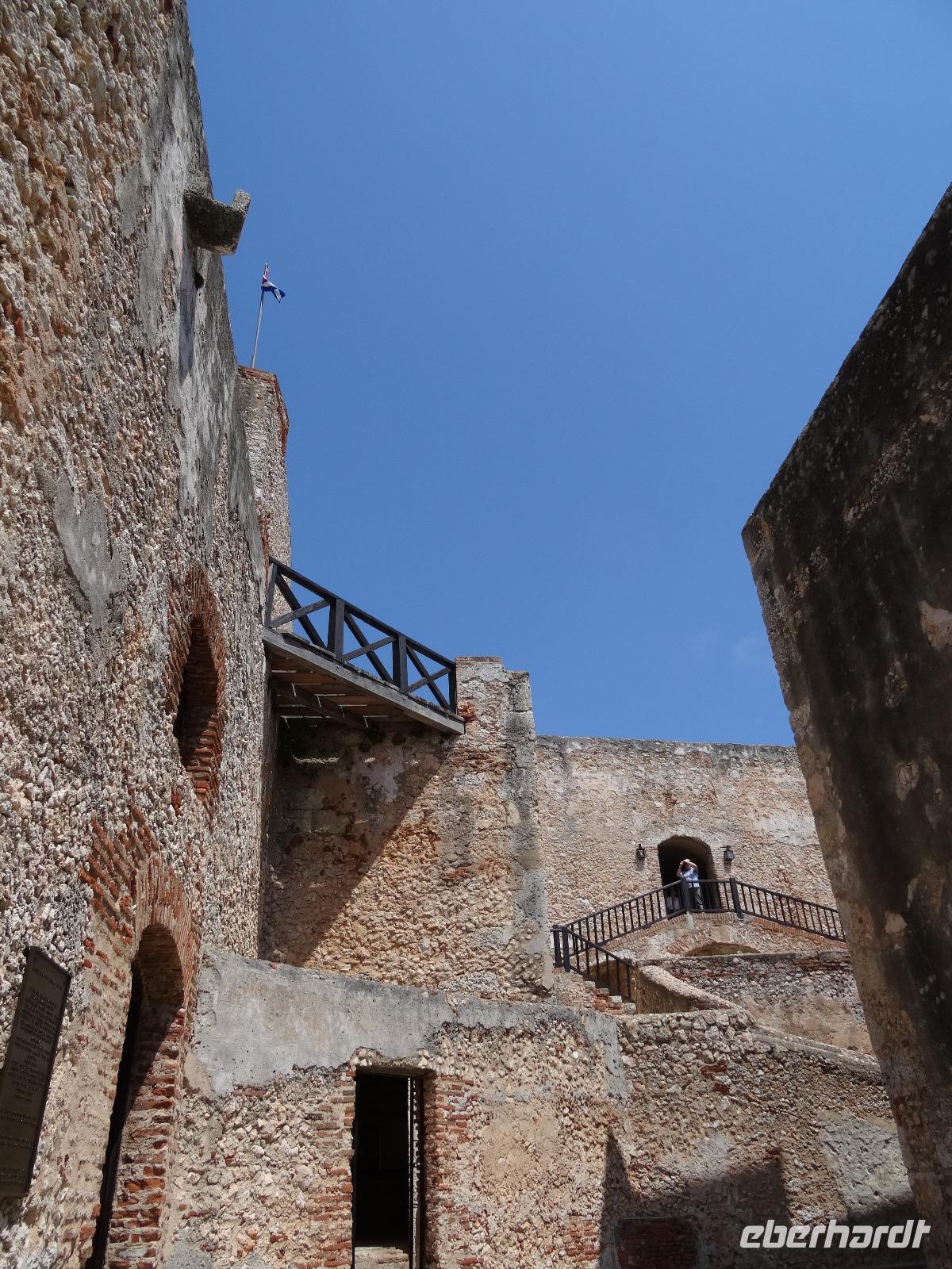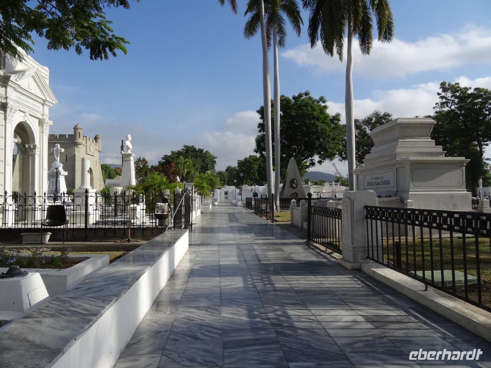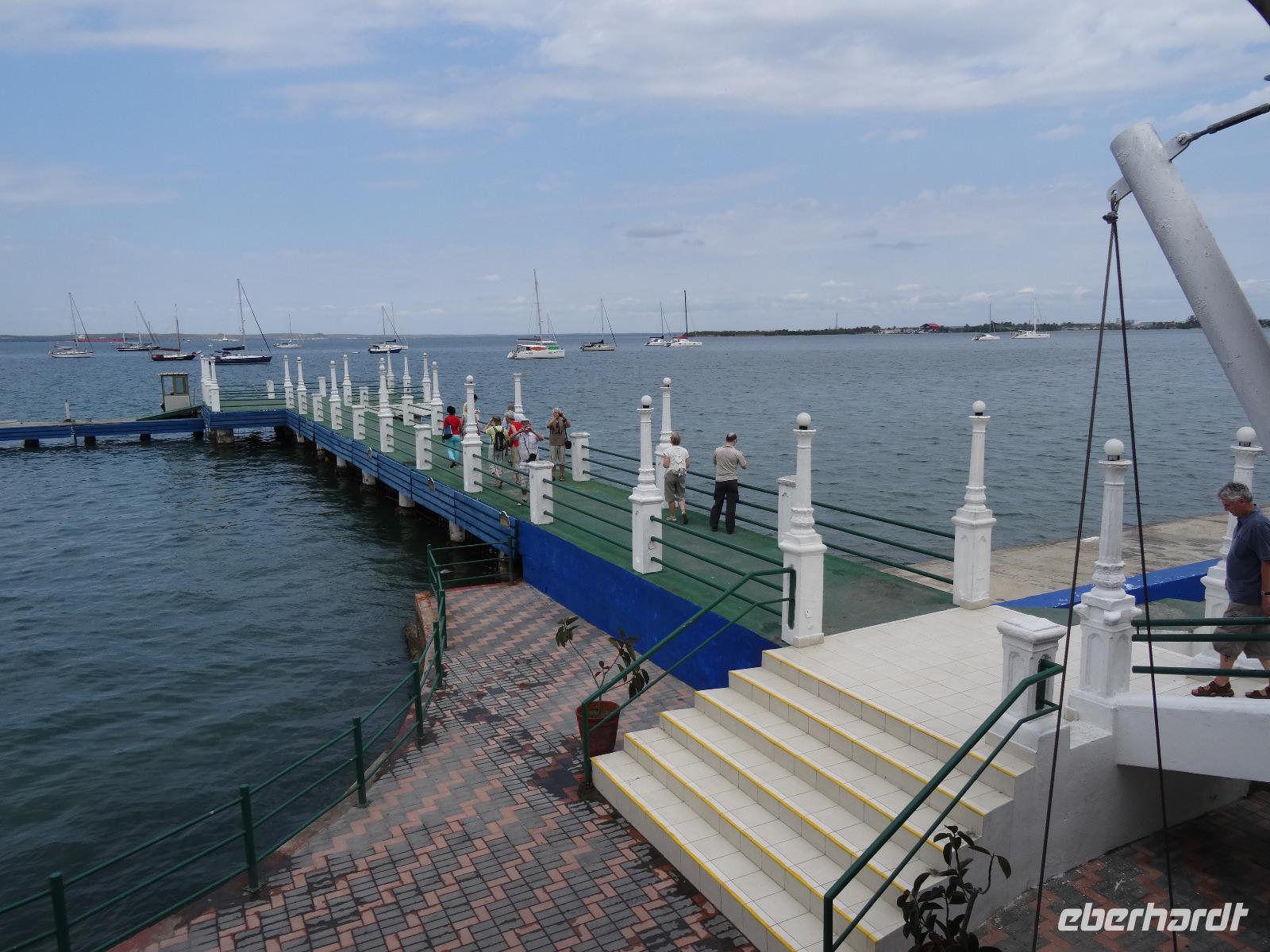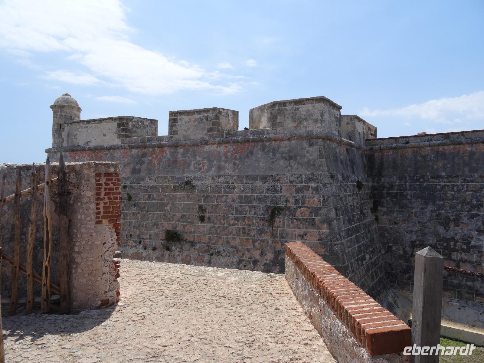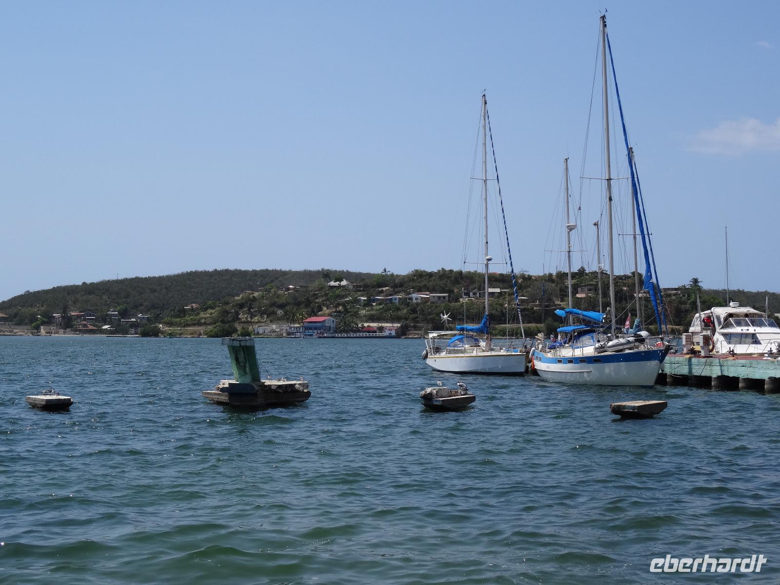 Nach dieser kleinen Odyssee wurden wir gegen Mittag endlich in Santiago de Cuba von unserem Busfahrer Rolando herzlich begrüßt. Er würde uns zusammen mit unserer Reiseleiterin Marvileivis sein Kuba zeigen und uns in den nächsten vierzehn Tagen die Schönheiten dieser Insel näher bringen. Um uns von den Strapazen der Anreise etwas zu erholen, begannen wir unsere Rundreise mit einem Mittagessen in dem Inselrestaurant El Cayo Grandma, wohin wir mit einem kleinen Boot übersetzten. Derart gestärkt, trotzten wir unserer Müdigkeit und besichtigten die im 17. Jahrhundert zum Schutz vor Piraten etwas außerhalb gelegene Festung "Castillo del Morro". Sie war seinerzeit für die Stadt Santiago, die Haupthafen für die Schiffe der spanischen Armada und die Sklavenschiffe aus Afrika war, von großer verteidigungspolitischer Bedeutung. Anschließend fuhren wir ins Zentrum von Santiago, der zweitgrößten Stadt Kubas und lernten bei einer Stadtführung den Parque Cespedes mit der Kathedrale und dem Rathaus kennen, wichen permanent längst ausgestorben geglaubten automobilen Fossilien aus und warfen des Öfteren einen Blick hinter die Fassade der kubanischen Wirklichkeit. Vorbei am Bacardi-Museum spazierten wir durch die Gassen der Altstadt zum Plaza del Marte mit der Büste von Jose Marti und einem Denkmal für Camilo Cienfuegos, bevor wir mit dem Bus zum ersten Haus der Stadt, dem Hotel Melia Santiago de Cuba, fuhren und eincheckten. Das Abendessen nahmen wir in einer urigen "Wohnungsrestauration" ein, dem Paladar Don Ramon, wo uns der Patron persönlich in familiärer Atmosphäre bediente. Das Essen war sehr reichhaltig und lecker und der abschließende Kaffee mit einem ordentlichen Schuss Rum (wahlweise auch pur), versöhnte uns schlussendlich mit den zurückliegenden Anstrengungen der vergangenen vierzig Stunden.