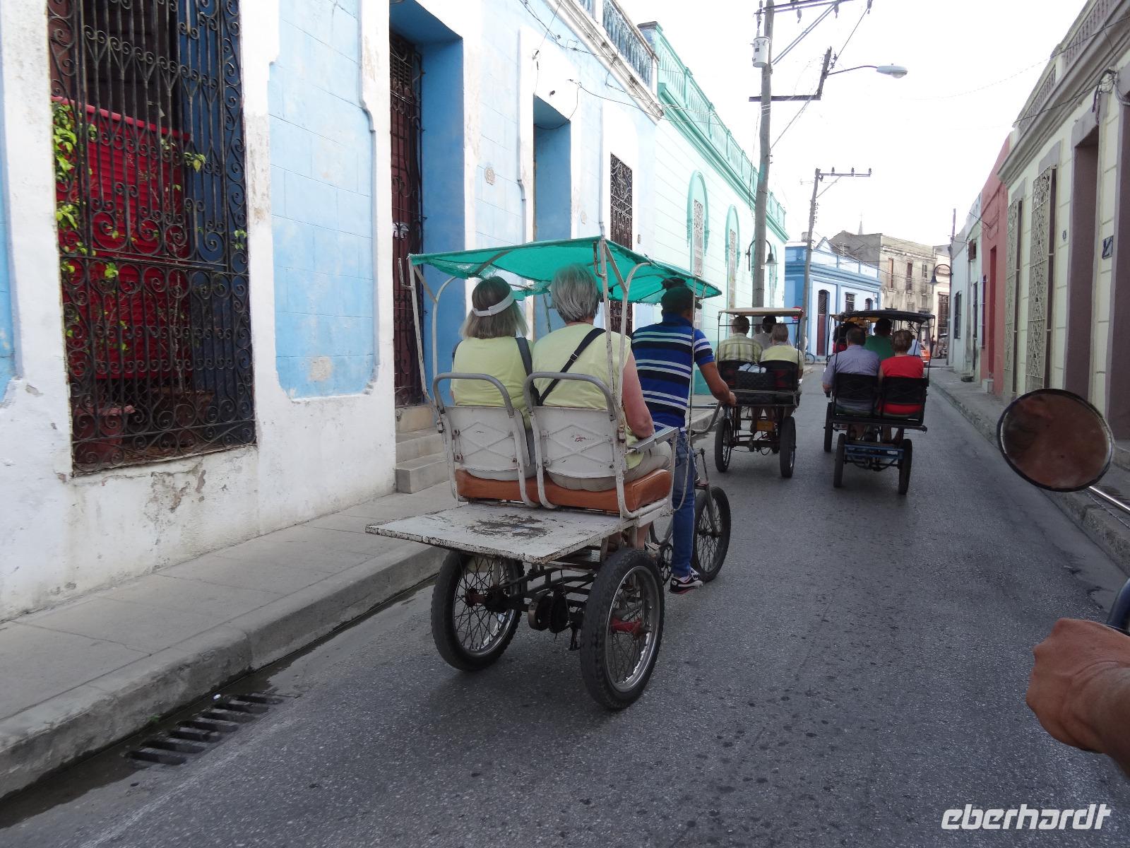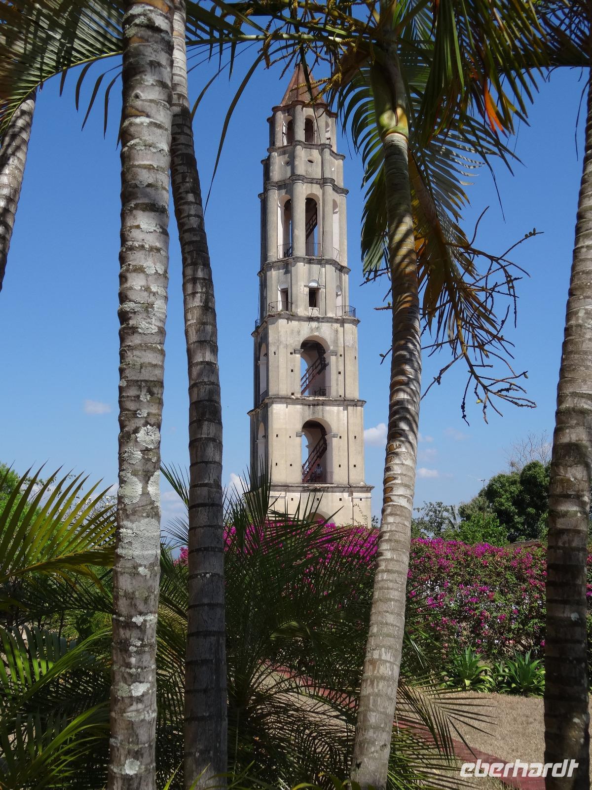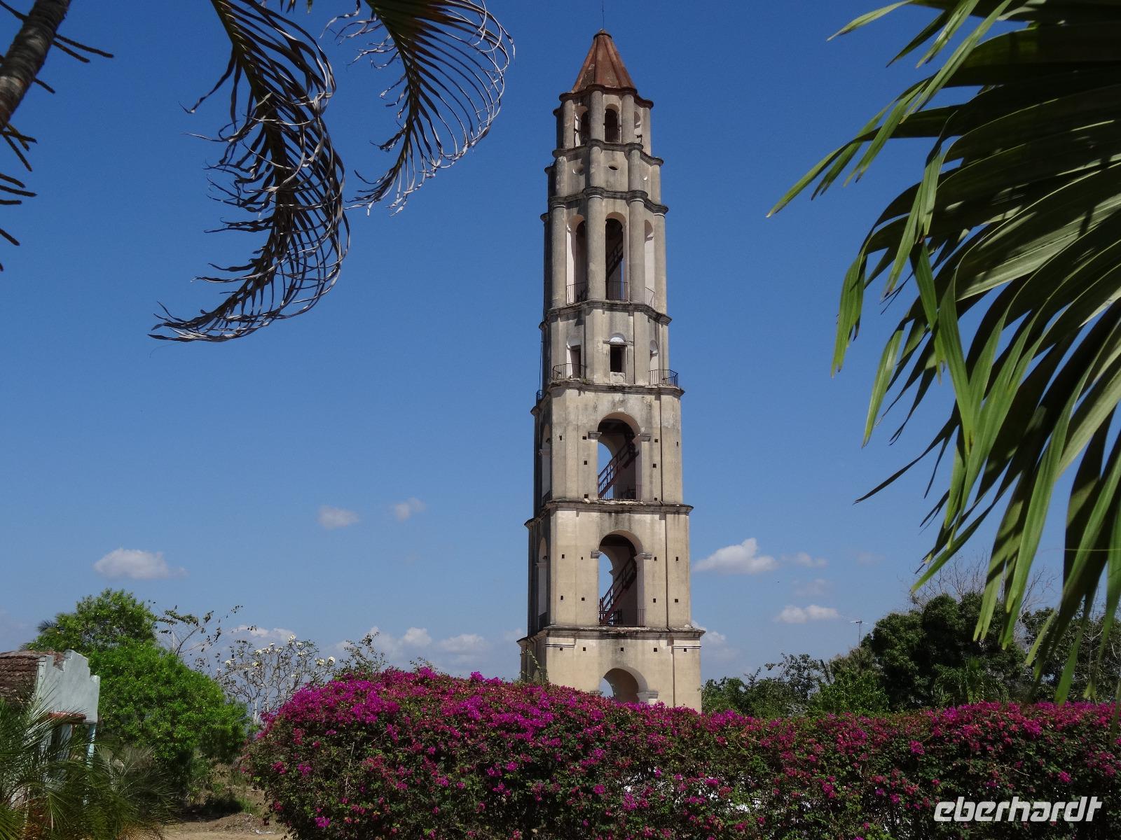 Den heutigen Stadtrundgang in Camaqüey funktionierten wir kurzerhand um in eine Stadtrundfahrt mit den überall bereitstehenden Bici-Taxis, Fahrradrikschahs der Marke Eigenbau. Jeweils zwei Personen enterten die bedrohlich ächzenden Gefährte und so ging es als kleiner Konvoi durch die engen Straßen der Altstadt. Wir stoppten unterwegs immer wieder und sahen dabei den Parque Ignacio Agramonte, die Kathedrale Metropolitan, die Plaza San Juan de Dios, die Plaza del Carmen mit den bekannten Bronzestatuen der Darstellung kubanischer Alltagsszenen sowie das ehemalige Hospital Padre Jose Ollalo. Auch wenn man Mitleid mit den Fahrern dieser Gefährte haben müsste, war es doch eine besonders interessante Art und Weise, diese kulturhistorisch bedeutende Stadt zu "erfahren". Anschließend verließen wir die Stadt der Tonkrüge, um die sich einige Legenden ranken, und begaben uns in westlicher Richtung in die Provinz Sancti Spiritus mit dem Ziel Valle de los Ingenios, dem Tal der Zuckermühlen. Nach langer Fahrt durch die kubanische Zentralprovinz mit ihren Viehherden, Palmen- und Bananenhainen erreichten wir Manaca Iznaga mit der gleichnamigen Casa. Sie ist die bekannteste der ehemaligen Zuckermühlen und mit ihrem 44 Meter hohen Sklaventurm auch die berühmteste. Nach einem schmackhaften Mittagessen und den Erklärungen zur Herstellung von Zuckerrohrsaft mittels einer alten Zuckerrohrpresse bestiegen wir die 136 Stufen des ehemaligen Sklaventurmes. Oben angekommen eröffnete sich uns ein fantastischer Ausblick über die einstmals üppigen Zuckerrohrplantagen bis nach Trinidad hinein. Es war beeindruckend, den Blick soweit in die Landschaft lenken zu können. Wieder Boden unter den Füßen, ging es die letzten 23 Kilometer zu unserem Hotel an der Playa Ancon, wo uns zwei entspannte Tage in einer All-Inklusive-Anlage erwarteten.