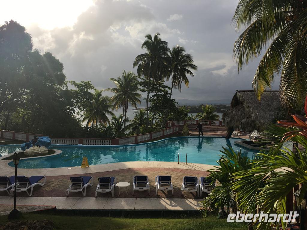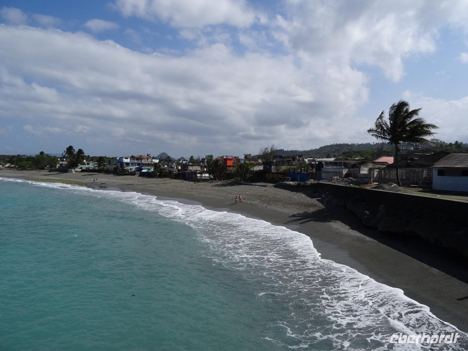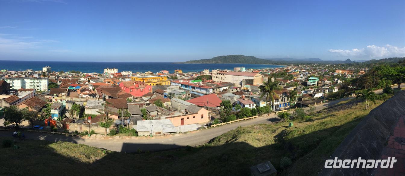 Nach einem überaus reichhaltigen Frühstück begannen wir unsere fünfstündige Fahrt durch die Provinz Guantanamo nach Baracoa, Kubas ältester Stadt ganz im Südosten der Insel. Über eine fast autofreie Autobahn fuhren wir an einer üppig grünen Landschaft vorbei nach Guantanamo, wo wir einen kurzen Stopp einlegten. Etwas außerhalb der Stadt beginnt die gleichnamige Bay, welche durch den angrenzenden US-amerikanischen Militärstützpunkt weltweit bekannt ist. Von einer kleinen Aussichtsplattform konnte man in weiter Ferne zumindest die Anlage erahnen, wenn auch nicht wirklich sehen. Aber das ist bekanntermaßen auch nicht Sinn und Zweck militärischer Objekte, schon gar nicht in diesem speziellen Fall. Weiter führte uns unsere Tour durch die Sierra der Maquey, später entlang der Karibikküste. Gegen Mittag machten wir eine Picknickpause an einem kleinen Strand in der Nähe von San Antonio del Sur. Am klaren und wunderbar warmen karibischen Meer genossen wir unter Palmen anderthalb schöne und entspannte Stunden. Baden inklusive. Anschließend setzten wir unsere Fahrt nach Baracoa über das Gebirge fort und erreichten nach einiger Zeit einen Aussichtsturm in Alto de Cotilla, von wo aus man einen tollen Blick auf die umliegenden Berge der Sierra del Purial hatte. Am frühen Nachmittag erreichten wir endlich Baracoa. Wir stoppten zuerst am Malecon, vor der Festung Fuerte Matachin und der Statue von Christoph Columbus, bevor wir zu Fuß einen Rundgang durch die teilweise restaurierte Altstadt von Baracoa machten. Unser Weg führte uns natürlich auch zur Kirche Nuestra Senora de Conception und dem 500 Jahre alten Kreuz "Cruz de la Parra". Danach stiegen wir die Treppen zum altehrwürdigen Hotel El Castillo hoch und genossen einen fantastischen Blick auf die Stadt und die angrenzende Bucht. Unser Abendessen nahmen wir heute in unserer Hotelanlage etwas außerhalb Baracoas ein, bevor wir an der Hotelbar mit einem Mojito oder Cuba Libre die Eindrücke des Tages Revue passieren ließen.