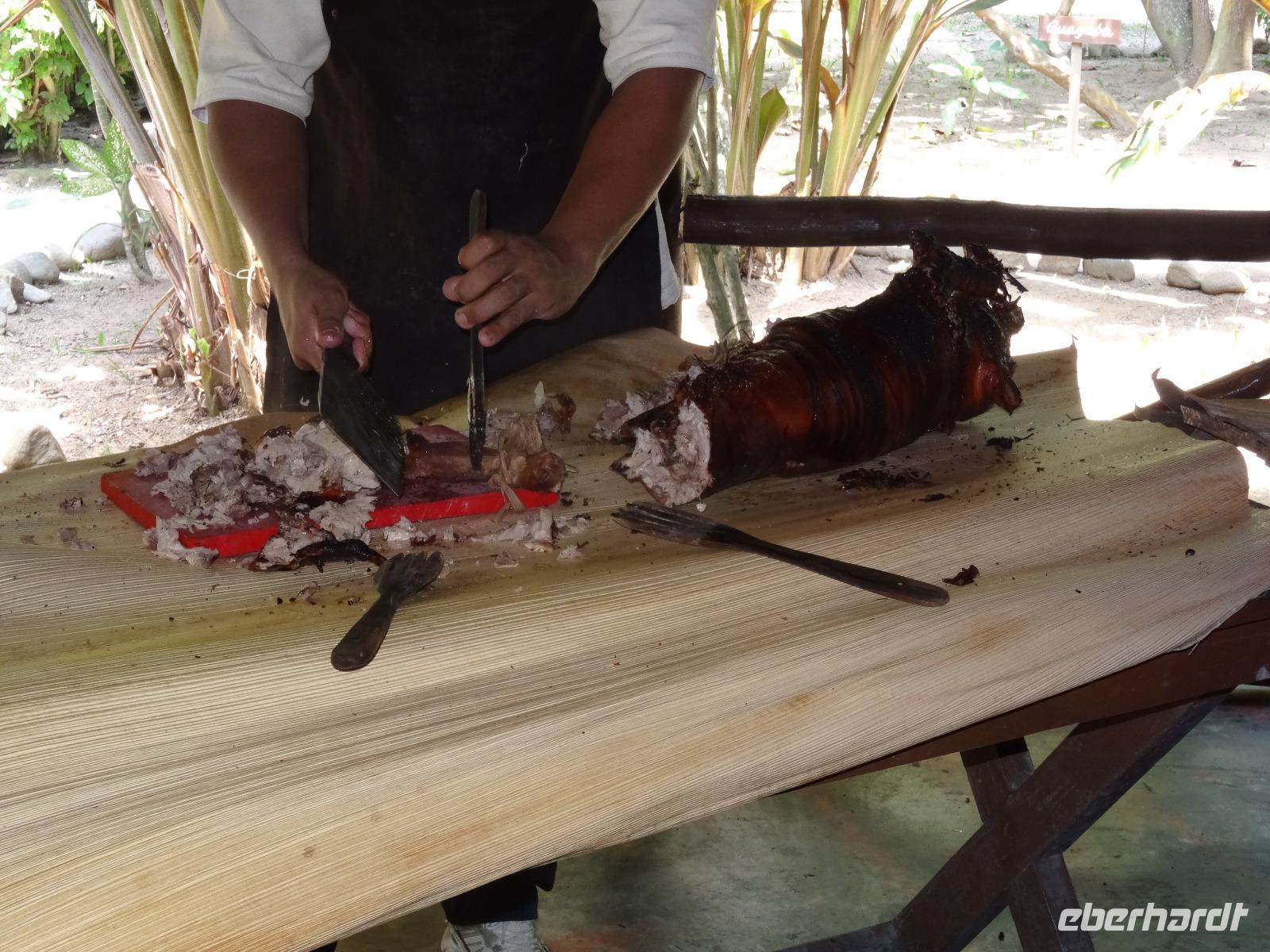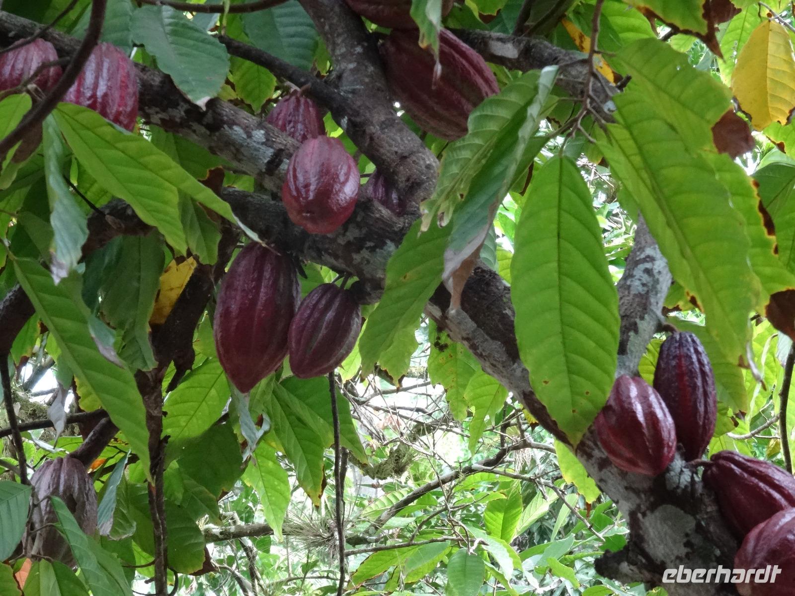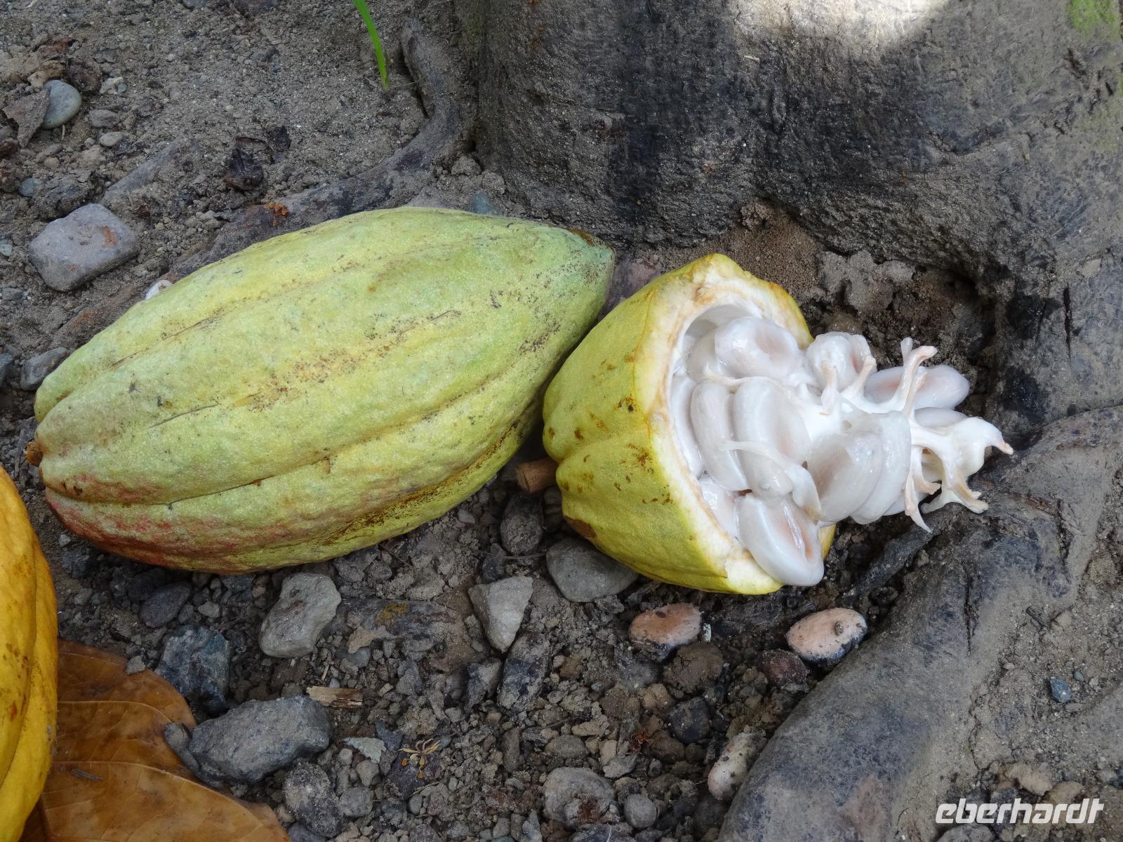 Bevor wir uns heute auf den Rückweg nach Santiago machten, wollten wir noch etwas zur Kakaoproduktion in der Region erfahren. Nach kurzer Fahrt erreichten wir die Finca Duaba, wo wir von dem sehr netten und lustigen Naturführer Juan begrüßt wurden. Er zeigte und erklärte uns auf kurzweilige Art die unterschiedlichen Pflanzen und Früchte der Plantage und ließ uns das eine und andere Mal Früchte „erschmecken und erriechen". Wer mochte, konnte auch proteinreiche Termiten kosten. Im Geschmack waren diese nicht unangenehm, man sollte sie nur wirklich zerbeißen, um ungewollte Krabbeleien zu vermeiden. Darüber hinaus erhielten wir viele Informationen zum Kakao und seiner Verarbeitung, bekamen Kakaoschoten, Kochbananen, Guaven, Mangos, Orangen, Mandarinen und die Früchte des Brotfruchtbaumes zu Gesicht und konnten am Ende eine köstliche Tasse heißer Schokolade mit Kokosmilch zu uns nehmen. Wenig später ging es zur Finca Rio Toa, wo wir auf dem wasserreichsten Fluss Kubas eine Bootstour unternahmen. In drei Ruderbooten erreichten wir die Mündung des Rio Toa in den Atlantik und konnten von einer Landzunge aus die starke Strömung beobachten. Zurück in der Finca genehmigten wir uns ein paar kühle Getränke, wobei Naranja del Toa oder Kokosnusswasser, wahlweise mit oder ohne Rum, die Favoriten waren. Anschließend nahmen wir, begleitet von den Klängen einer Son-Band, ein Mittagessen ein. Es gab Suppe im Bambusrohr, Spanferkel und Kokospudding. Gut gestärkt begann am frühen Nachmittag dann unsere Rückfahrt nach Santiago de Cuba. Die Übernachtung erfolgte dieses Mal im Herzen der Altstadt, direkt gegenüber der Kathedrale am beliebten Parque Cespedes. Nach einem ruhigen Abendessen außerhalb des Zentrums konnte man den Abend noch mit einem Besuch der Casa de la Trova beschließen, Kubas berühmter, allgegenwärtiger Musikbar, oder man setzte sich auf die Dachterrasse des Hotels und ließ den Blick über die nächtliche, aber unheimlich lebendige und an dieser Stelle auch laute Stadt schweifen.