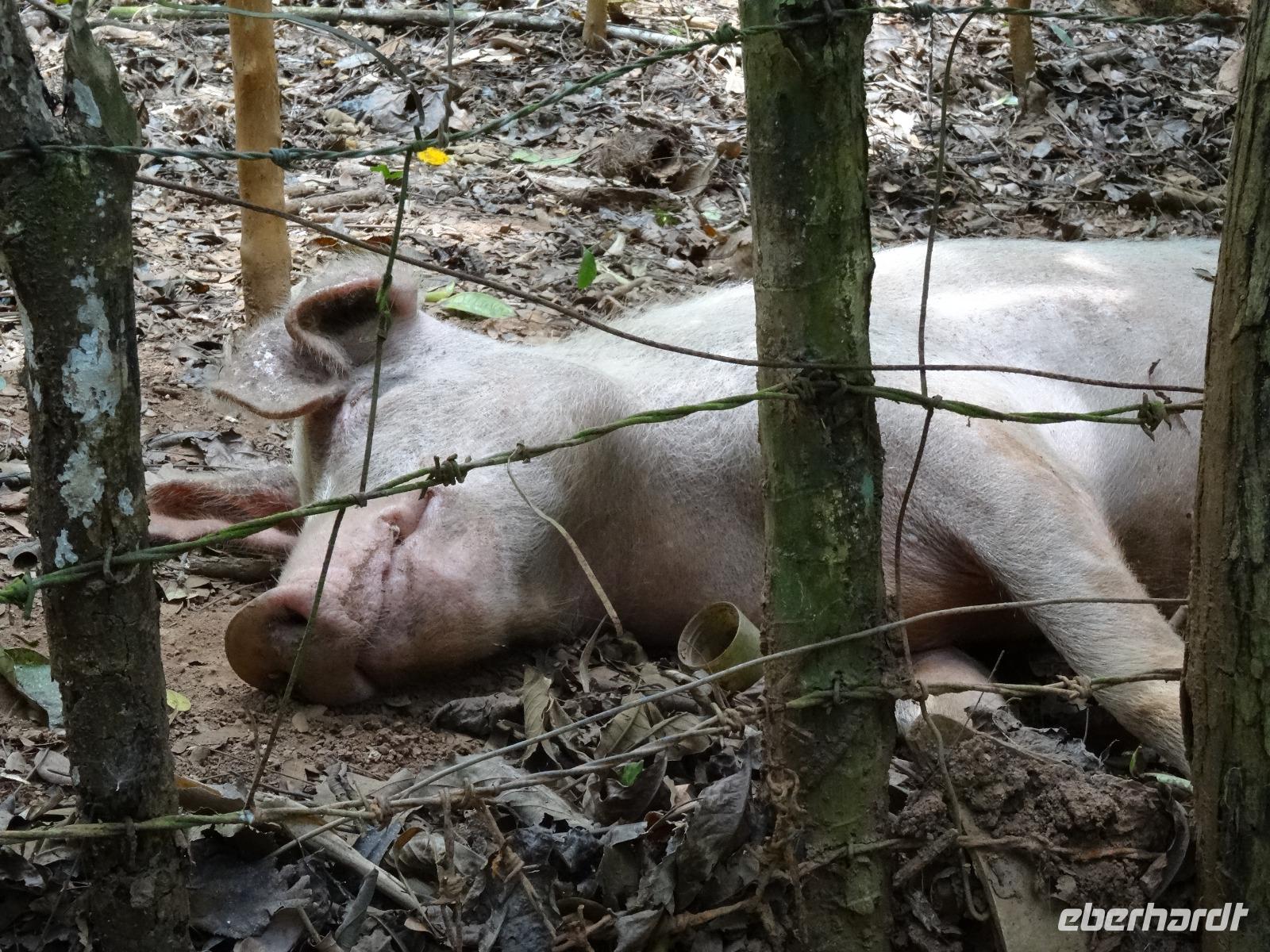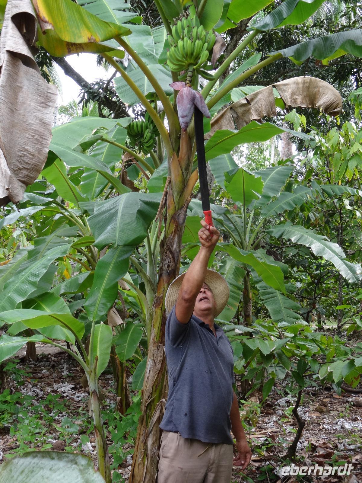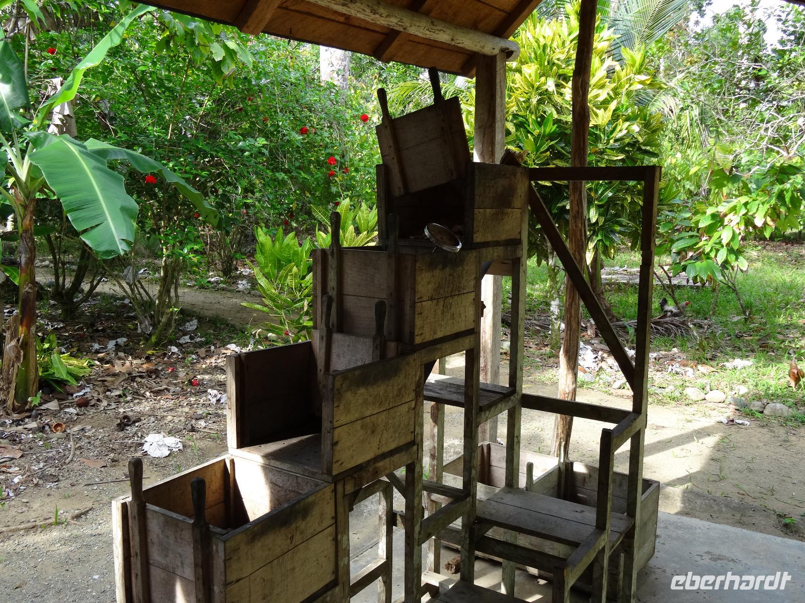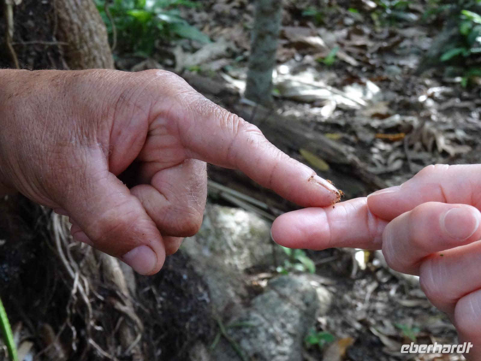 Bevor wir uns heute auf den Rückweg nach Santiago machten, wollten wir noch etwas zur Kakaoproduktion in der Region erfahren. Nach kurzer Fahrt erreichten wir die Finca Duaba, wo wir von dem sehr netten und lustigen Naturführer Juan begrüßt wurden. Er zeigte und erklärte uns auf kurzweilige Art die unterschiedlichen Pflanzen und Früchte der Plantage und ließ uns das eine und andere Mal Früchte „erschmecken und erriechen". Wer mochte, konnte auch proteinreiche Termiten kosten. Im Geschmack waren diese nicht unangenehm, man sollte sie nur wirklich zerbeißen, um ungewollte Krabbeleien zu vermeiden. Darüber hinaus erhielten wir viele Informationen zum Kakao und seiner Verarbeitung, bekamen Kakaoschoten, Kochbananen, Guaven, Mangos, Orangen, Mandarinen und die Früchte des Brotfruchtbaumes zu Gesicht und konnten am Ende eine köstliche Tasse heißer Schokolade mit Kokosmilch zu uns nehmen. Wenig später ging es zur Finca Rio Toa, wo wir auf dem wasserreichsten Fluss Kubas eine Bootstour unternahmen. In drei Ruderbooten erreichten wir die Mündung des Rio Toa in den Atlantik und konnten von einer Landzunge aus die starke Strömung beobachten. Zurück in der Finca genehmigten wir uns ein paar kühle Getränke, wobei Naranja del Toa oder Kokosnusswasser, wahlweise mit oder ohne Rum, die Favoriten waren. Anschließend nahmen wir, begleitet von den Klängen einer Son-Band, ein Mittagessen ein. Es gab Suppe im Bambusrohr, Spanferkel und Kokospudding. Gut gestärkt begann am frühen Nachmittag dann unsere Rückfahrt nach Santiago de Cuba. Die Übernachtung erfolgte dieses Mal im Herzen der Altstadt, direkt gegenüber der Kathedrale am beliebten Parque Cespedes. Nach einem ruhigen Abendessen außerhalb des Zentrums konnte man den Abend noch mit einem Besuch der Casa de la Trova beschließen, Kubas berühmter, allgegenwärtiger Musikbar, oder man setzte sich auf die Dachterrasse des Hotels und ließ den Blick über die nächtliche, aber unheimlich lebendige und an dieser Stelle auch laute Stadt schweifen.