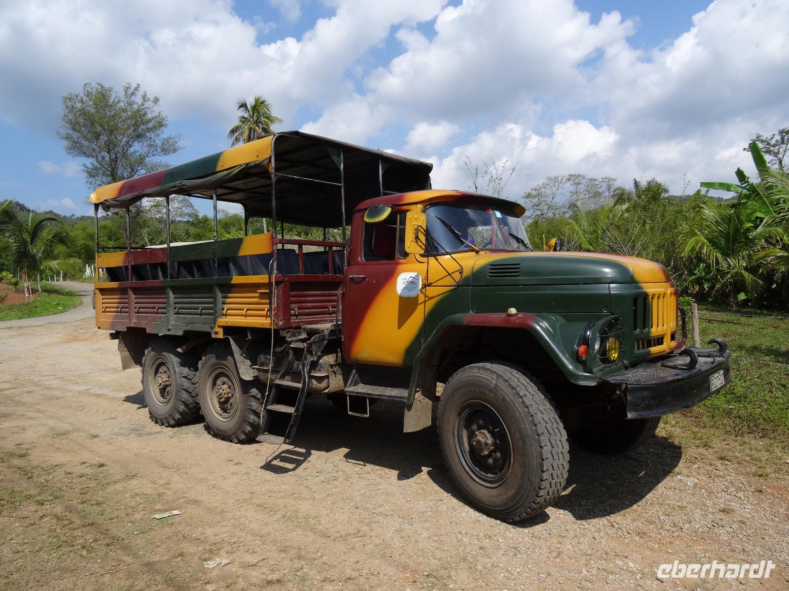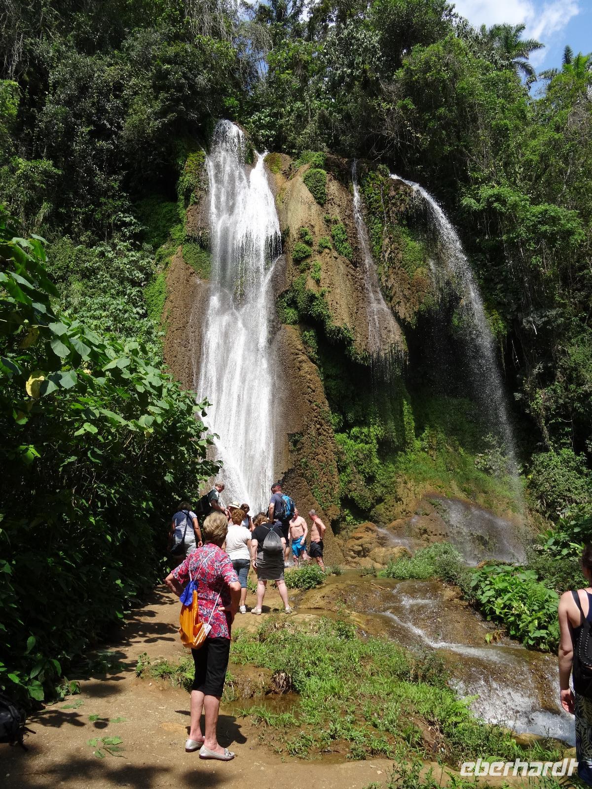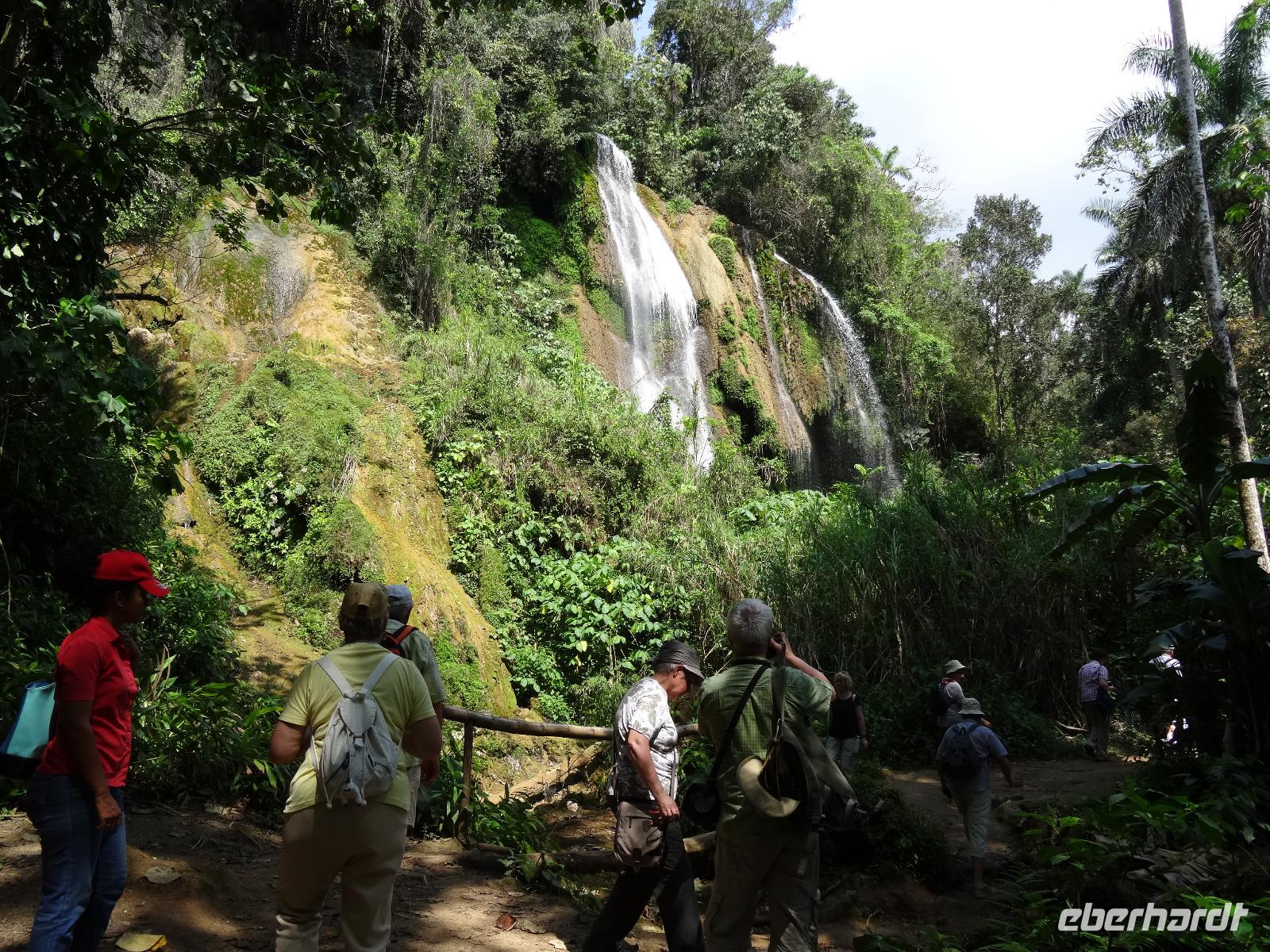 Heute verließen wir vorerst die Karibikküste und bereiteten uns auf eine Fahrt in die Sierra der Escambray vor. Eine halbstündige Fahrt mit dem Bus brachte uns in die Nähe von Trinidad, wo wir in einen fast dreißig Jahre alten russischen Syl, ein Koloss von Fahrzeug, umstiegen. Traditionell werden damit Touristen, aber auch Einheimische in und aus den nahegelegenen Bergen der Sierra de Escambray befördert. Diese Art der Fortbewegung bietet dabei natürlich mehr Abenteuer als Fahrkomfort, was uns schon nach wenigen quietschenden und rumpelnden Minuten klar war. Aufgrund der Steigungen, die teilweise zu überwinden waren, konnte man den Einsatz solcher Fahrzeuge nachvollziehen, zu einem großen Teil wird es aber eher an den moderneren Alternativen mangeln bzw. ein Stück Nostalgie eine Rolle spielen. Nach gut dreißig Minuten erreichten wir Topes de Collantes inmitten der Sierra und stoppten am dortigen Info-Center. Wir befanden uns hier schon auf knapp 800 Meter Höhe und in landschaftlich sehr schöner Umgebung. Nachdem unser Naturführer Valentin zugestiegen war, setzten wir unsere Fahrt mit dem altehrwürdigen Syl fort. Unterwegs sahen wir Bromelien, die auf Stromleitungen wuchsen - ein beeindruckender Anblick! Nach nochmals knapp halbstündiger Fahrt begannen wir unsere Wanderung durch den Nationalpark. Unterwegs erfuhren wir von Valentin vieles über die regionale Flora und Fauna, unter anderem über den hier angepflanzten Kaffee. Am Wasserfall El Rocio bot sich uns ein tolles Fotomotiv, bevor es zum baden an eine kleinen Lagune ging. Nach sehr interessanten drei Kilometern Wanderung erreichten wir die Casa La Gallega, wo wir nach dem Willkommenstrunk La Carambola unser Mittagessen einnahmen. Nach einer guten Stunde verließen wir die Sierra de Escambray wieder und gelangten mit unseren Syl an den Ausgangspunkt der Bergetappe zurück. Nicht ohne vorher noch Obst und Früchte an einem kleinen Stand zu probieren. Die anschließende Fahrt nach Cienfuegos führte uns unmittelbar an die Karibikküste zurück zu unserem Hotel am Rande der gleichnamigen Bucht. Nach einem schmackhaften Abendessen im Hotelrestaurant haben sich einige aus unserer Gruppe noch eine schöne Tanz- und Musik-Show angeschaut.