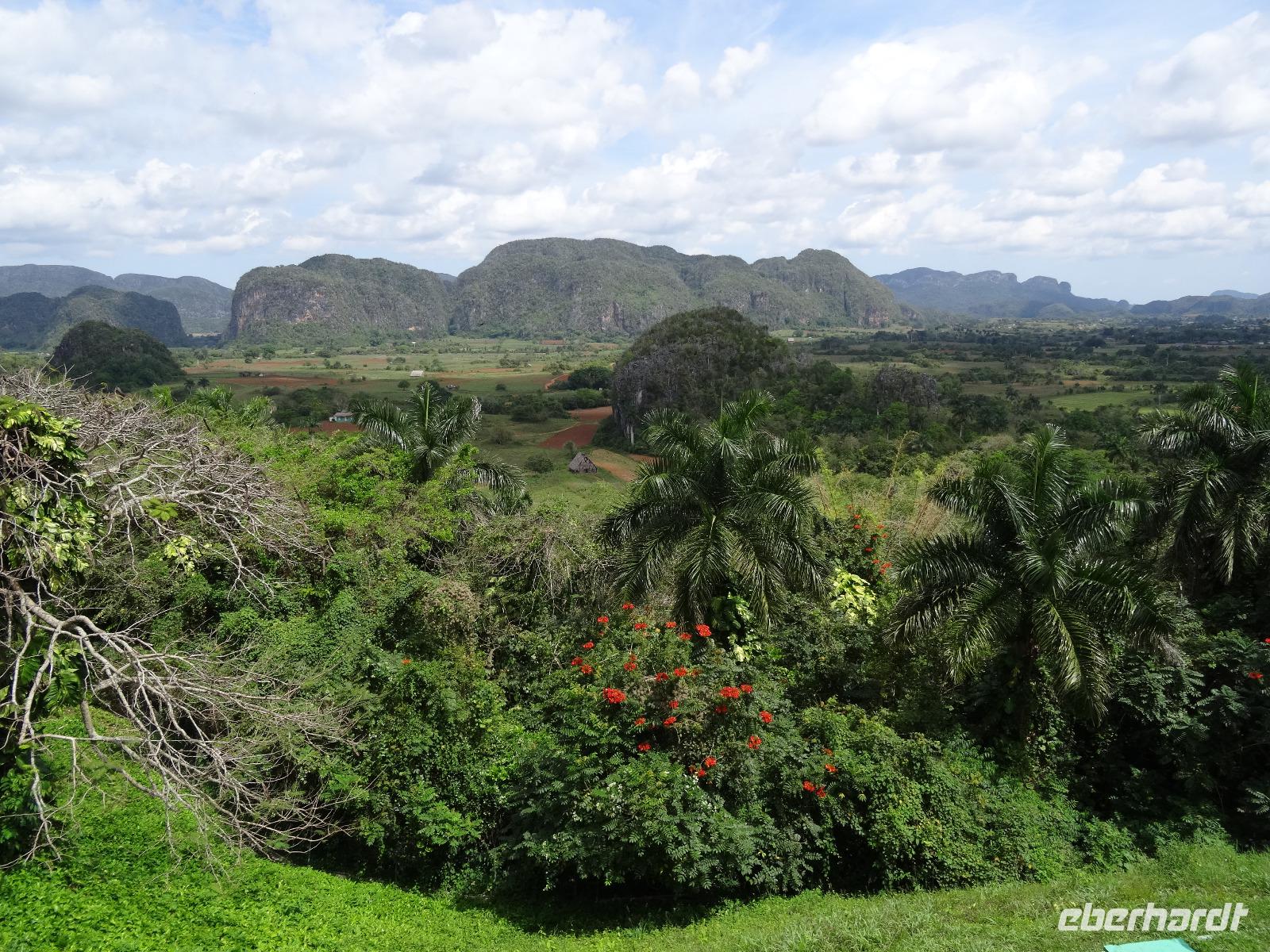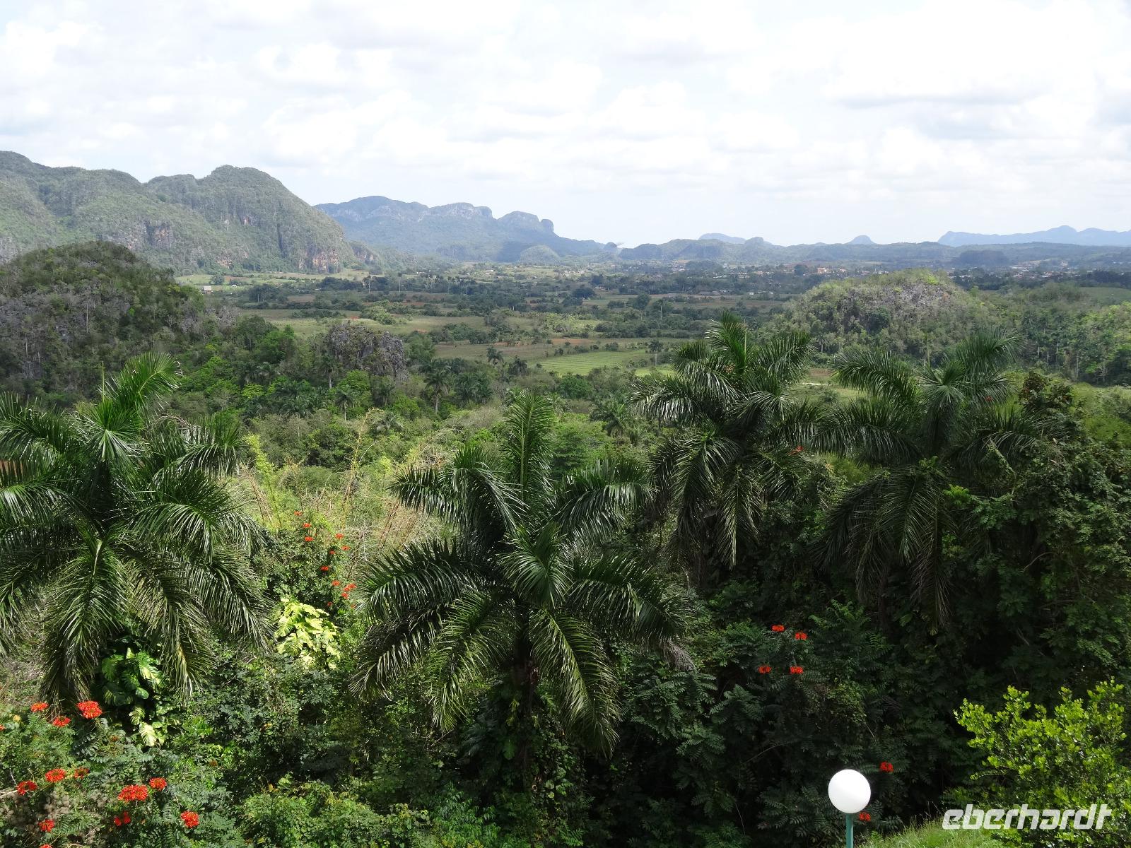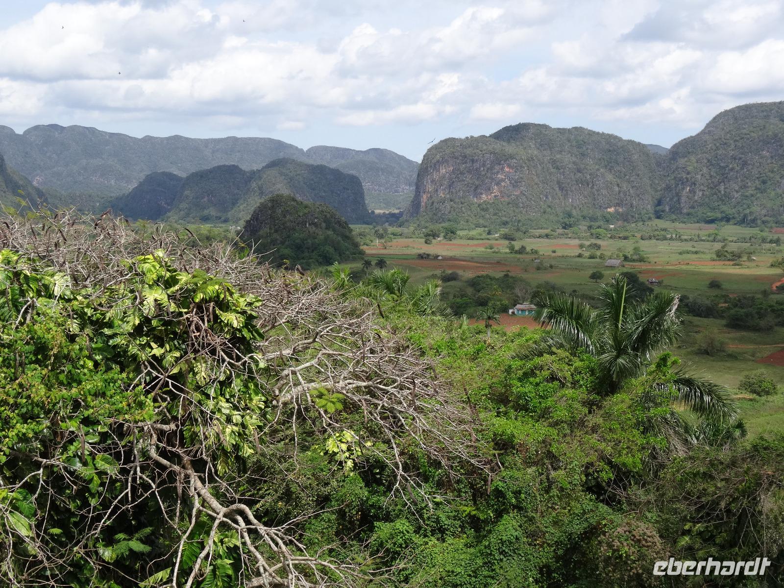 Nach zwei aufeinanderfolgend kurzen Nächten ging es auch heute wieder relativ zeitig am Morgen ins knapp 160 km entfernte Valle de Vinales, einem absoluten Besuchermagnet, Heimat des besten kubanischen Tabaks und der sogenannten "Mogotes", der für dieses Tal typischen Kegelkarstberge. Die durch die Autobahnfahrt relativ ereignislos verlaufenden zweieinhalb Stunden bis zur ersten Zwischenstation Pinar del Rio überbrückten wir mit Informationen und Erzählungen zur Geschichte und Politik des Landes sowie zur Situation und Lebensweise der Kubaner. Darüber hinaus schauten wir uns eine Dokumentation zum Tabakanbau und zur Verarbeitung desselben an. So verging die Fahrt wie im Fluge und wir erreichten Pinar der Rio noch vor der größten Mittagshitze. Unser Ziel in der Provinzhauptstadt ganz im Westen Kubas war eine Guayabita-Fabrik, welche Likör aus der Frucht Guayabita del Pinar, einer Guavenart, herstellt. Wir bekamen bei einer kleinen Führung Einblicke in die Herstellung, Reifung und Weiterverarbeitung des sehr süßen Likörs. Eine kleine Verkostung bildete dann den Abschluss des Besuches. Wir fuhren weiter zum Hotel Los Jazmines, von dessen Terrasse aus man einen überwältigenden Blick auf das vor einem liegende Vinales-Tal hatte. Wie immer in so einer Situation dankt man der Schöpferkraft von Mutter Natur, die eine anmutig und erhaben wirkende Gesteinskomposition in diesen Teil der Insel gezaubert hat. Nach einem solchermaßen fotogenen Genuss wandten wir uns wieder irdischen "Genüssen" zu und besuchten die nicht weit entfernte Tabak-Finca Paraiso, wo wir Informationen zum Anbau des besten kubanischen Tabaks bekamen. Wir besichtigten des Tabakhaus, wo die kostbaren Blätter trockneten, nahmen Erklärungen zu Fermentation entgegen und sahen dem Tabakbauern beim Drehen einer Zigarre zu, die wir dann im Anschluss "kosten" konnten. Wie fast immer wurde das Ganze durch einen aromatischen Kaffee mit dem obligaten Schuss Rum abgerundet. Für 10 kubanische (konvertierbare) Pesos gab es 10 hausgemachte Zigarren zum mitnehmen. Voll gefüllt mit jeder Menge Informationen mussten wir nun auch mal an die Füllung unserer Mägen denken. Im Restaurant Palenque de los Cimarrones, welches malerisch im Vinales-Tal lag, nahmen wir an der Bar zuerst einen göttlichen Drink, einen sogenannten "Oshun" - was Göttin des Flusses bedeutet, um anschließend durch ein kleines Höhlensystem zum Hauptrestaurant vorzudringen. Hier stärkten wir uns bei Hühnchen mit Reis und Kartoffeln, bevor wir zu einer kurzen Wanderung durch das Tal aufbrachen. Vorbei an den teilweise einsturzgefährdet aussehenden Karstfelsen gelangten wir zum "prähistorischen" Wandgemälde Mural de la Prehistoria, welches in grellbunten Farben die schöne Landschaft „bereichert". Pop-Art auf kubanisch. Wem es gefällt. Der Tag war danach schon weit fortgeschritten, so dass wir nun die Rückfahrt ins knapp drei Stunden entfernte Havanna antreten mussten.