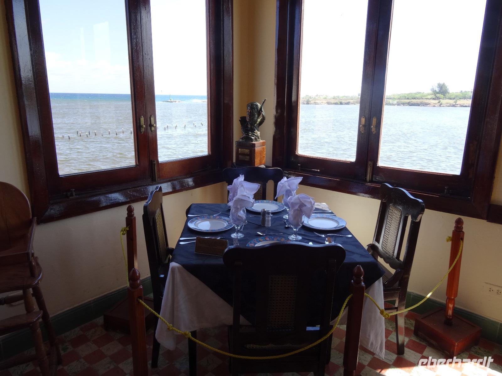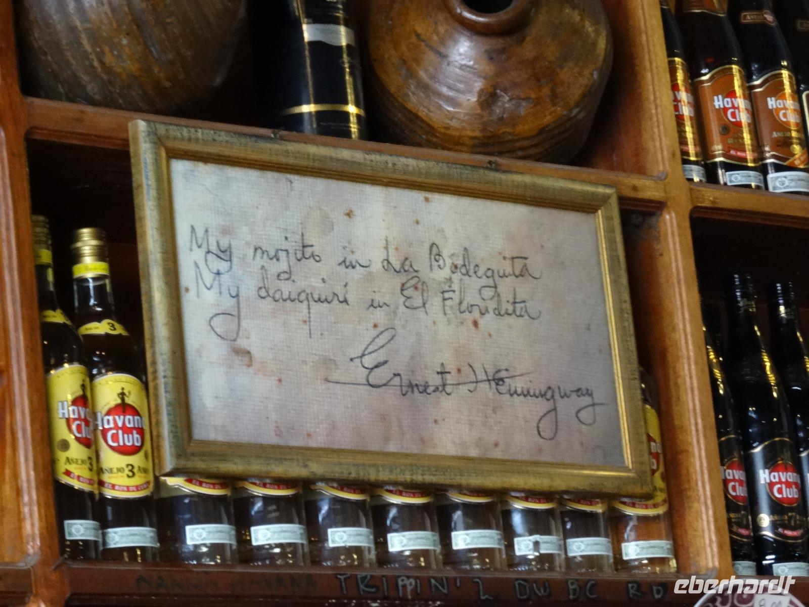 Nun war er da, der unwiderruflich letzte Tag unserer Reise durch Kuba. Wie um uns den Abschied noch zu erschweren, begrüßte uns auch an diesem Morgen wieder ein wunderschöner sonnig-warmer Tag. Von Soroa aus begaben wir uns auf den Rückweg nach Havanna, wo wir den Spuren Ernest Hemingways folgen wollten. Wir erreichten nach anderthalbstündiger Fahrt als erstes Ziel unserer Tour das ehemalige Anwesen des Nobel- und Pulitzer-Preisträgers, die Finca Vigia, nur um dort feststellen zu müssen, dass das heute als Museum dienende Haus und Grundstück geschlossen war. Leider ließ sich der diensthabende Wachmann weder durch gute Worte noch durch wertvolles Papier zur Öffnung des „Heiligtums" erweichen. So fuhren wir weiter zu einem der beiden Stammlokale des Schriftstellers in der Altstadt von Havanna. In der Bodegita del Medio, wo Hemingway seinen Mojito zu trinken pflegte, taten wir es ihm gleich und genossen bereits um elf Uhr morgens unsere erste rumgetränkte Erfrischung. Danach verließen wir vorerst das Zentrum und fuhren ins knapp 10 Kilometer entfernte Fischer(vor)örtchen Cojimar, wo Hemingway gern im Restaurant La Terraza zu Mittag aß und den hiesigen Fischern bei der Arbeit zusah. Hier soll wohl auch die Idee zu seinem Roman „Der alte Mann und das Meer" geboren worden sein. Heute erinnert ein kleines Denkmal und eben jenes Restaurant, in welchem wir ebenfalls ein leckeres Mittagsmal zu uns nahmen, an den weltbekannten Poeten. Zurück in Havannas Zentrum nahmen wir am frühen Nachmittag einen zweiten Anlauf, das Havana Club-Rum-Museum bei einer deutschsprachigen Führung zu erkunden. Erfolgreich. Wir erfuhren interessante Dinge zur Geschichte des kubanischen Nationalgetränks und konnten diverse historische Reliquien des Hauses in Augenschein nehmen. Anschließend nahmen wir die unterbrochene Fährte unserer Hemingway-Tour wieder auf und spazierten zum Hotel Ambos Mundos, wo Hemingway einige Zeit im Zimmer 511 gewohnt hat. Eine kurze Besichtigung mit fachkundiger Erklärung rundete den Besuch ab. Von der Dachterrasse des Hotels hat man zudem einen fantastischen Blick auf Alt-Havanna. Den Abschluss dieser Tour bildete ein kurzer Abstecher zu einer weiteren Lieblingsbar Hemingways, ins La Floridita. Hier trank er gern seinen Daiquiri. Dazu hatten wir leider keine Zeit mehr, denn nun hieß es tatsächlich Abschied nehmen. Wir machten uns noch kurz etwas frisch und bereiteten uns kleidungstechnisch auf die Rückreise vor. Nach einem sehr leckeren Abendessen brachte uns der Bus zum Internationalen Flughafen von Havanna, wo wir uns von unserer Reiseleiterin Marvileivis und unserem Busfahrer Rolando verabschiedeten.