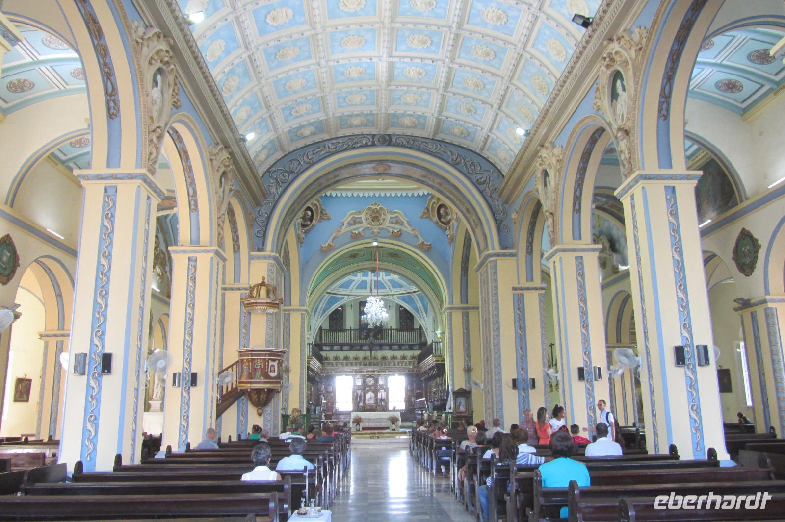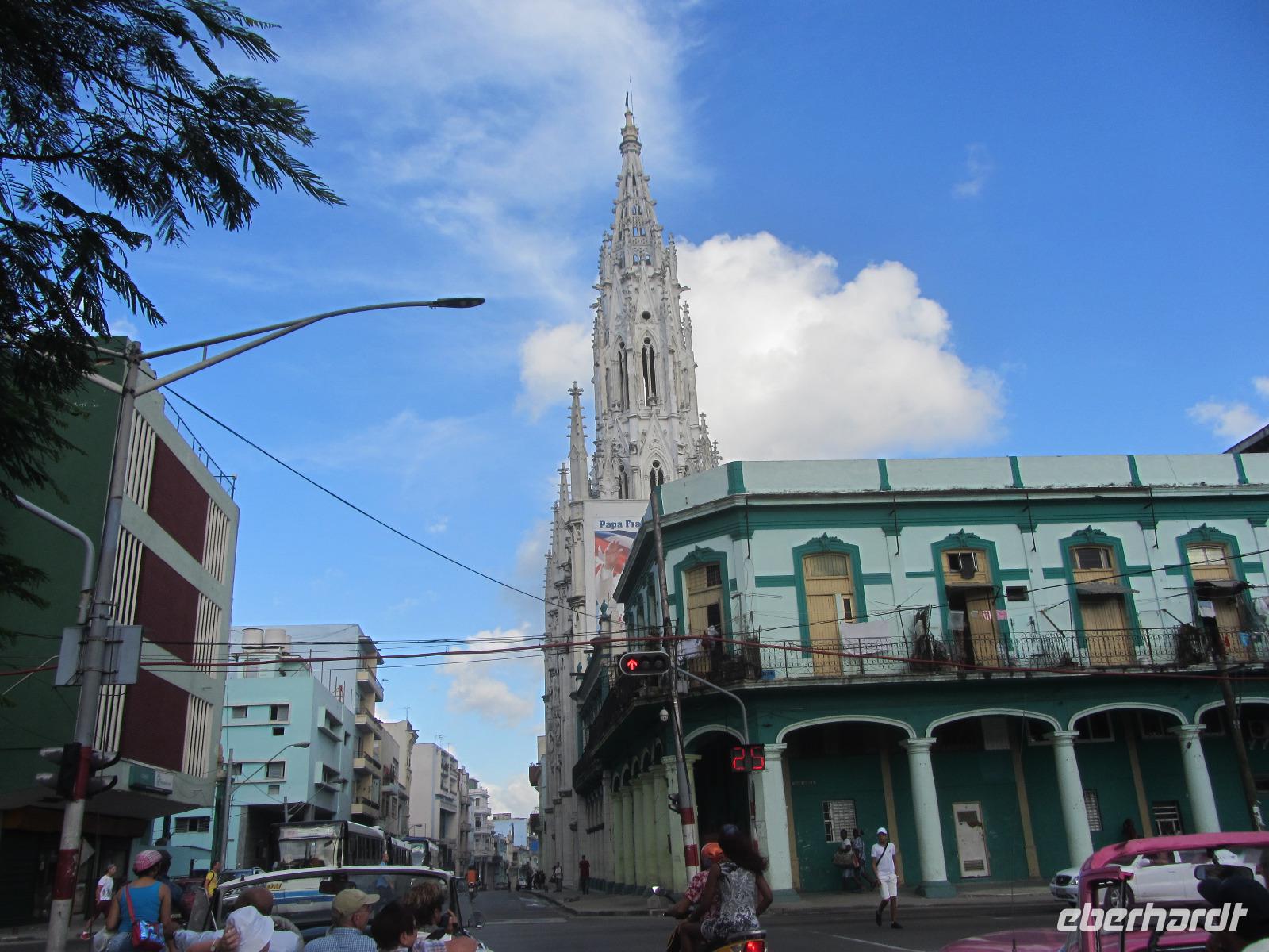 Anschließend führt uns unsere Reise in Richtung der berühmten Wallfahrtskirche El Cobre. Im Jahre 1606 sollen hier drei Fischer von der heiligen Maria vor dem Ertrinken gerettet worden sein. Diese Fischer haben zum Dank eine Kapelle erbauen lassen. Der Name El Cobre (Das Kupfer) ist auf die nahegelegene Kupfermine zurückzuführen. Die damals hier arbeitenden Sklaven verehrten die Jungfrau von El Cobre. Schon erblicken wir vor uns die schöne Kirche mit den drei gelben Türmen. Die Straßen sind voll von kubanischen Händlern, die entweder Marienstatuen oder gelbe Sonnenblumensträuße verkaufen. Wir treten in die imposante Kirche ein. In den Vitrinen sind viele Danksagungen berühmter Persönlichkeiten ausgestellt. Sogar eine Kopie der Nobelpreisplakette und der Urkunde von Ernest Hemingway können wir hier bestaunen. Anschließend fahren wir über Contramaestre, Baire und Santa Rita weiter in die Hauptstadt der Provinz Granma nach Bayamo. Die rebellische Stadt wurde durch Sklavenaufstände, Indianerkämpfe und sonstige Befreiungsaufstände bekannt. Wir besuchen die Casa de la Trova, genießen einen Cocktail und erleben kubanische Musik. Nach einem kleinen Rundgang kehren wir ein und lassen uns unser Mittagessen schmecken.