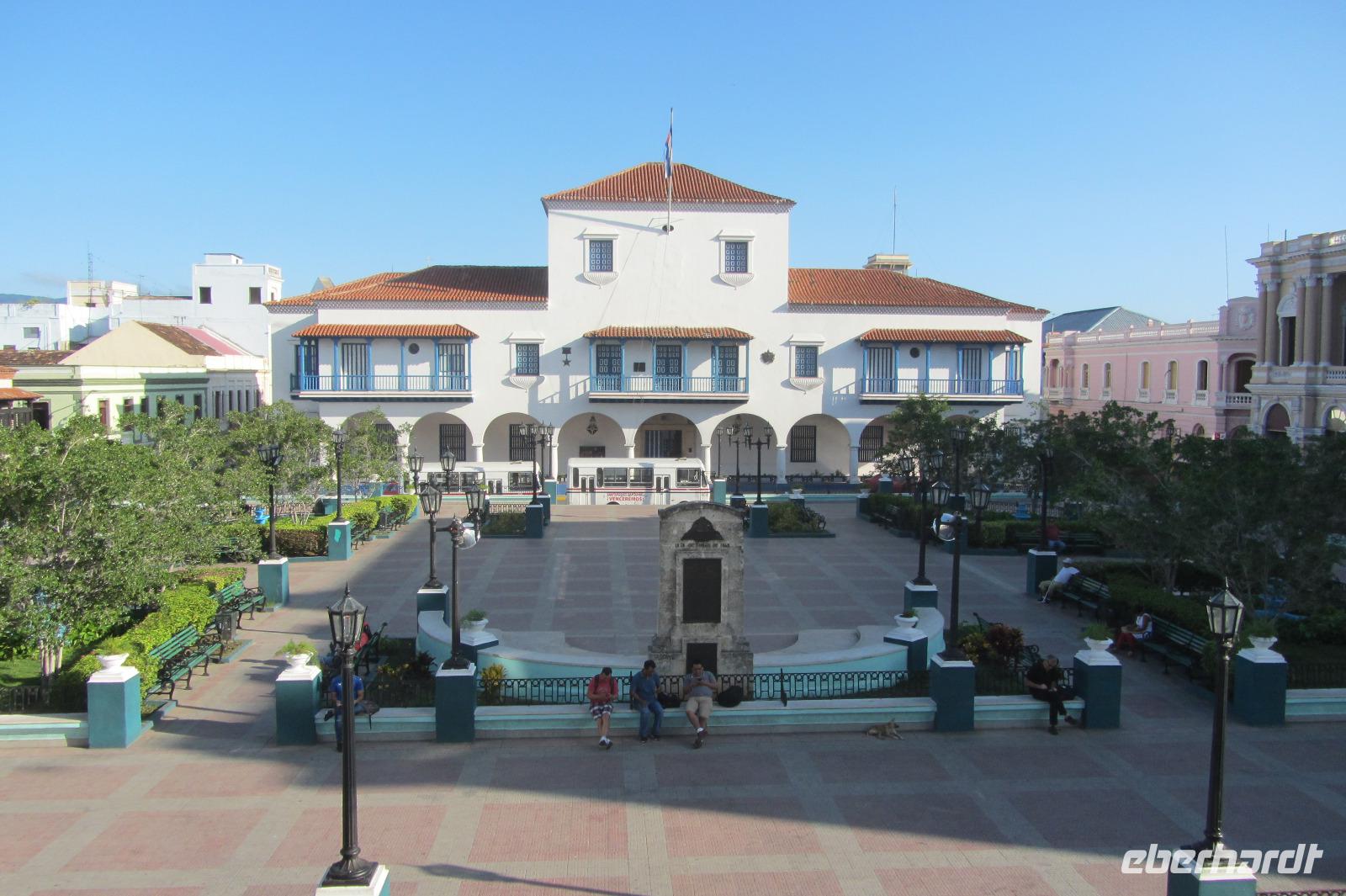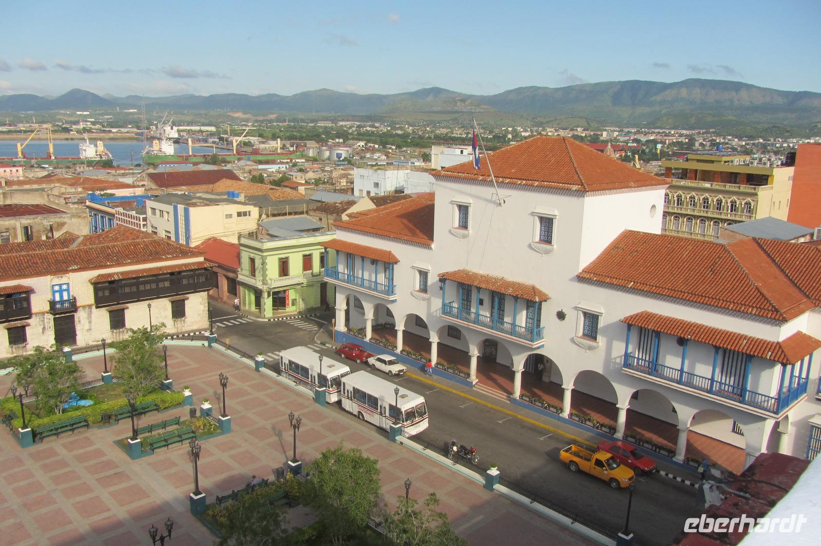 Um 2 Uhr früh klingelt unser Wecker, denn der Inlandsflug nach Santiago de Cuba geht bereits um 6 Uhr. Nach einem kleinen Frühstück im Hotel fahren wir wieder Richtung Flughafen. Pünktlich fliegen wir mit der Airline Cubana nach Santiago de Cuba. Manch einer sagt, auf dem Flug haben wir einen der besten Kaffees der Reise getrunken. Von oben bewundern wir bei Sonnenaufgang einen tollen Überblick über das Land. Kurz vor Landung überfliegen wir die Sierra Maestra und die Karibikküste. In Santiago de Cuba angekommen, begrüßt uns unser Busfahrer Emilio. Bei der Fahrt in die Innenstadt erhalten wir einen ersten Eindruck von der Stadt: viele Autos und Oldtimer, Menschenmassen auf den Straßen - das ist Kubas lebendige Hauptstadt des Ostens. Wir beginnen gleich mit den Erkundungen der Stadt. Wir halten am Platz der Revolution, wie es ihn in jeder größeren Stadt des Landes gibt. Unser Stadtrundgang beginnt am Plaza Mayor, wo wir die Kathedrale bewundern und die Stimmung der Stadt einfangen. Auf dem Platz spielt eine Musik-Band. Auf der Dachterrasse des Hotels Casa Granda genießen wir unseren ersten Cocktail und den tollen Blick über die Stadt. Wir bummeln durch die Gassen und erleben das bunte Treiben und bewundern die mehr oder wenig erhaltenen kolonialen Häuser