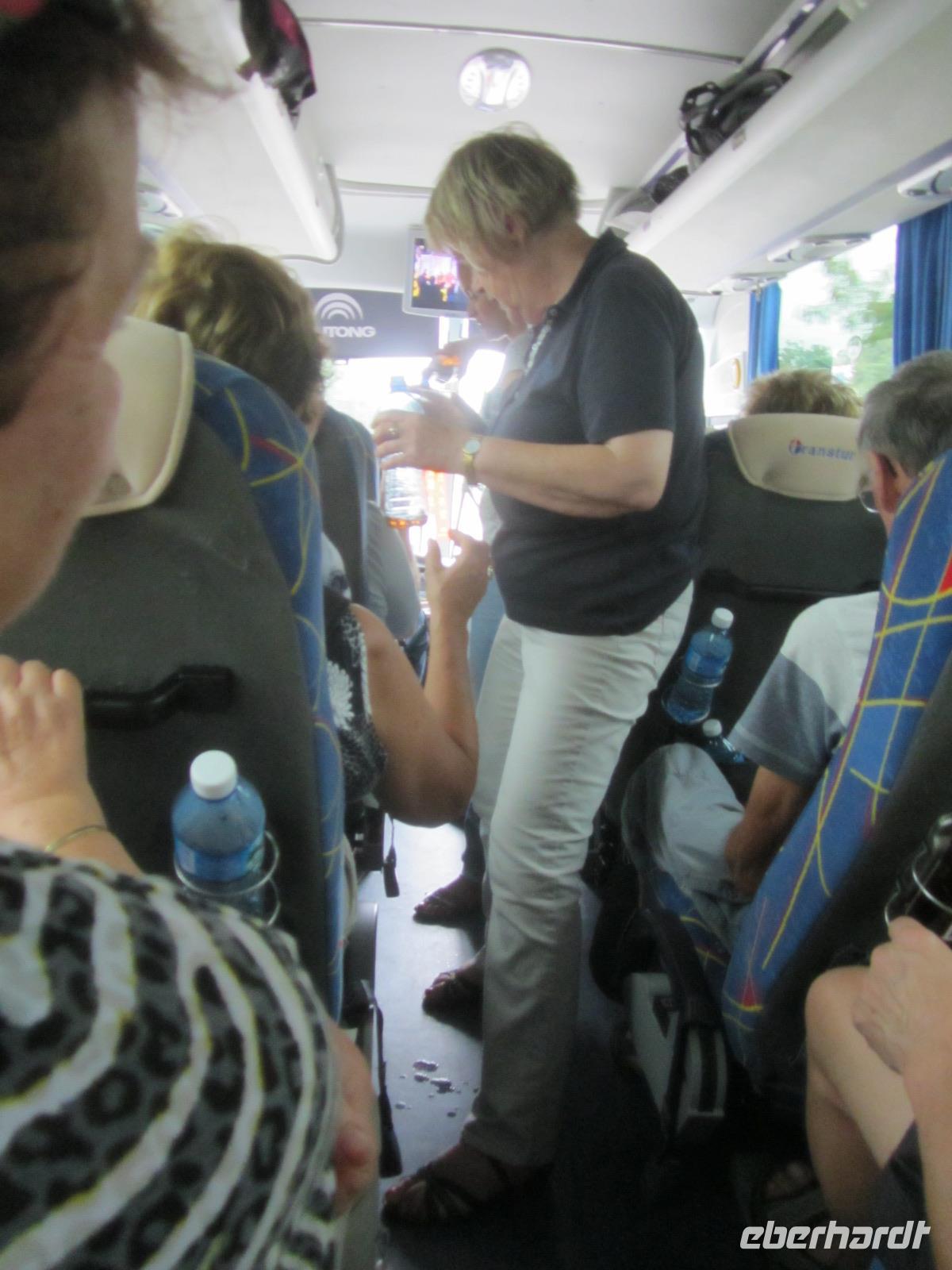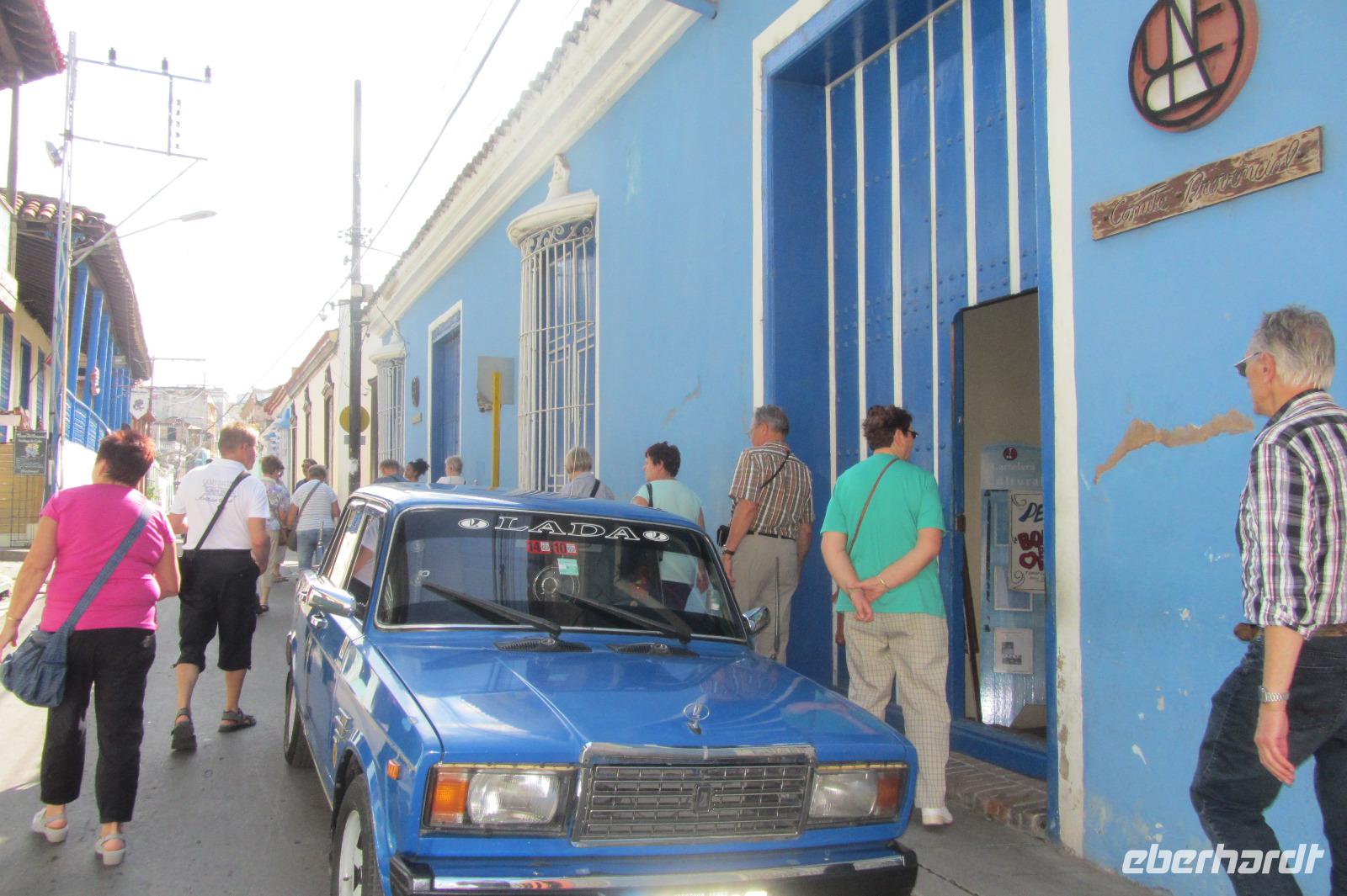 Weiter fahren wir zu einer Guayabita-Likör-Fabrik. Leider wird nicht produziert, da die Fabrik gerade keine Flaschen hat. Trotzdem verkosten wir den Likör und nehmen natürlich auch eine Flasche für die Verkostung im Bus mit. Eberhardt hat uns aus der Töpferei in Cienfuegos Becher spendiert und nun können wir im Bus die verschiedensten Sorten Rum verkosten.