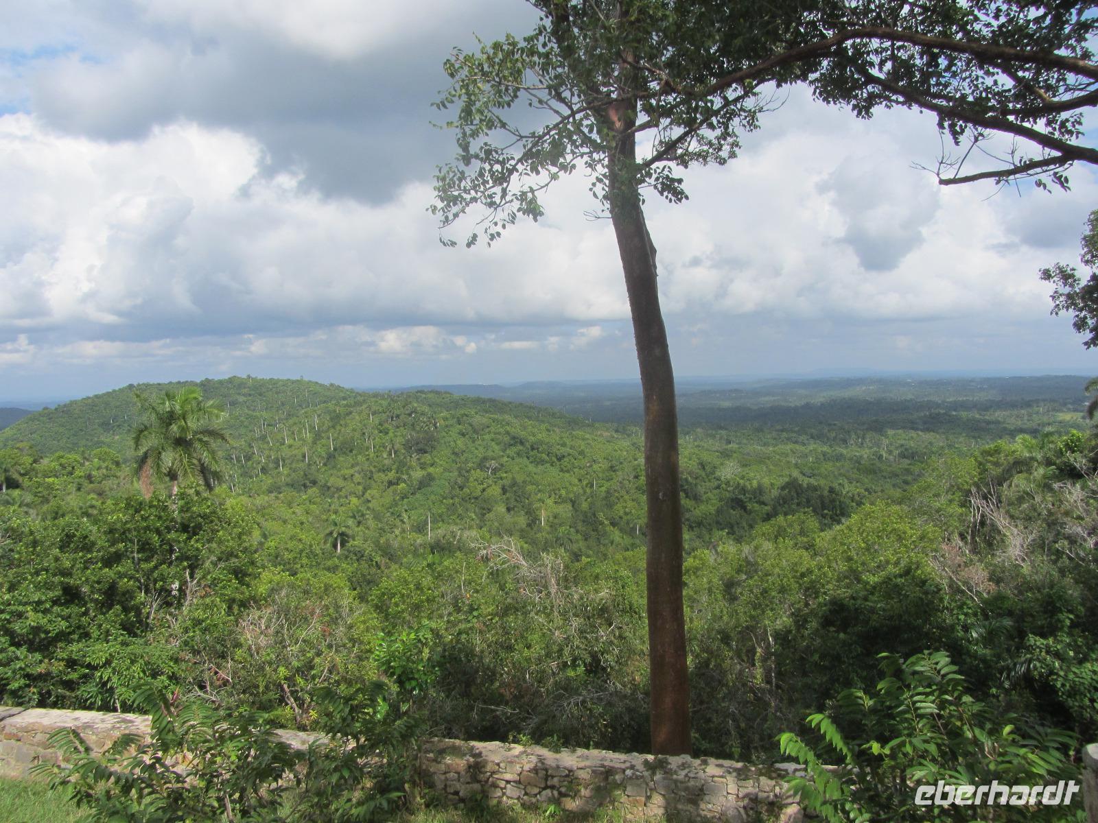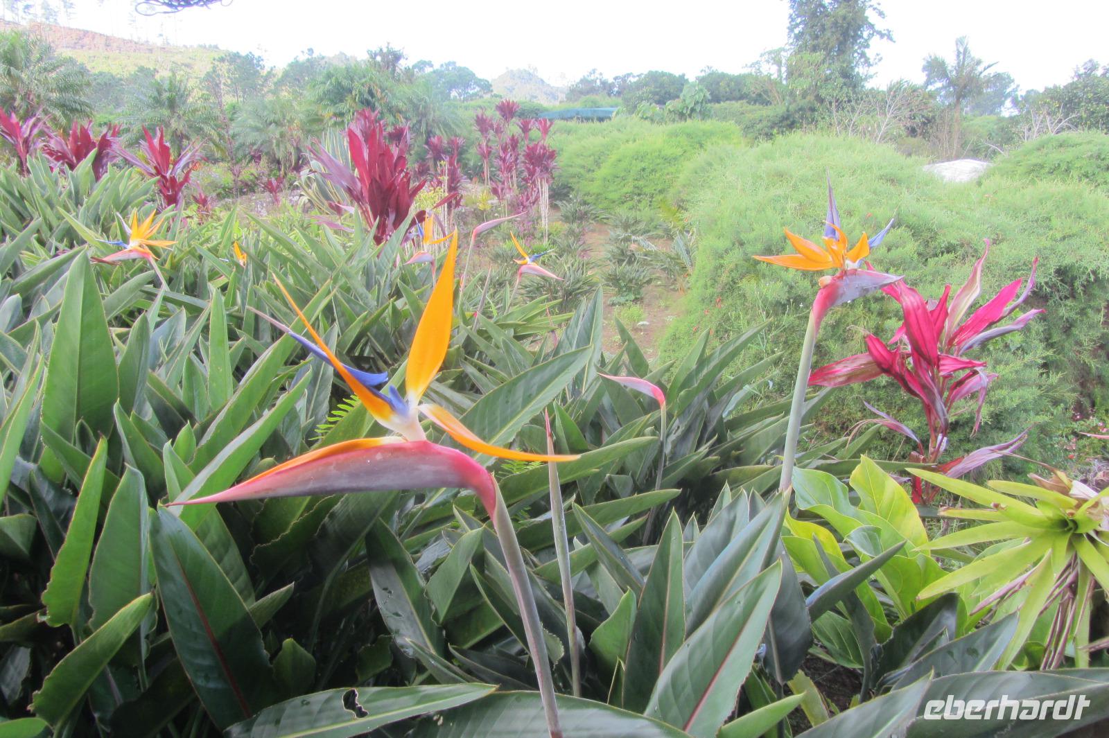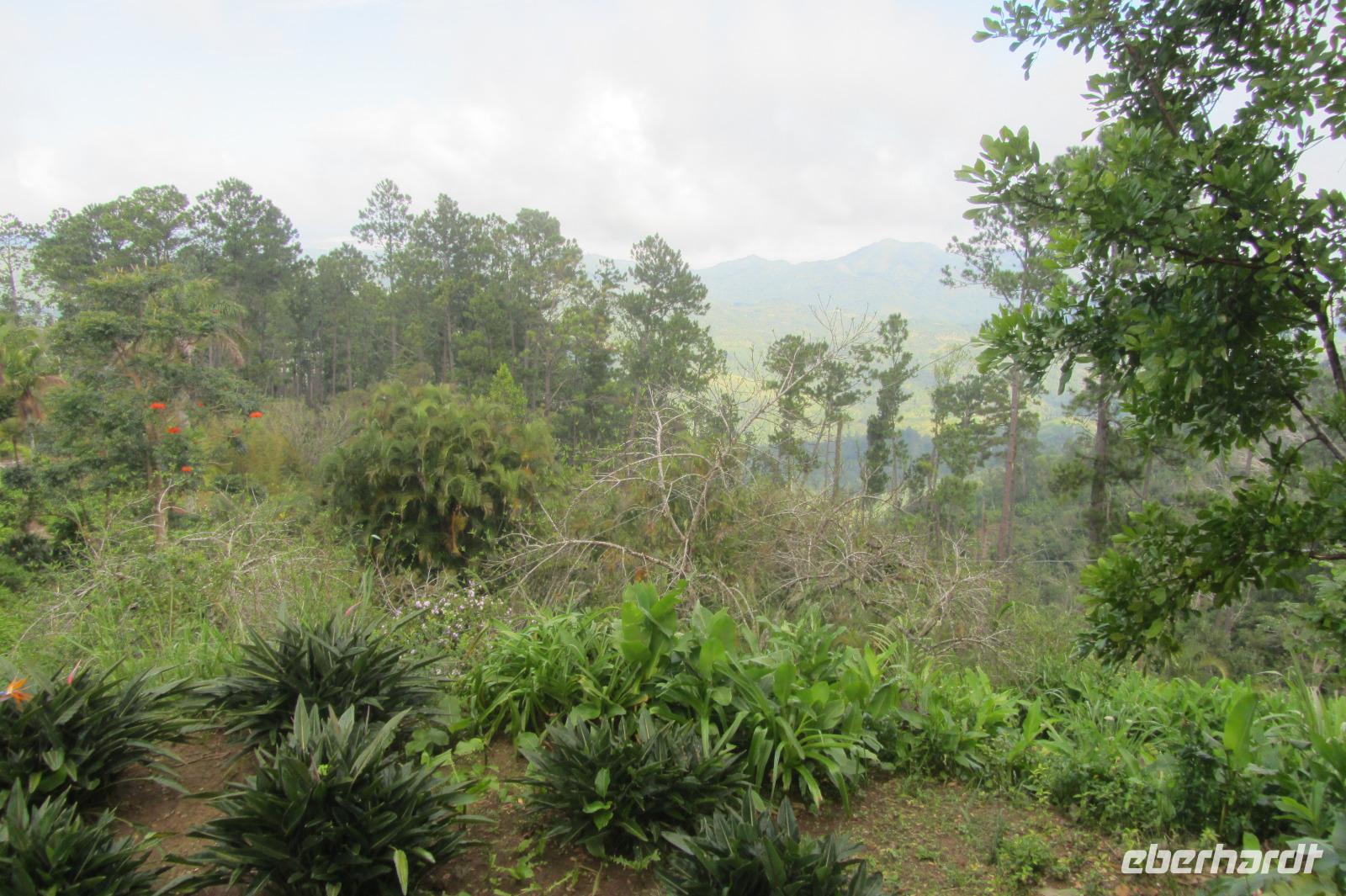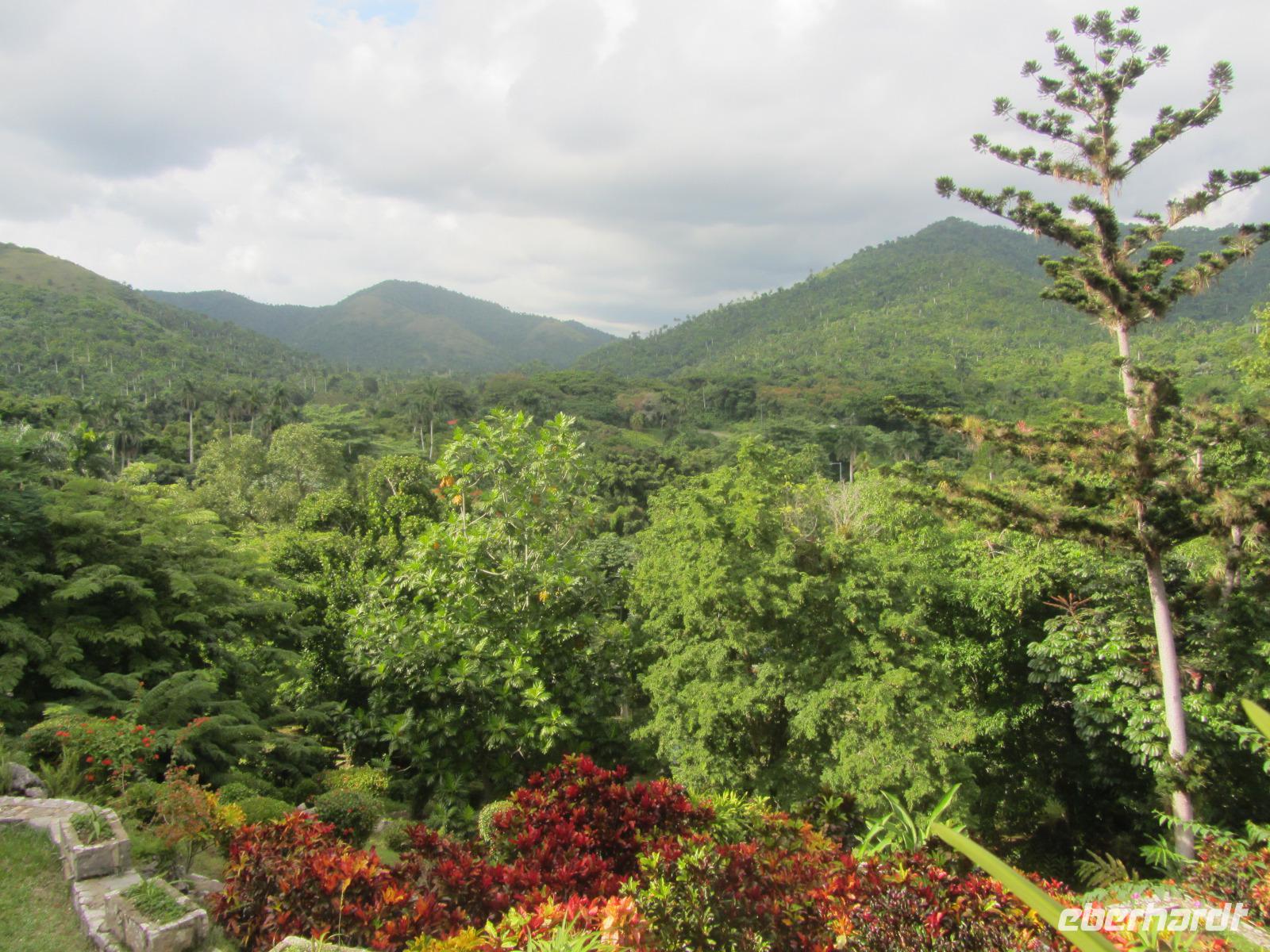 Den Plan nach Osten weiter zu fahren hat uns leider ein Hurrikan durchkreuzt, der vor zwei Wochen starke Verwüstungen in Baracoa angerichtet hat. Deshalb bleiben wir in Santiago de Cuba und unternehmen einen Ausflug in die Umgebung. Wir fahren Richtung Osten und stoppen zuerst am Fuße des Gran Piedra an einer Straße. Nach einem kurzen Spaziergang erreichen wir einen botanischen Garten „Jardin Botanico", wo wir eine eine kleine Führung erhalten. Wir bewundern zahlreiche Bromelien, Hibiskus-Blüten, Königspalmen und Orchideen. Der Garten liegt auf der Höhe von 1000 Metern.