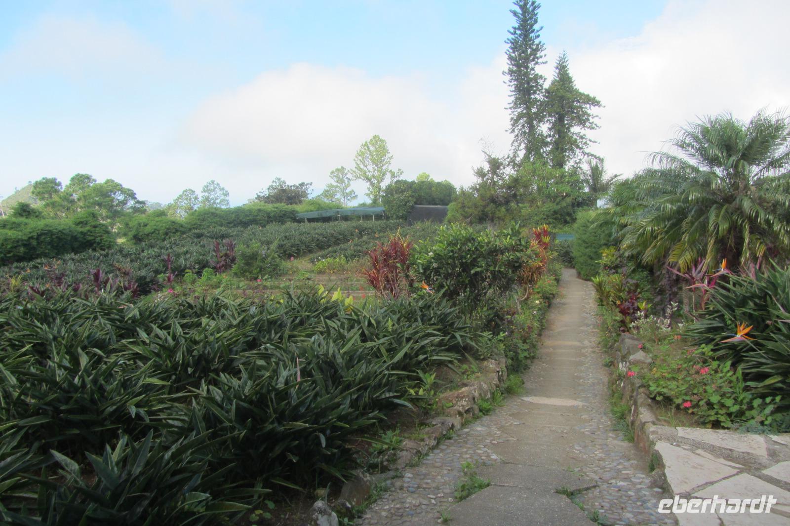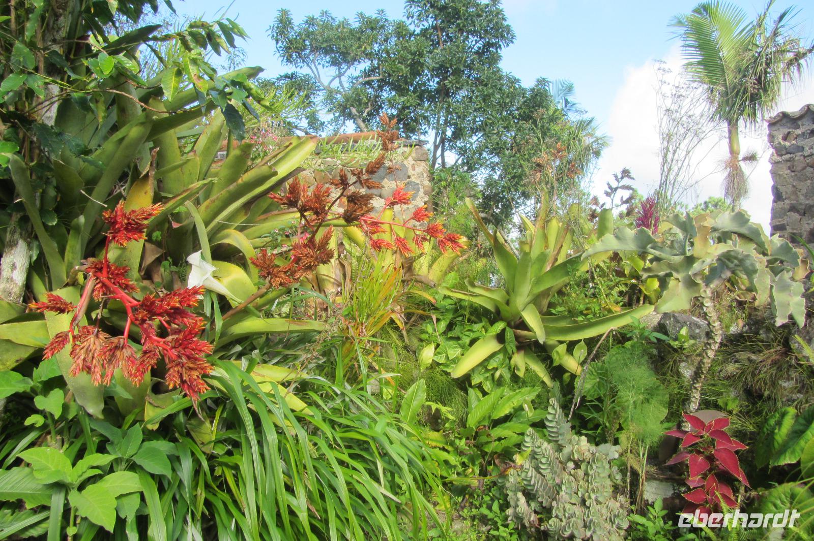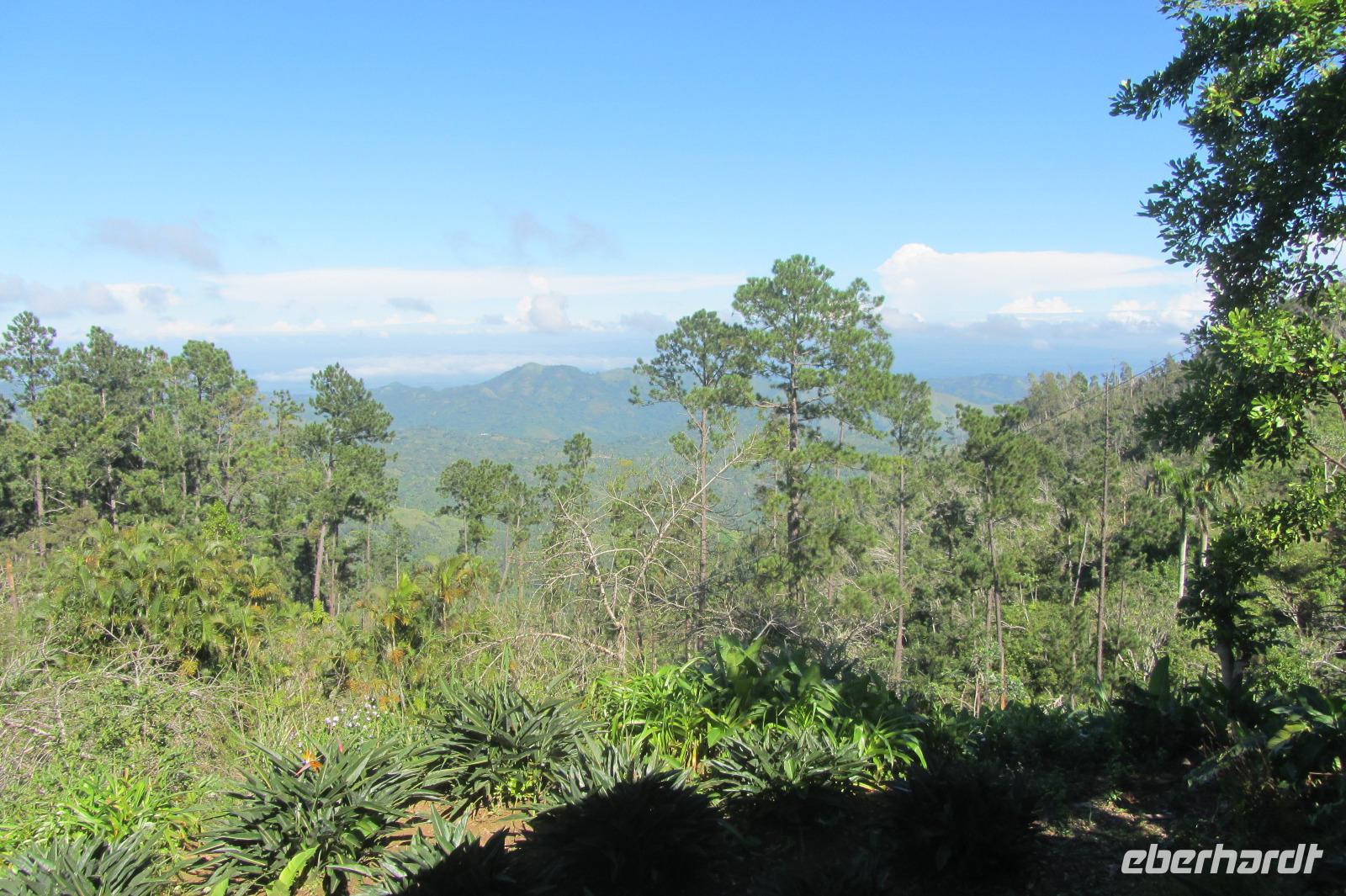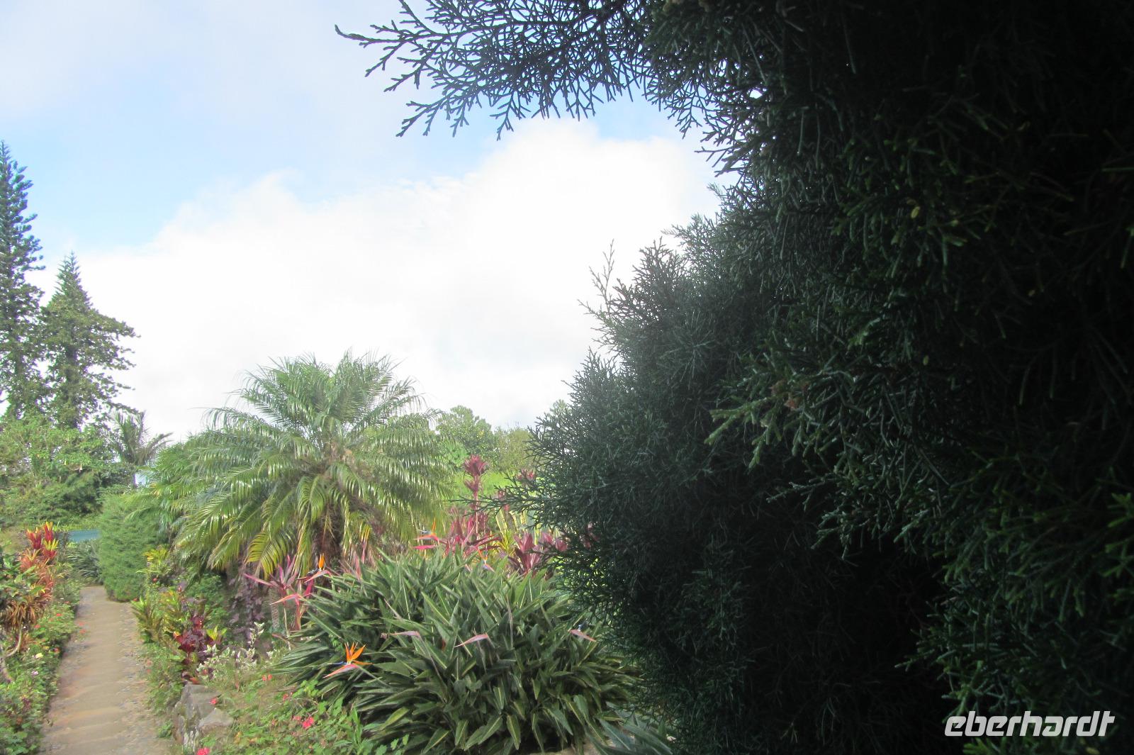 Den Plan nach Osten weiter zu fahren hat uns leider ein Hurrikan durchkreuzt, der vor zwei Wochen starke Verwüstungen in Baracoa angerichtet hat. Deshalb bleiben wir in Santiago de Cuba und unternehmen einen Ausflug in die Umgebung. Wir fahren Richtung Osten und stoppen zuerst am Fuße des Gran Piedra an einer Straße. Nach einem kurzen Spaziergang erreichen wir einen botanischen Garten „Jardin Botanico", wo wir eine eine kleine Führung erhalten. Wir bewundern zahlreiche Bromelien, Hibiskus-Blüten, Königspalmen und Orchideen. Der Garten liegt auf der Höhe von 1000 Metern.