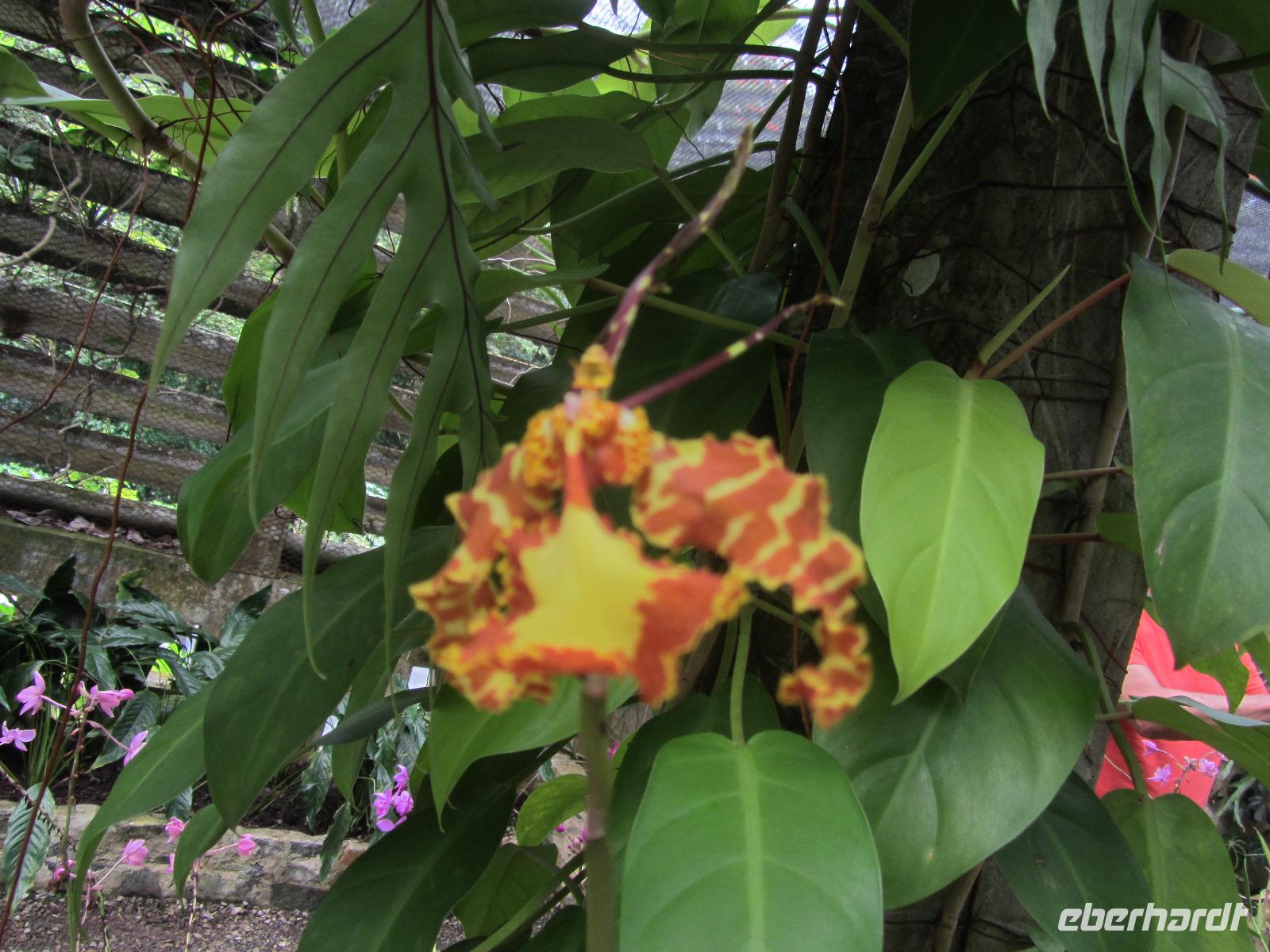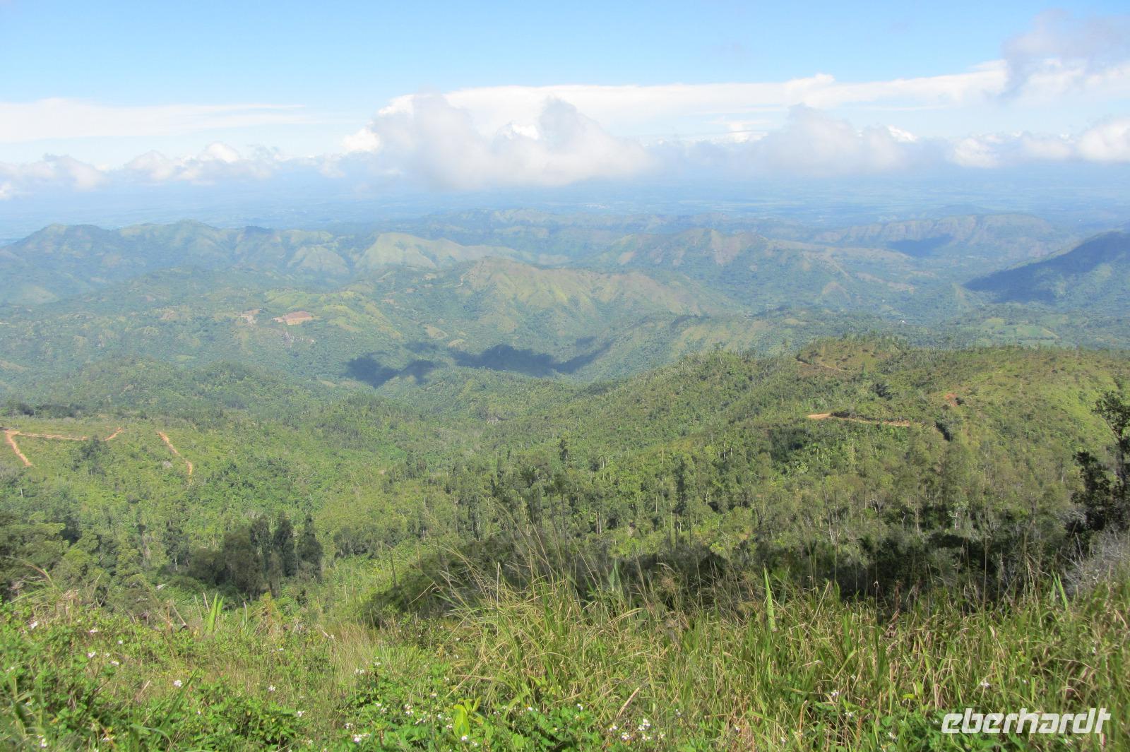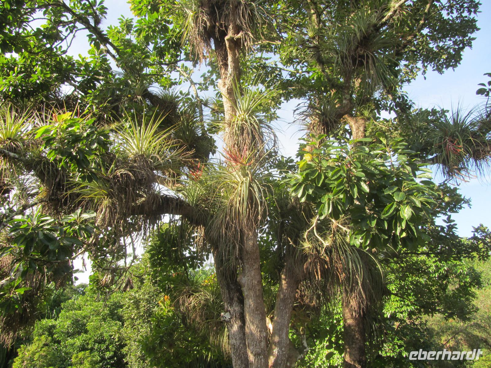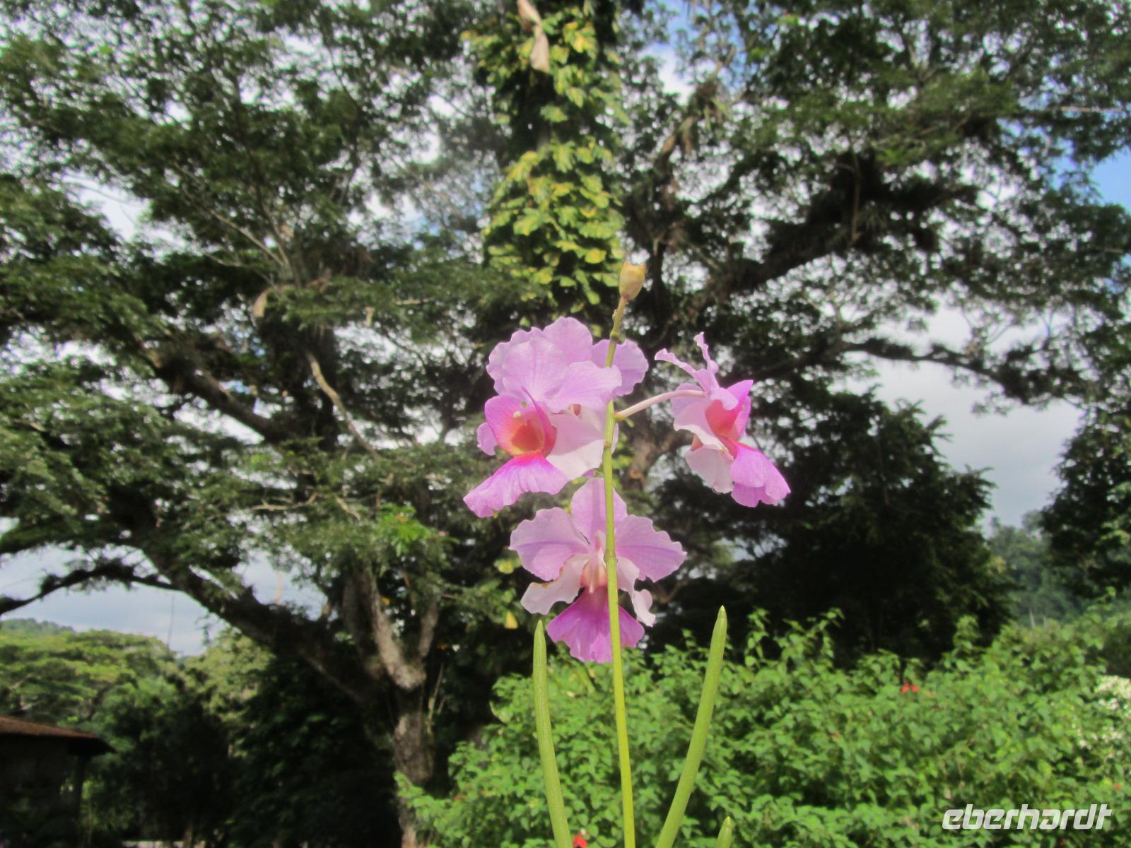 Den Plan nach Osten weiter zu fahren hat uns leider ein Hurrikan durchkreuzt, der vor zwei Wochen starke Verwüstungen in Baracoa angerichtet hat. Deshalb bleiben wir in Santiago de Cuba und unternehmen einen Ausflug in die Umgebung. Wir fahren Richtung Osten und stoppen zuerst am Fuße des Gran Piedra an einer Straße. Nach einem kurzen Spaziergang erreichen wir einen botanischen Garten „Jardin Botanico", wo wir eine eine kleine Führung erhalten. Wir bewundern zahlreiche Bromelien, Hibiskus-Blüten, Königspalmen und Orchideen. Der Garten liegt auf der Höhe von 1000 Metern.