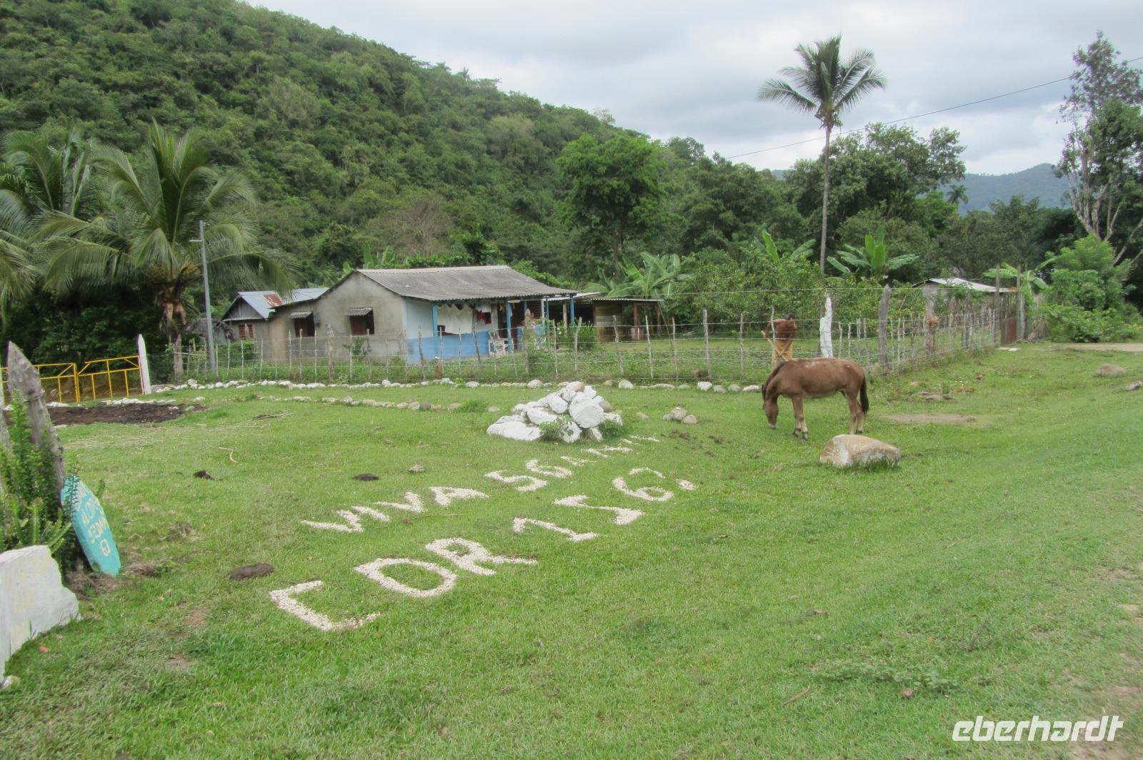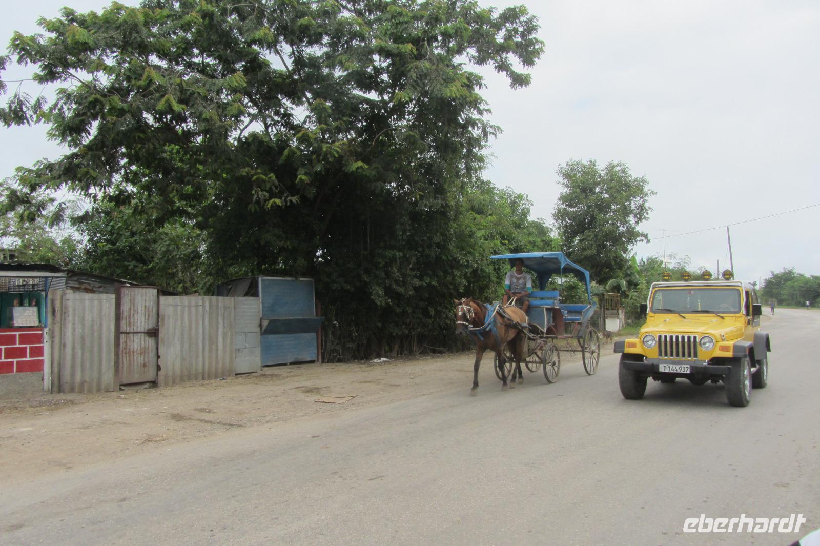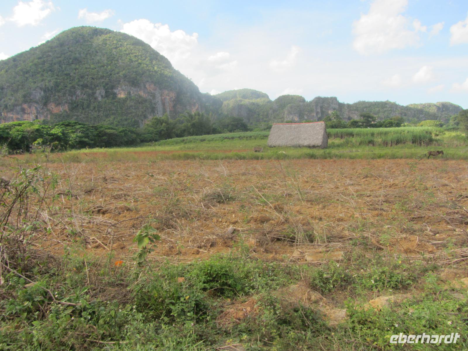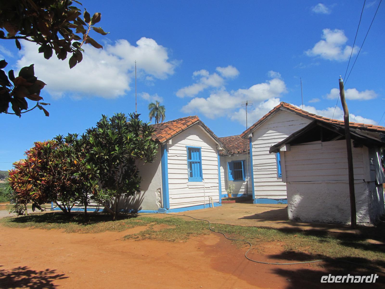 Heute verlassen wir unser Strand-Hotel und fahren in Richtung Berge. Wir kamen auf einem Betriebshof an und warteten auf die Dinge, die da kommen. In der Wartezeit erzählte uns Elke viel über die Geographie von Kuba und wir besuchten das gegenüber liegende private Wohnhaus mit Garten, in dem wir eine Boniato ernten, die wir später zu Mittag verkosteten. Nach kubanischen 15 Minuten stiegen wir in den Bus und fahren in Richtung Gebirge. Unser Bus hat dabei ganz schön zu tun, den unebenen Weg zu passieren.
