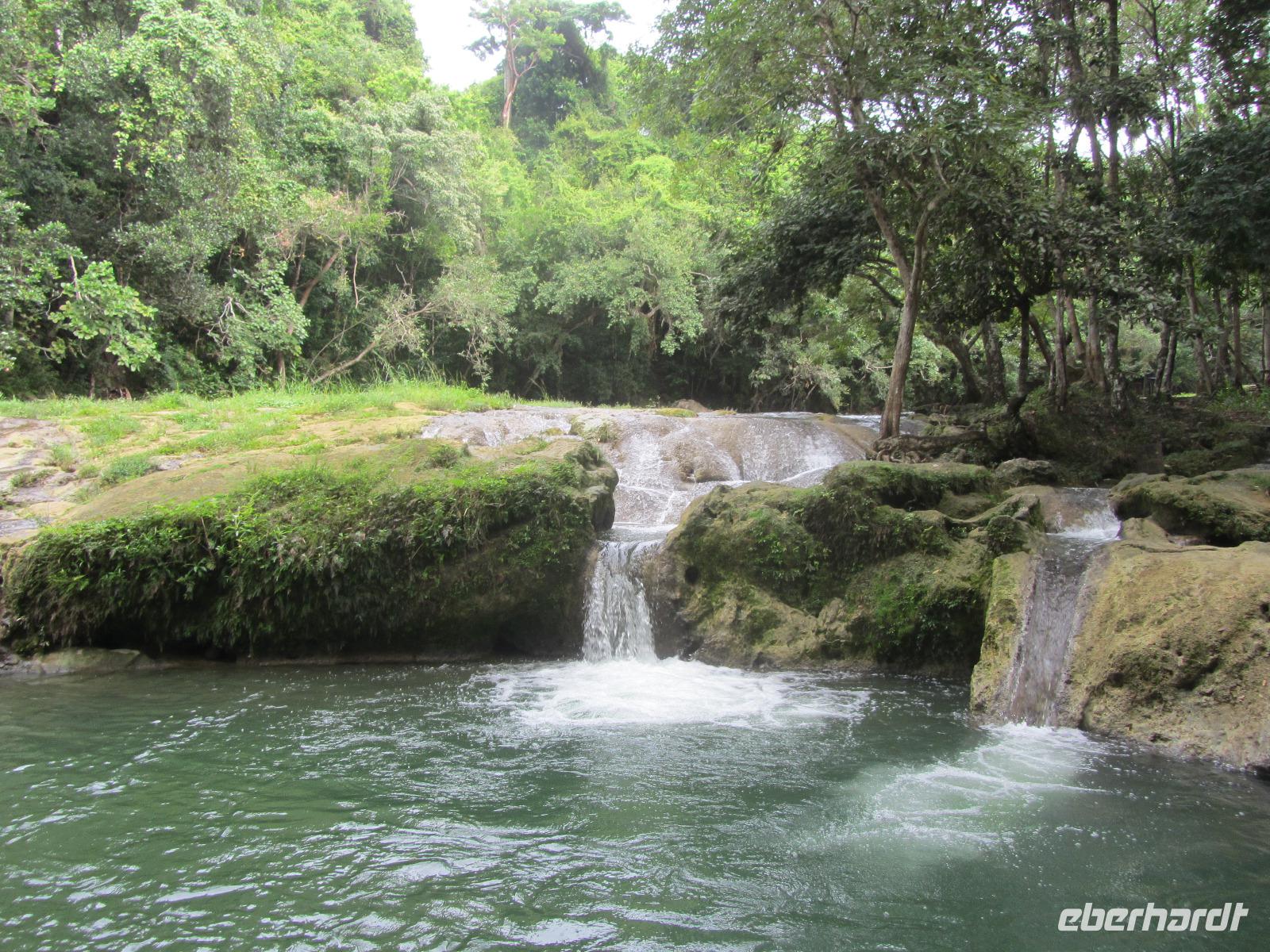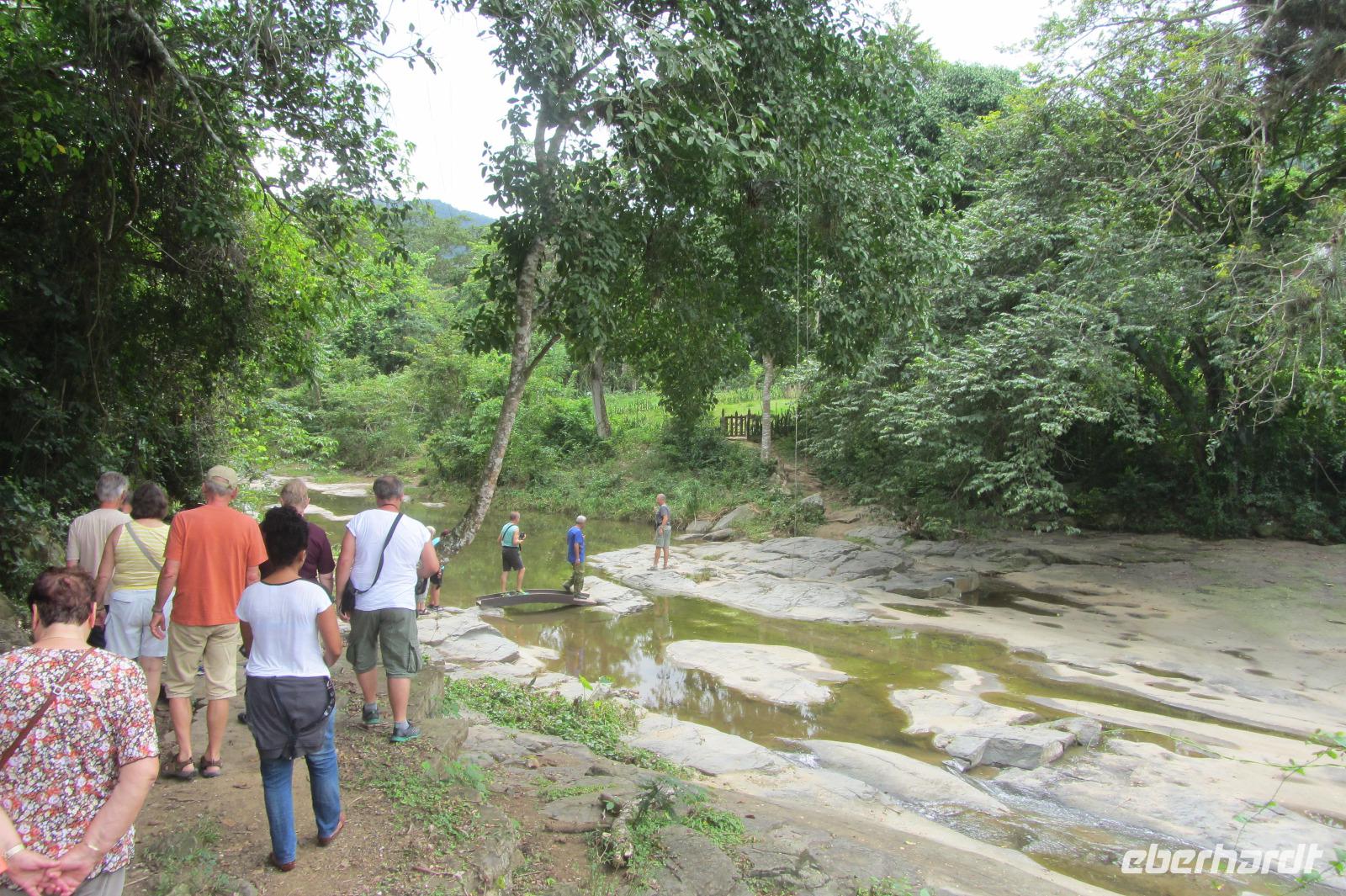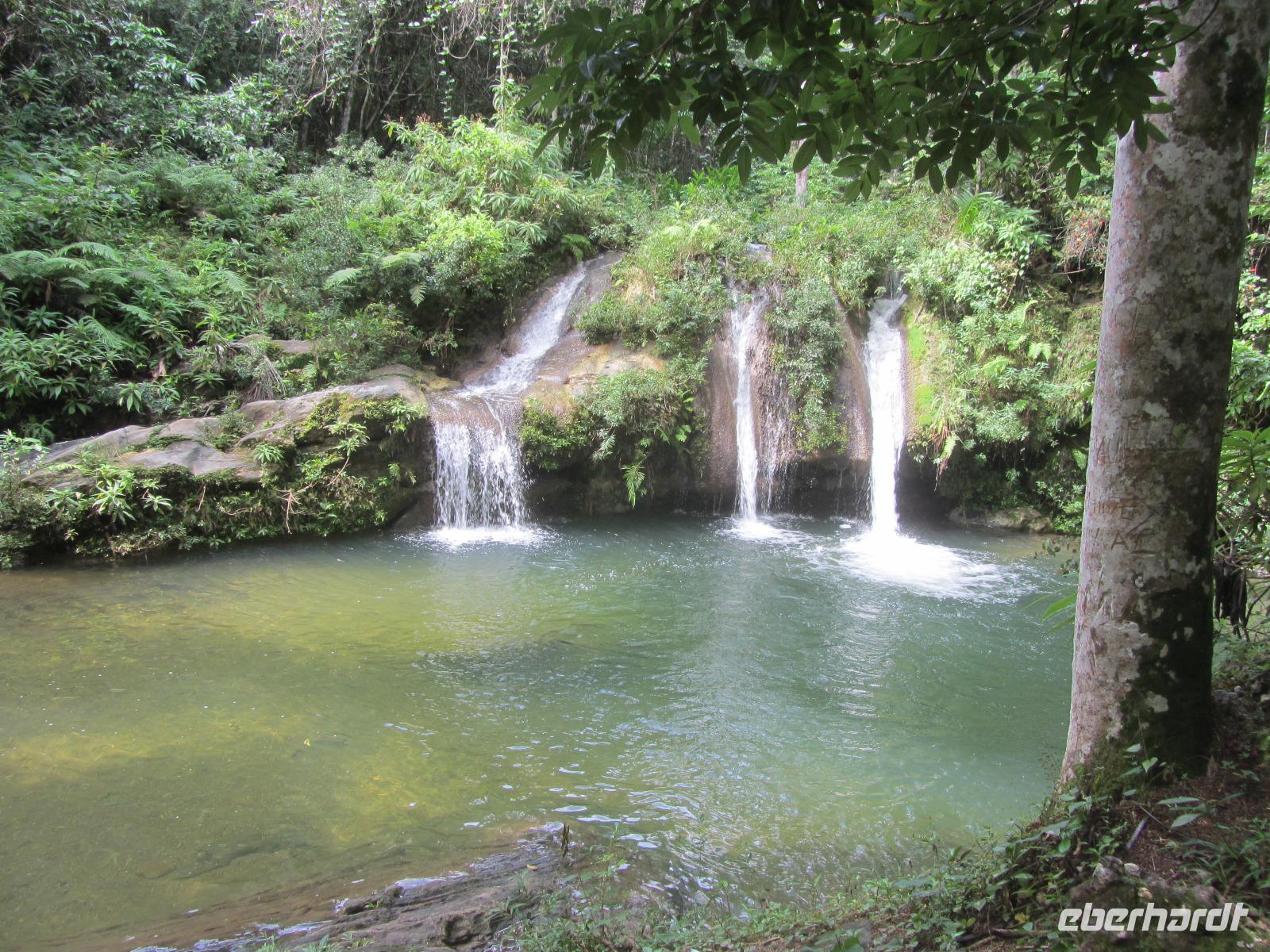 Es geht weiter durch den Wald, vorbei an Mandelbäumen, Mahagonibäumen, dem rotfärbenden Orleansbaum, dem Stachelrindenbaum und an mit zahllosen Bromelien besetzten meterhohen Bäumen bis wir am Ende der Wanderung an einem kleinen Wasserfall gelangen. Schon etwas müde erreichen wir den Wasserfall Cascada Bella, wo wir uns endlich erfrischen können. Die Abkühlung tut sehr gut, die Wanderung war anstrengend, besonders durch den schlammigen Boden.