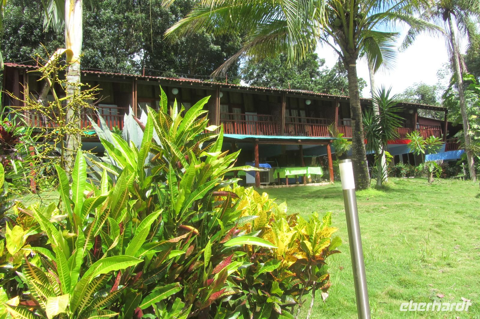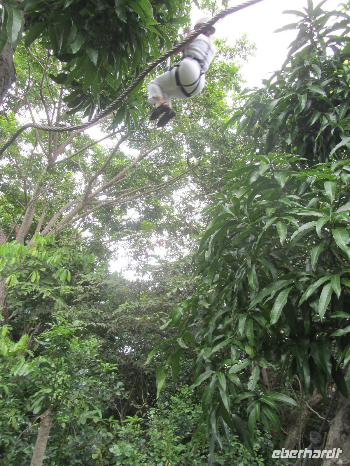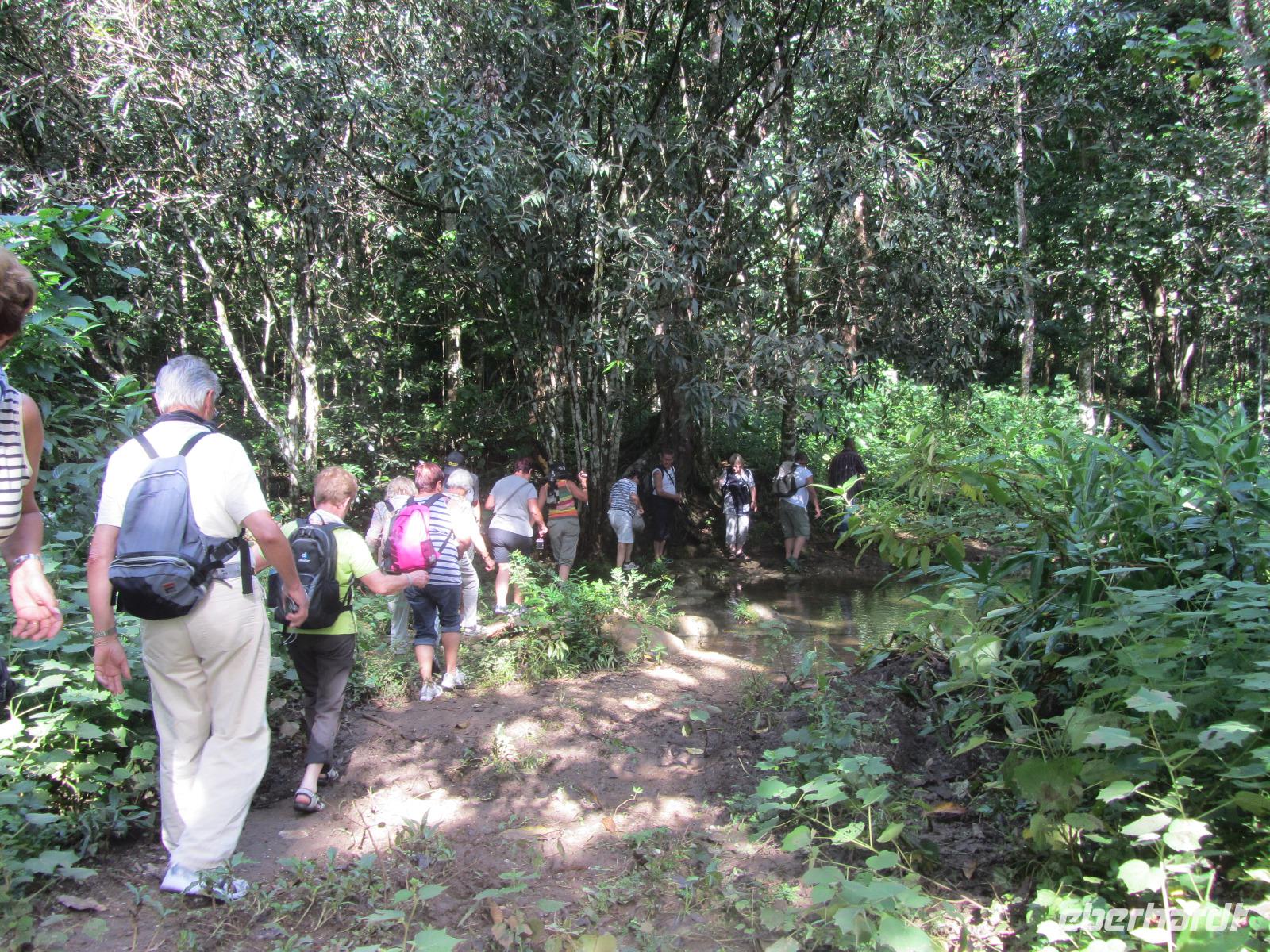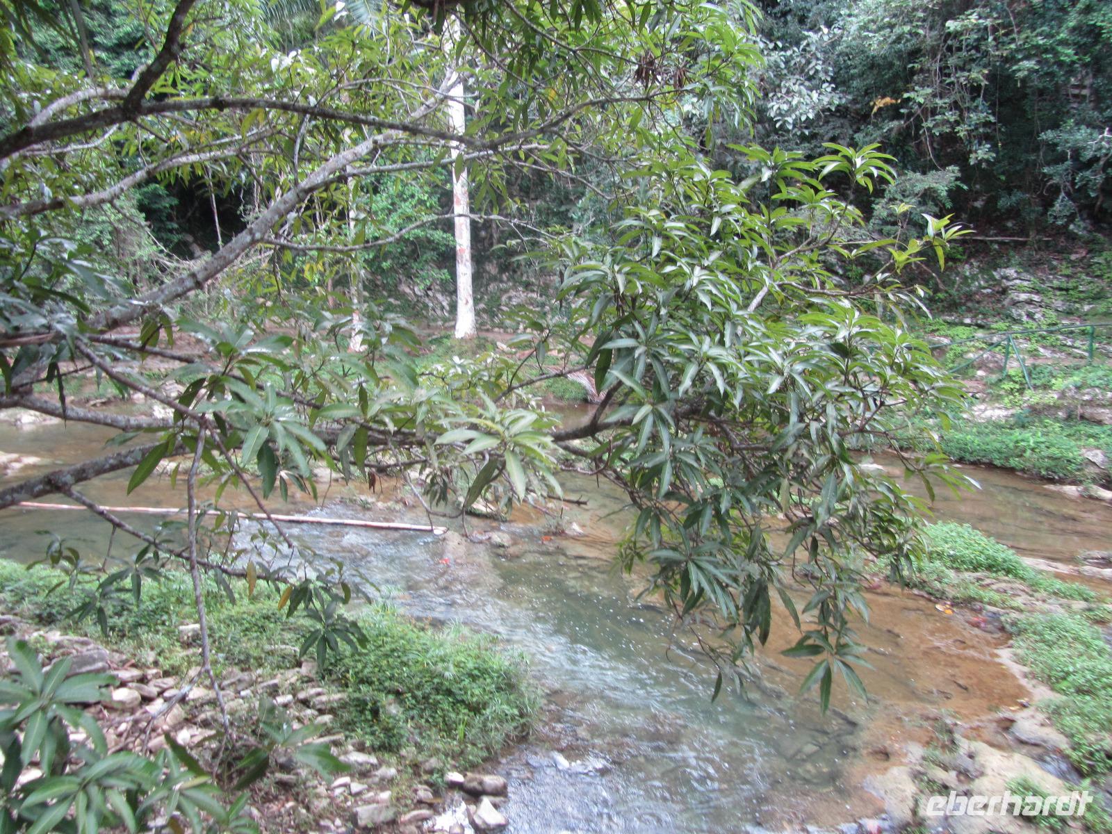 Es geht weiter durch den Wald, vorbei an Mandelbäumen, Mahagonibäumen, dem rotfärbenden Orleansbaum, dem Stachelrindenbaum und an mit zahllosen Bromelien besetzten meterhohen Bäumen bis wir am Ende der Wanderung an einem kleinen Wasserfall gelangen. Schon etwas müde erreichen wir den Wasserfall Cascada Bella, wo wir uns endlich erfrischen können. Die Abkühlung tut sehr gut, die Wanderung war anstrengend, besonders durch den schlammigen Boden.