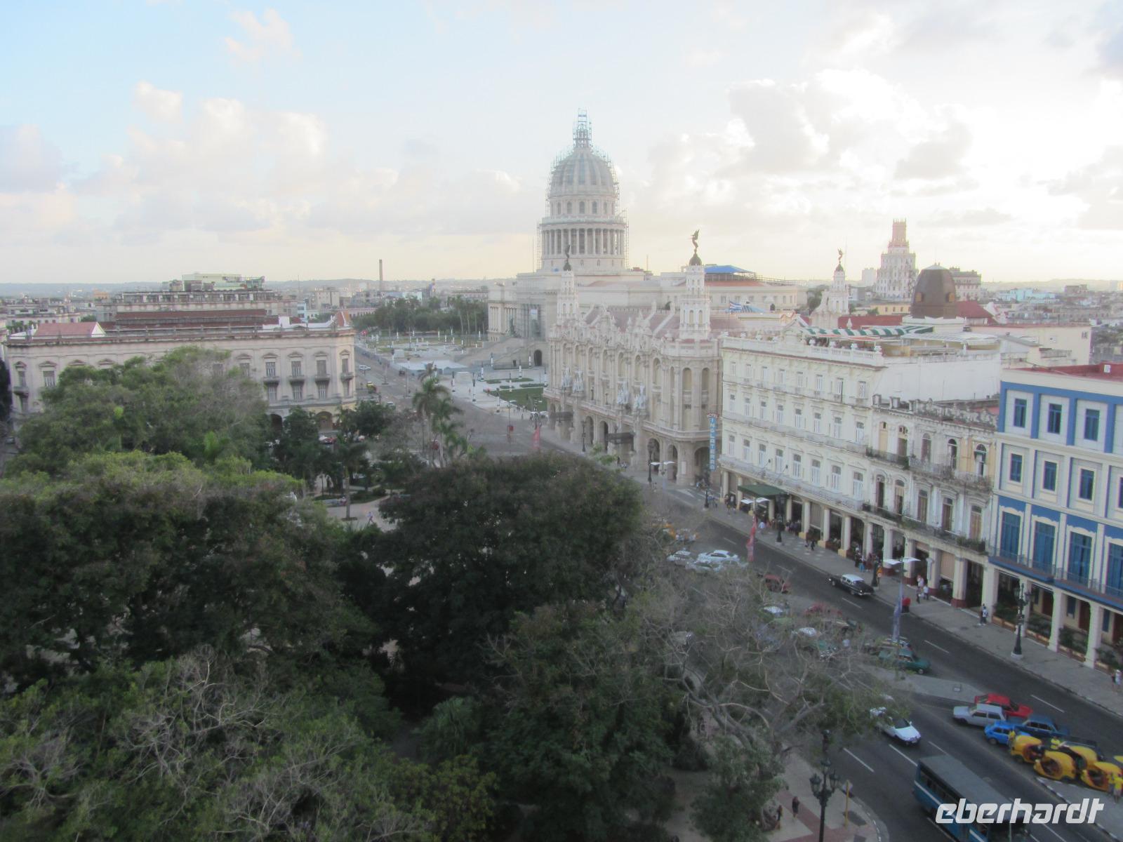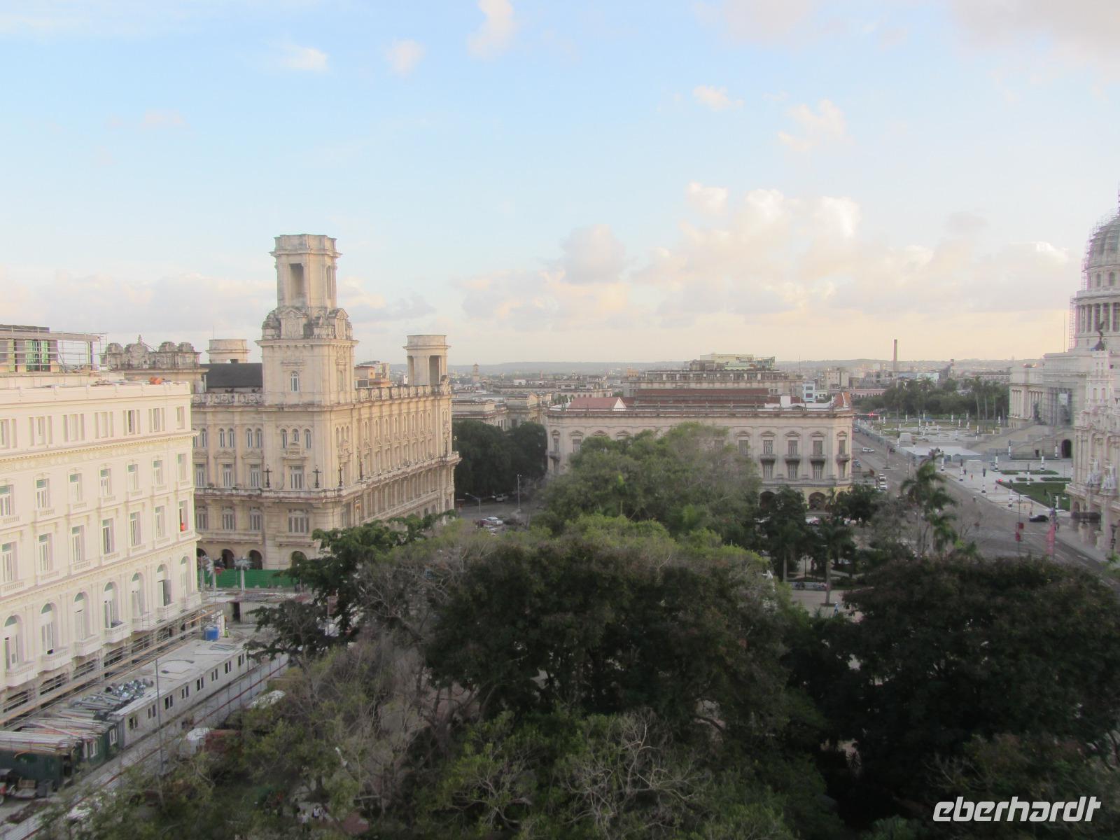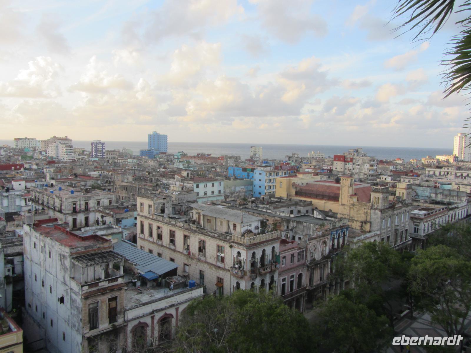 Heute beginnt unsere Reise nach Kuba. Tief in der Nacht werden viele zu Hause abgeholt und wir treffen und um 4 Uhr morgens am Flughafen Berlin-Tegel. Der Flieger der KLM geht pünktlich nach Amsterdam, wo wir die Düsseldorfer Gäste unserer Gruppe treffen. Von hier starten wir erwartungsvoll unseren Langstreckenflug nach Havanna. Was wird uns wohl erwarten? Dass das Leben auf Kuba sich verändern wird durch die Öffnung nach Amerika und es einen großen Ansturm von Touristen auf Kuba gibt, wissen wir bereits. Wie das genau aussieht und welche Folgen das hat, das wollen wir herausfinden. Vom Personal der KLM werden wir auf unserem 10 Stunden Flug mit zwei Mahlzeiten und sogar Eis verwöhnt. In Havanna angekommen, müssen wir uns in kubanischer Gelassenheit üben, denn wir müssen nach der Einreiseprozedur noch über eine Stunde auf unsere Koffer warten. Doch alles geht gut und so fahren wir wenige Augenblicke später mit unserer kubanischen Reiseleiterin Marvilevis und einem Busfahrer durch die Vororte Havannas ins Zentrum. Uns begleitet und führt außerdem Dr. Elke Knappe, die lange auf Kuba gelebt hat und die uns an ihren Erfahrungen teilhaben lässt. Auf dem Weg in unser Hotel tauschen wir noch Geld und bekommen unsere ersten CUC, die Touristen-Währung, bevor wir im Hotel Capri einchecken. Am Abend nehmen wir gemeinsam noch ein leichtes Abendessen ein und genießen den herrlichen Ausblick vom Restaurant im obersten Stock unseres Hotels. Hier haben wir einen ersten Ausblick auf Havanna.
