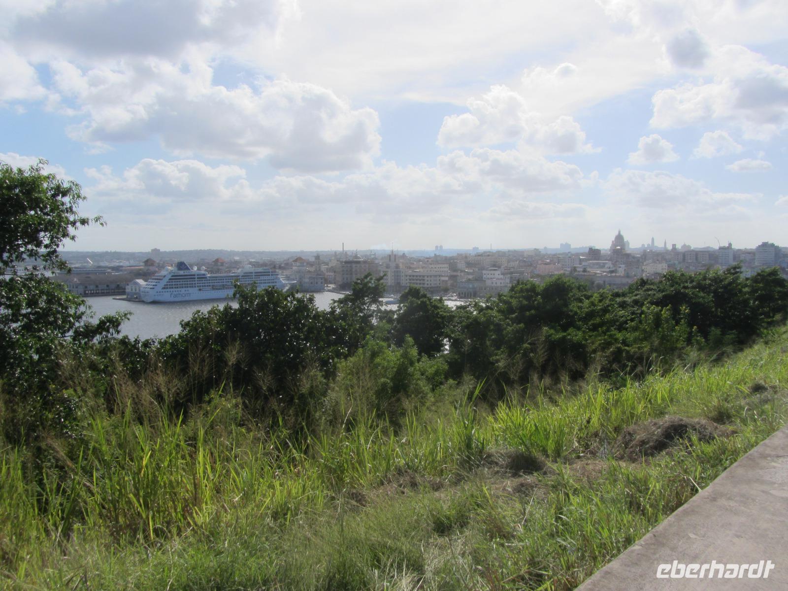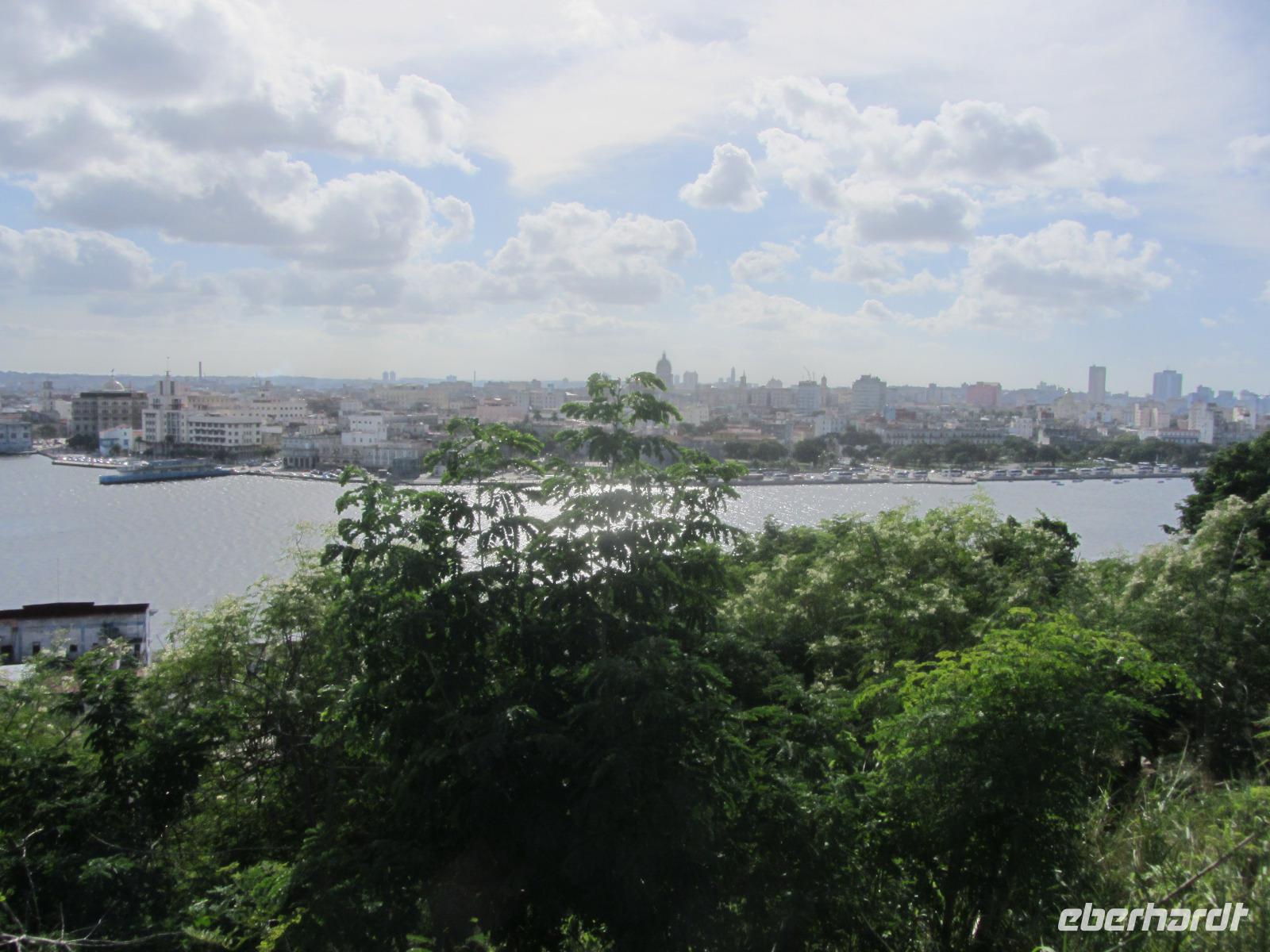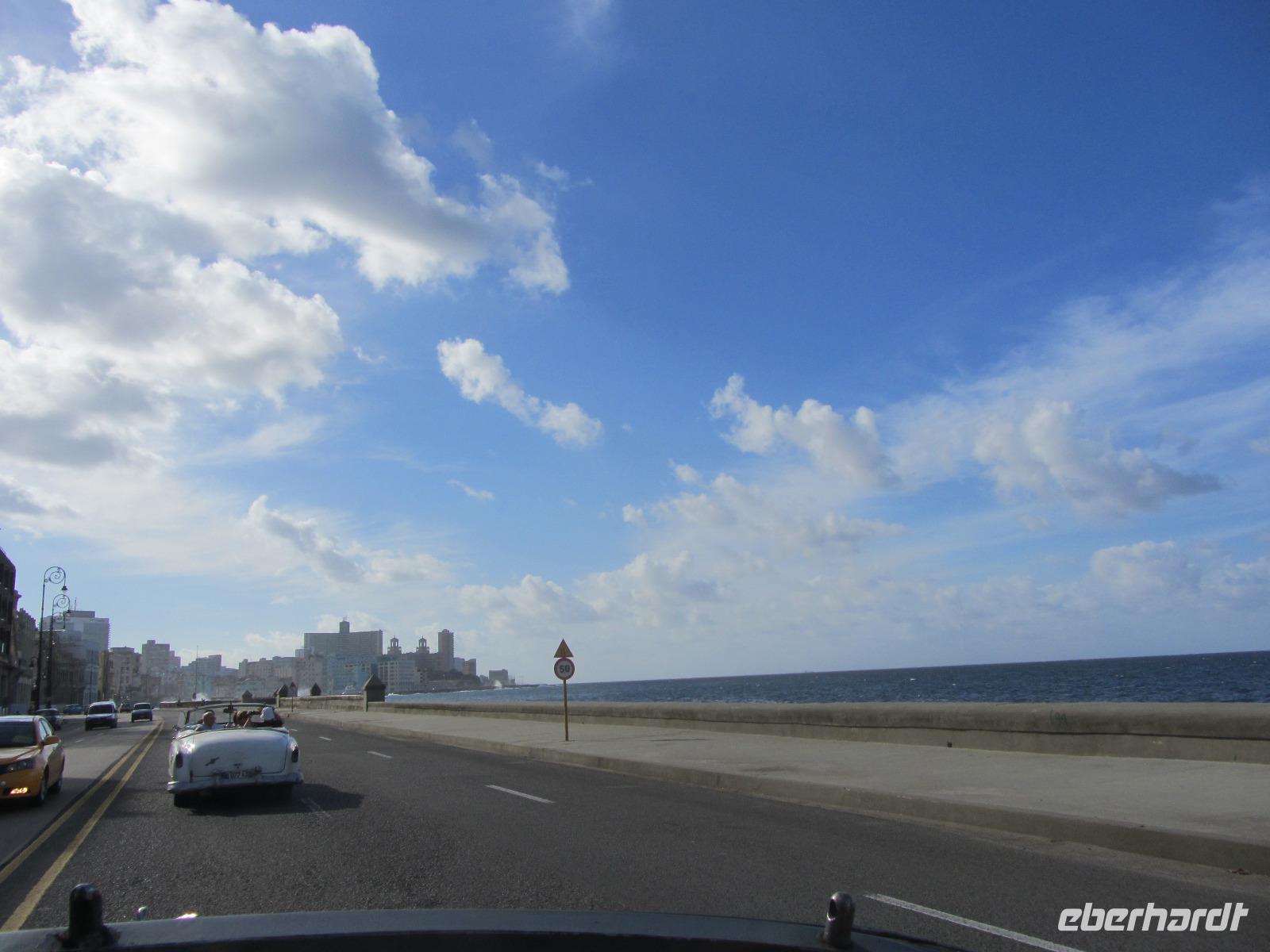 Heute beginnt unsere Reise nach Kuba. Tief in der Nacht werden viele zu Hause abgeholt und wir treffen und um 4 Uhr morgens am Flughafen Berlin-Tegel. Der Flieger der KLM geht pünktlich nach Amsterdam, wo wir die Düsseldorfer Gäste unserer Gruppe treffen. Von hier starten wir erwartungsvoll unseren Langstreckenflug nach Havanna. Was wird uns wohl erwarten? Dass das Leben auf Kuba sich verändern wird durch die Öffnung nach Amerika und es einen großen Ansturm von Touristen auf Kuba gibt, wissen wir bereits. Wie das genau aussieht und welche Folgen das hat, das wollen wir herausfinden. Vom Personal der KLM werden wir auf unserem 10 Stunden Flug mit zwei Mahlzeiten und sogar Eis verwöhnt. In Havanna angekommen, müssen wir uns in kubanischer Gelassenheit üben, denn wir müssen nach der Einreiseprozedur noch über eine Stunde auf unsere Koffer warten. Doch alles geht gut und so fahren wir wenige Augenblicke später mit unserer kubanischen Reiseleiterin Marvilevis und einem Busfahrer durch die Vororte Havannas ins Zentrum. Uns begleitet und führt außerdem Dr. Elke Knappe, die lange auf Kuba gelebt hat und die uns an ihren Erfahrungen teilhaben lässt. Auf dem Weg in unser Hotel tauschen wir noch Geld und bekommen unsere ersten CUC, die Touristen-Währung, bevor wir im Hotel Capri einchecken. Am Abend nehmen wir gemeinsam noch ein leichtes Abendessen ein und genießen den herrlichen Ausblick vom Restaurant im obersten Stock unseres Hotels. Hier haben wir einen ersten Ausblick auf Havanna.