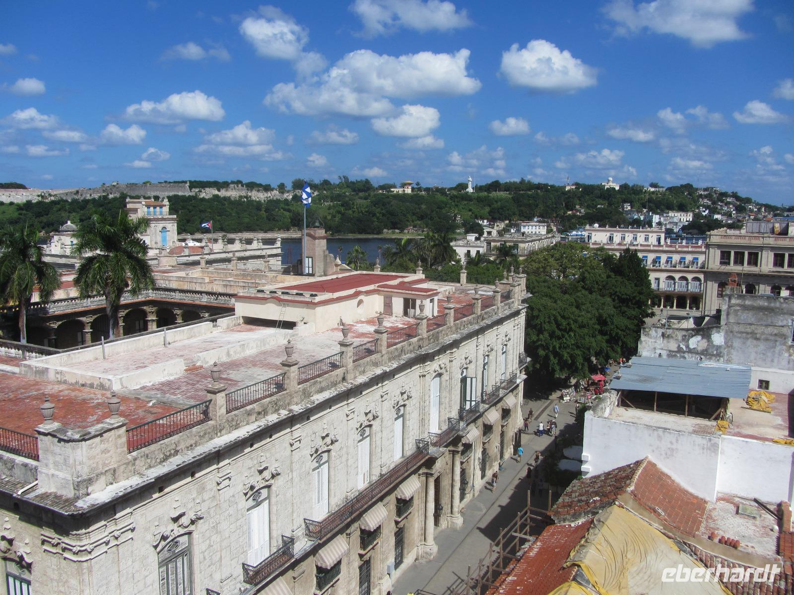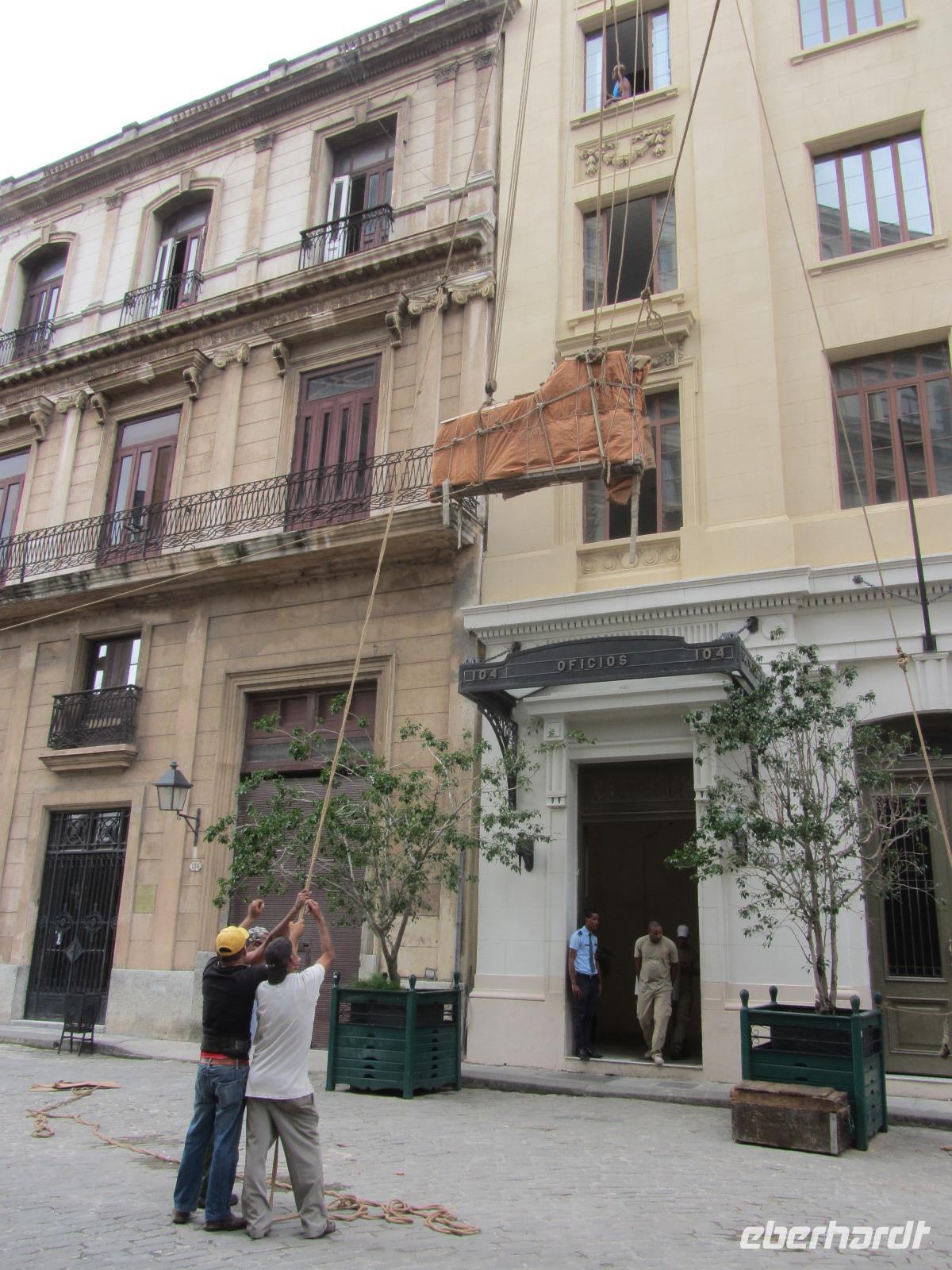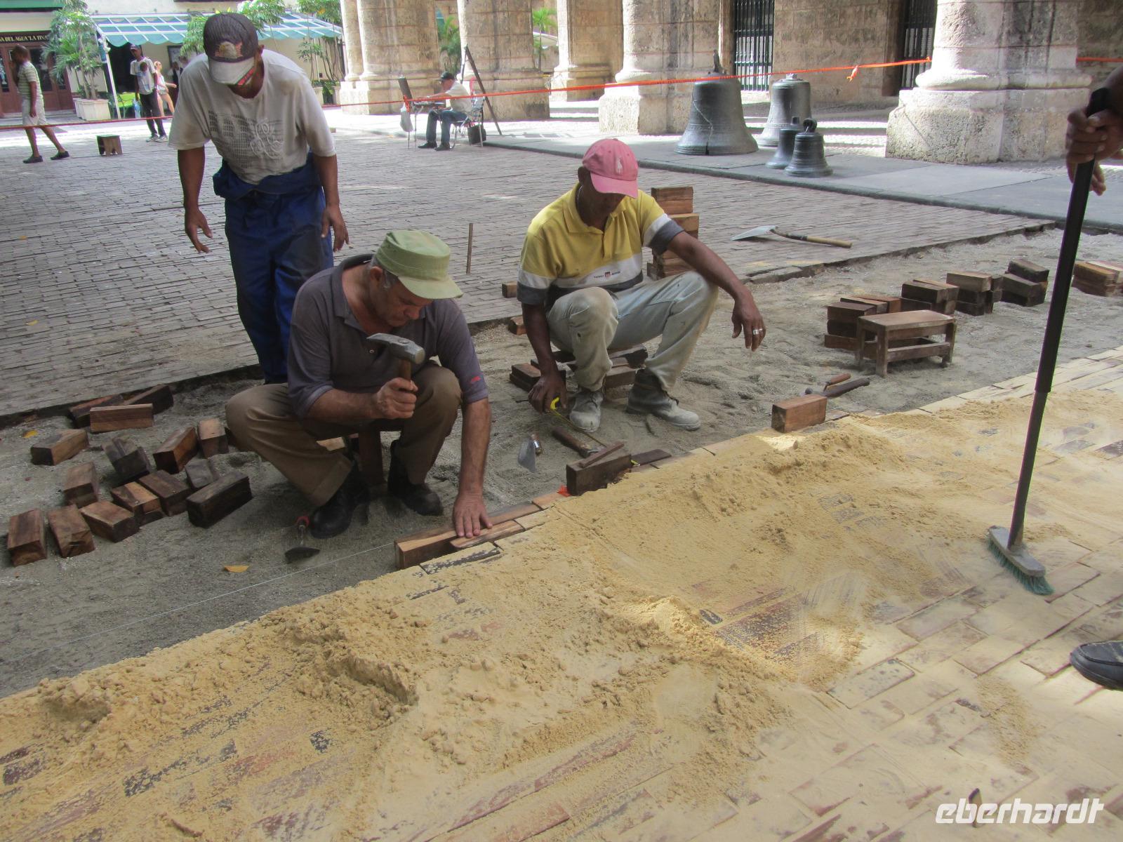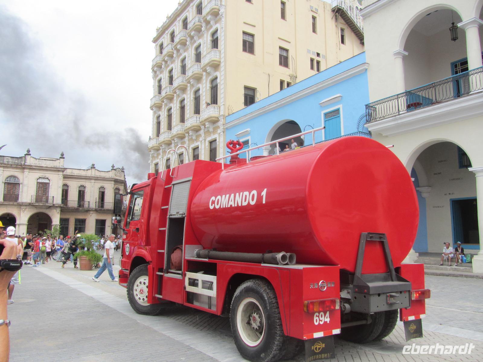 Anschließend unternehmen wir einen Stadt-Spaziergang durch das Altstadt Zentrum. Wir beginnen am Plaza de Armas mit dem Stadtmuseum, der Columbus-Statue, dem großen Antiquitätenmarkt und dem alten Ceiba-Baum. Unser Weg führt uns weiter entlang der Reste der Steinmauer Havannas und einem riesigen Bildnis aus Natursand, das bekannte Persönlichkeiten der Kolonialzeit darstellt. Unser Spaziergang geht weiter durch die alten Gassen der Stadt. Wir setzen uns in ein Café, wo wir uns echten Zuckerrohr-Saft, natürlich mit Rum, schmecken lassen. Weiter geht es zum Plaza Vieja mit den farbenfrohen und restaurierten Kolonialhäusern. Doch plötzlich ist Aufregung und wir sehen viele Menschen. Es gibt ein Feuer in der Nebenstraße und vor allem viele Schaulustige. Die Feuerwehr rückt näher, wir überqueren den Platz, um den Menschenmassen zu entgehen und müssen dabei sogar über den Feuerwehr-Schlauch steigen.