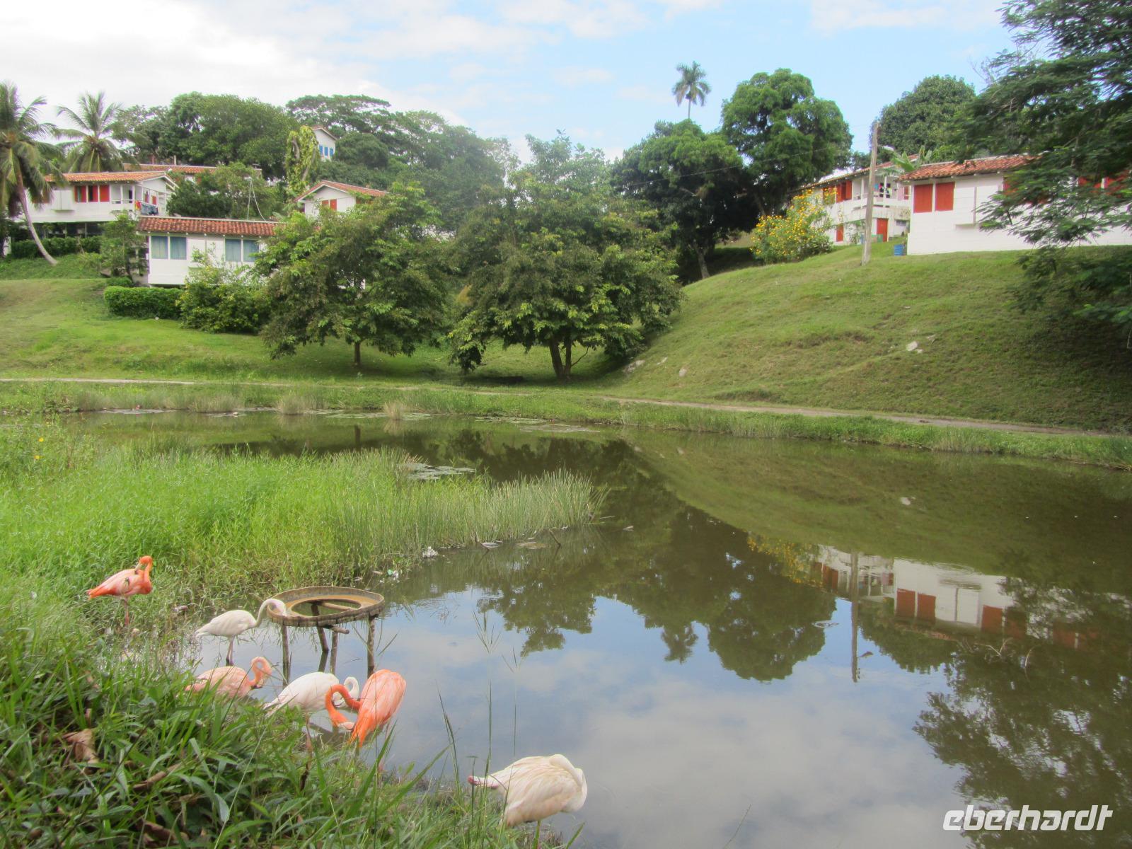Heute gibt es mal wieder eine tropische Depression. Es regnet und wir sind etwas schlecht gelaunt bis es den ersten Rum (dieses Mal schon vor 11 Uhr) gibt. Wir statten dem Bergdorf Las Terrazas einen Besuch ab. Nach einem Cocktail und ausführlichen Erklärungen von Marvi fahren wir in Richtung Wasserfall. Und siehe da, unser Busfahrer Emilio hat mal wieder ein gutes Wort für uns eingelegt, das Wetter klart auf und die Sonne kommt heraus. Am Wasserfall sind wir ganz allein und es traut sich sogar ein Mutiger ins Wasser. Wir genießen die Ruhe und die Natur. Das grüne Gebiet rund um das Dorf ist ein Biosphärenreservat und verdankt seine grüne Pracht der 1968 stattgefundenen Wiederaufforstung. Weiter fahren wir ins Dorf, wo wir uns einen leckeren Eiskaffee mit Kakaolikör in Maria's Café schmecken lassen. Anschließend spazieren wir entlang des Sees mit Flamingos und Kühen. Einige mutige Gäste haben die Idee sich durch die Lüfte gleiten zu lassen und unternehmen eine Tour am Seil quer über den Wald und den See. Die anderen Reisegäste besuchen das Wohnhaus des Sängers Polo Montanes und empfangen danach die Mutigen. Weiter geht es zum heutigen Mittagessen auf einer ehemaligen Kaffee-Plantage.