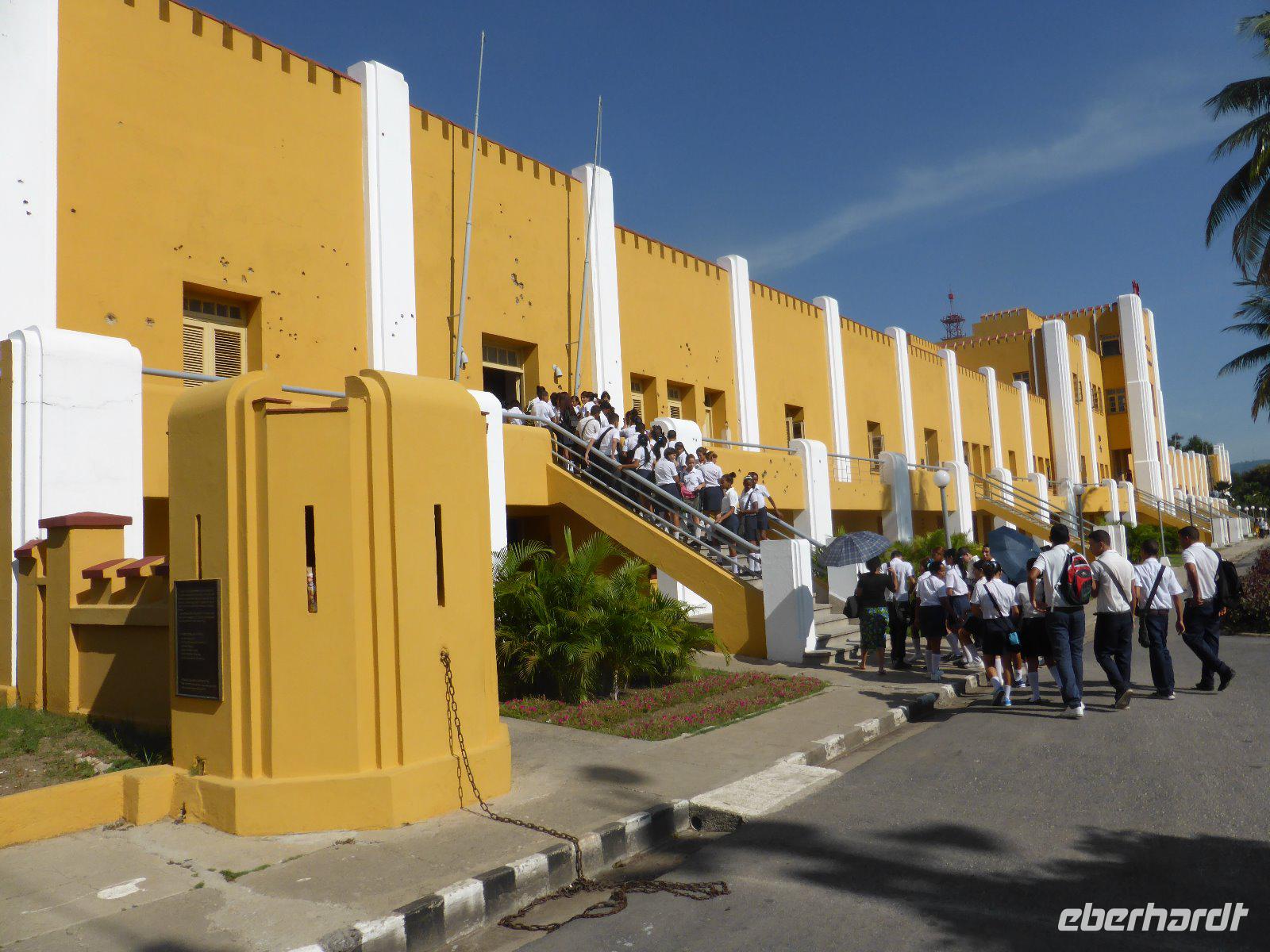 Unser Hotel befindet sich im Herzen der Stadt, so können wir am Morgen noch die wichtigsten Gebäude gewissermaßen im Sitzen um uns herum betrachten: die Kathedrale Santa Ifigenia, 1922 vollendet, den Sitz des ersten Gouverneurs Diego Velázques im ältesten Haus Kubas aus dem 16. Jahrhundert und das Rathaus, von dessem blauen Holzbalkon Fidel Castro den Sieg der Revolution verkündete. Im Vorbeifahren sahen wir auch die Kaserne Moncada, jetzt eine Schulstadt. Mit dem Überfall auf die Moncada Kaserne wollte Fidel Castro am 26.7.1953 ein Zeichen setzen und die Regierung stürzen. Der Anschlag schlug fehl und die Aufständischen wurden entweder eingesperrt oder umgebracht.