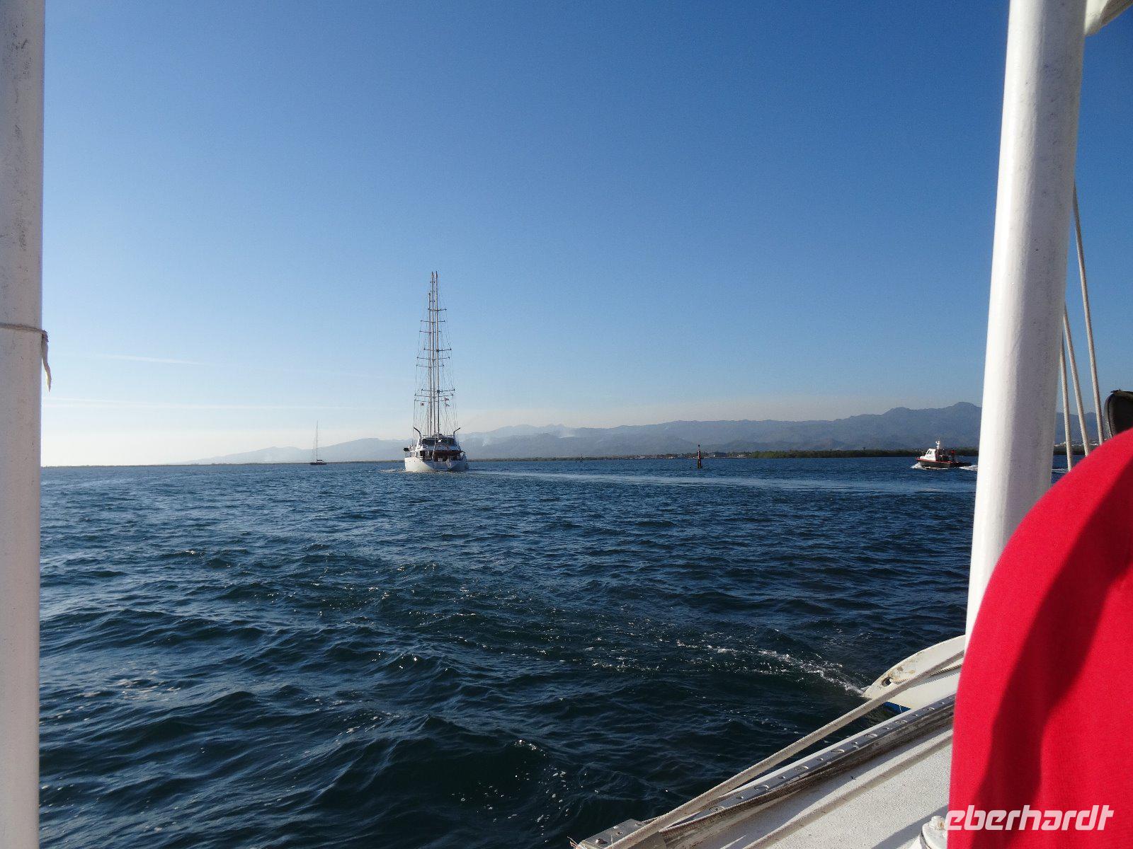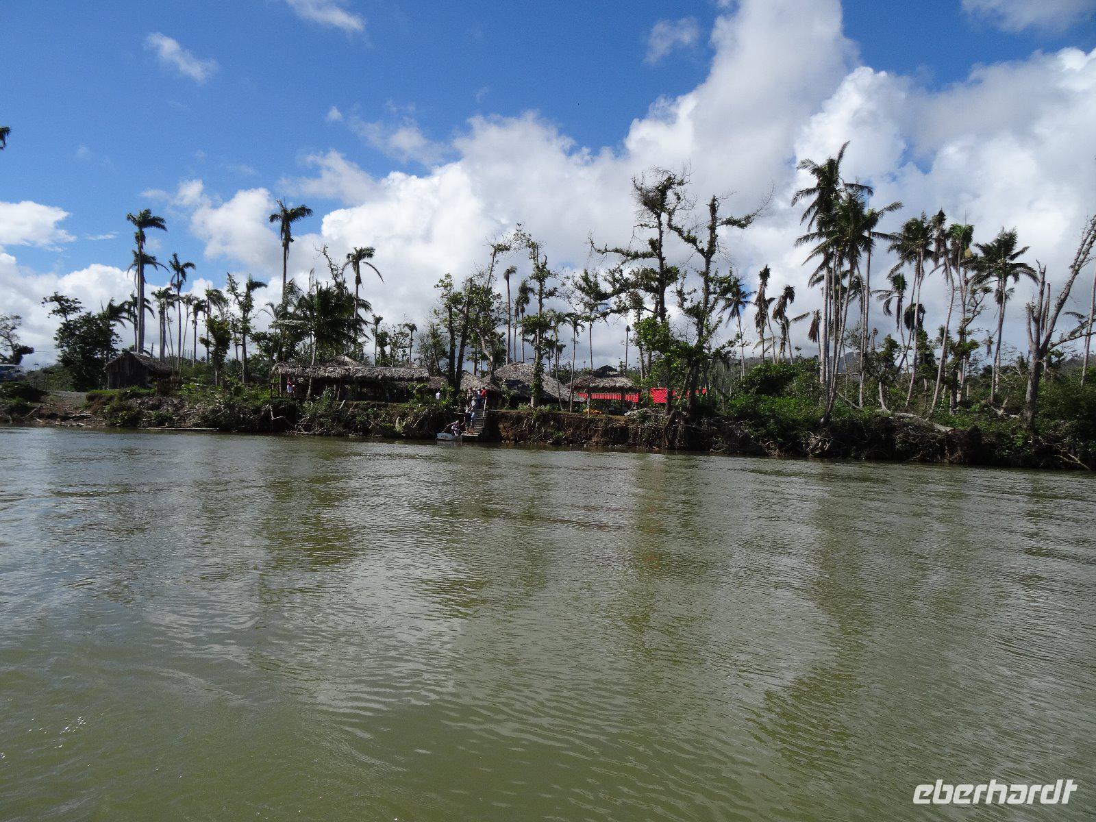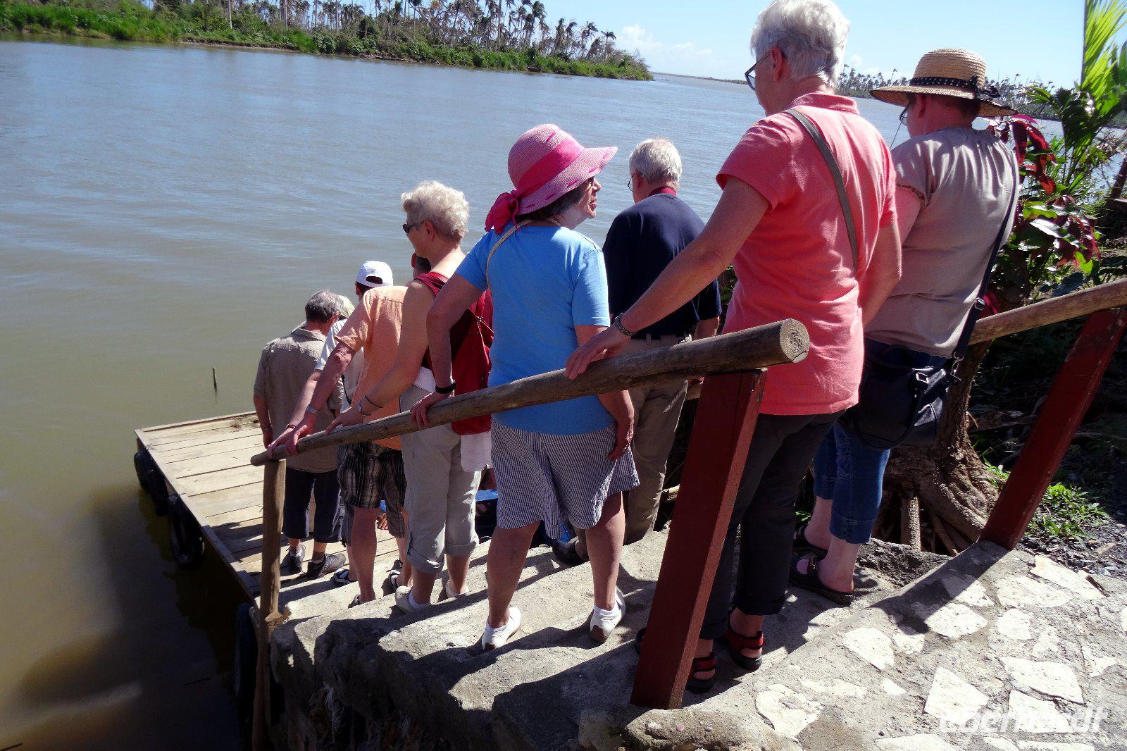 Wir werden von einem gut gelaunten Guide durch die Finca geführt, er lässt uns viele Aufgaben zu den hier vorkemmenden Pflanzen lösen und hält uns mit der Machete und dem Ausruf "Disziplina"! in Schach. Zur Belohnung für unser braves Verhalten gibt es eine Tasse Kakao mit Kokosmilch.Nun sind wir gestärkt für unsere Flussfahrt auf dem Rio Toa, mit 150 km einem der längsten Flüsse Kubas. Wir sehen Wasservögel und erkennen nochmals an den arg zerzausten Palmen die zerstörerische Kraft des letzten Hurracans.