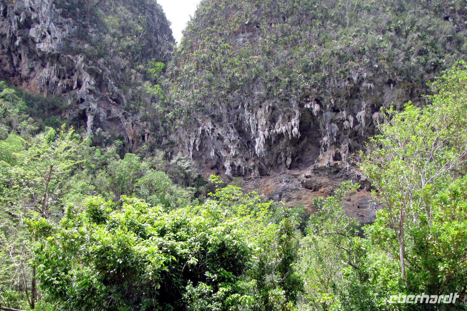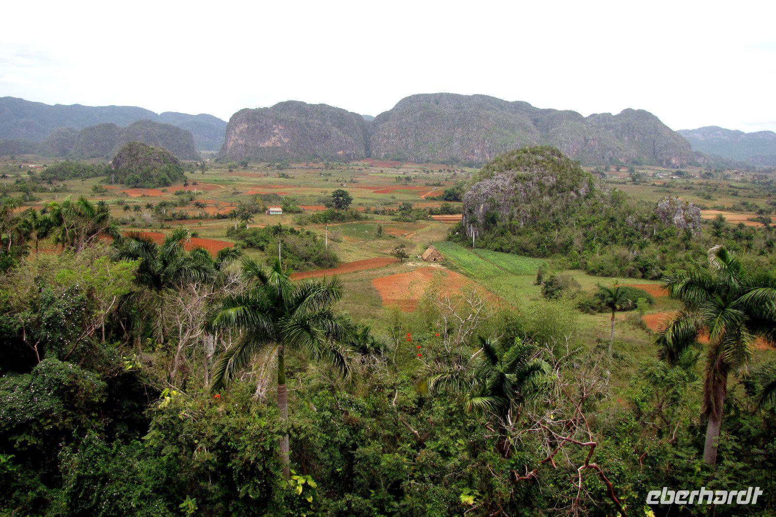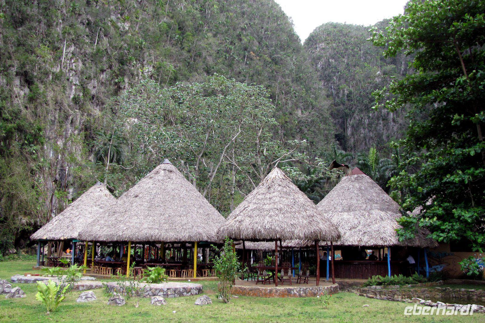 Nach der Großstadt kommt wieder die Naqtur zu ihrem Recht, wir fahren in den Westen Kubas, in die Provinz Pinar del Rio. In der Stadt Pinar del Rio ist unser Ziel zunächst eine kleine Fabrik, welche den Likör Guayabita herstellt, ein süßer Rum mit dem Zusatz dieser kleinen Frucht, der Guayabita. Im Firmenladen kann man den Likör kosten und kaufen, auch Zigarren gibt es in reicher Auswahl, sind wir doch in der Tabakhochburg Kubas. Einige kaufen, dann eilen wir weiter zu einem Tabakbauern, er zeigt uns das Rollen einer Zigarre und erzählt vom mühsamen Anbau des Tabaks. Zigarren können wir hier nicht kaufen, sind alle. Enttäuschung macht sich breit, aber es gibt einen Ausweg und wir fahren zu einem anderen Bauern, dort gibt es noch Zigarren - alles wird gut. Es folgt der wunderschöne Aussichtspunkt am Hotel Los Jazmines, von hier blickt man in das Tal von Vinales und sieht die eigenartige Karstformation der Mogotes und die rote Erde, welche dem Tabak sein einzigartiges Aroma verleiht. Überall stehen die Tabakschuppen aus Palmenholz und mit Palmenblättern gedeckt, darin kann der Tabak gut trocknen. Die Ausicht wird gekrönt durch eine wunderbare Pina Colada, die beste in Kuba. Zum Fotografieren fahren wir noch zur prähistorischen Wand, welche auf Anregung von Celia Sanchez, einer Kampfgefährtin Fidels, entstand und die Entstehung des Lebens darstellt. Nun aber zum Mittagessen in das Restaurant El Palenque. Der Name kommt von den Dörfern, in welchen entflohene Sklaven zusammen in den Bergen versteckt lebten. Im malerisch gelegenen Restaurant gibt es ganz überraschend Hühnchen, vielleicht bekommen wir auch bald Federn. Nun müssen wir aber auch noch den Ort Vinales würdigen, hübsche Häuser, viele kleine Restaurants und Ferienhäuser, der Tourismus hat sich hier äußerst dynamisch entwickelt. Wir schlendern eine Souvenirstraße entlang und geben die letzten CUC aus, dann geht es zum Übernachten nach Soroa. Die Bungalows sind hübsch gelegen, aber sehr reparaturbedürftig und das Restaurant ist für die vielen Hotelgäste ziemlich klein. Wir flüchten nach dem Essen an die Poolbar, dort sitzt man gut und die Getränke sind nicht teuer.