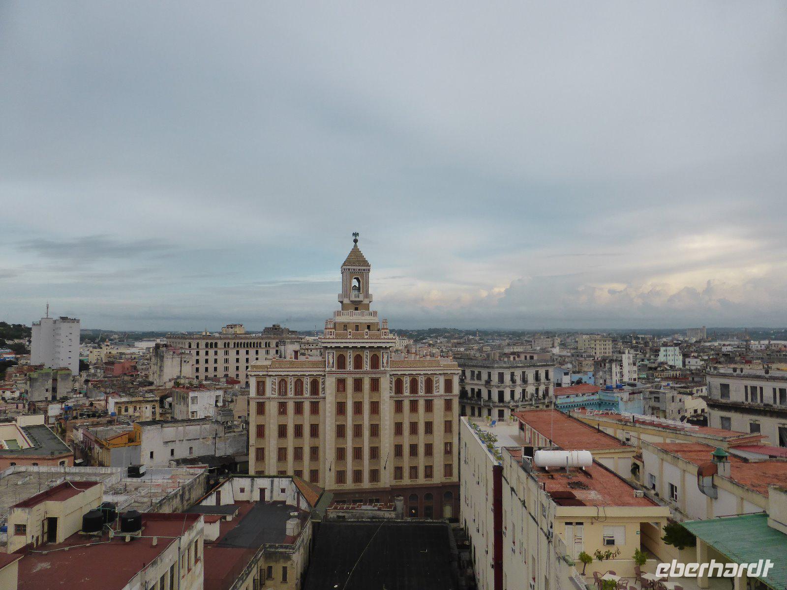 Wir wandten uns dann eher diesseitigen Dingen zu und spazierten über die Plaza Vieja durch die Straße Obispo bis zur Plaza Franciscus de Asis, in der dortigen ehemaligen Handelsbörse konnten wir im Café Mercurio zu Mitag essen und Havanna von oben betrachten. Auch von der Dachterrasse des Hotels Parque Central konnten wir sehr schön auf Havanna schauen, die Fledermaus auf dem Edificio Bacardi fotografieren und einen echten Daiquiri betrachten.