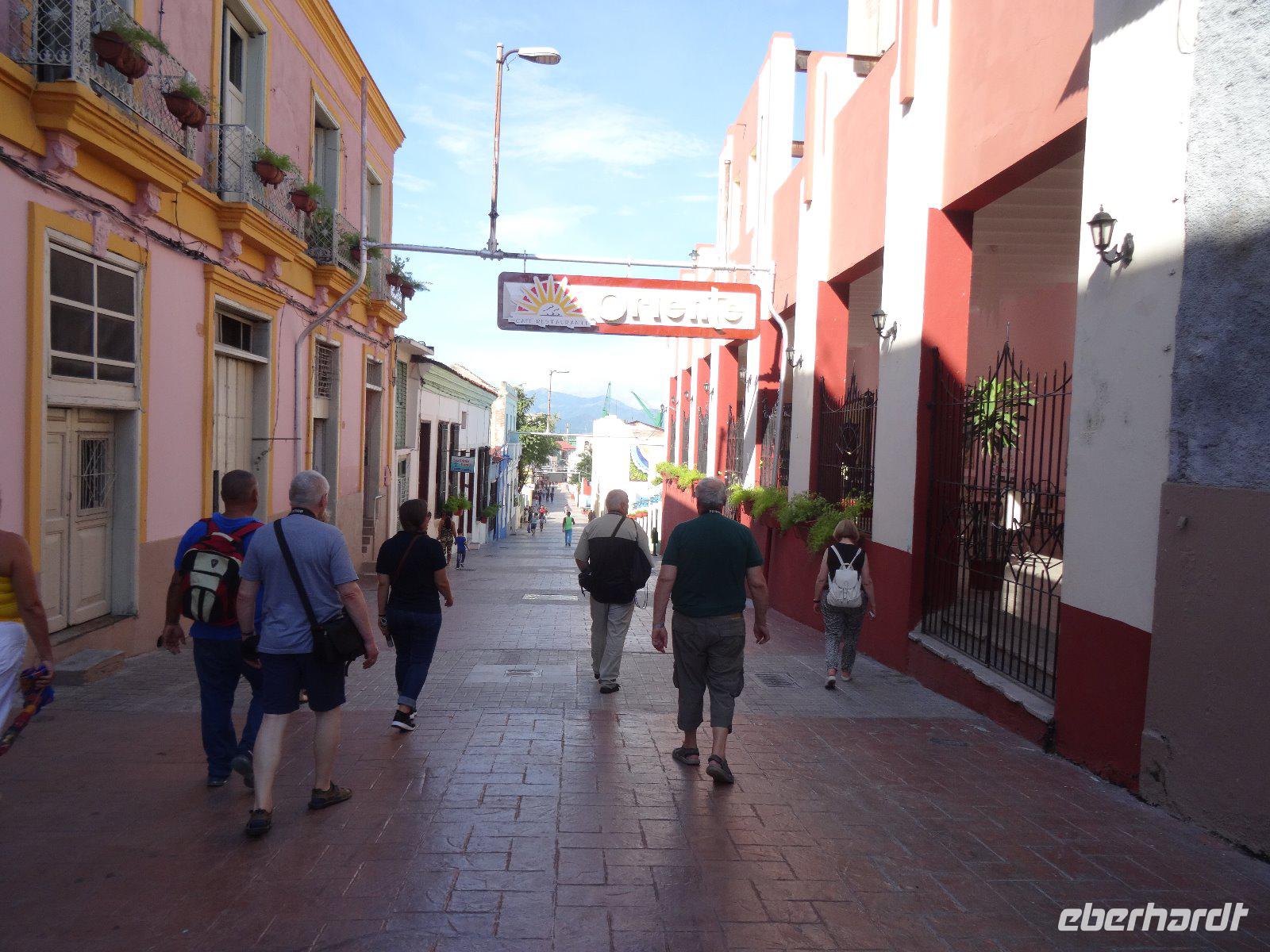 Da es noch früh am Tage ist, fahren wir mit dem Bus ins Zentrum der "heimlichen Hauptstadt" und besehen zunächst den Parque Cespedes im Zentrum der Stadt. Er ist umgeben von zahlreichen historischen Gebäuden, wie z. B. der Kathedrale Nuestra Senora de la Asunción, 1815 war Baubeginn, 1922 wurde sie vollendet. der Vorgängerbau wurde ein Opfer von Bränden, 1852 wurde der Neubau durch ein Erdbeben zerstört und in der jetzigen Kirche ist nur das Chorgestühl aus Edelhölzern erhalten geblieben. Wir sehen auch das älteste Haus der Stadt, Casa de Diego Velazquez aus dem 16. Jahrhundert und das Rathaus, von dessen Balkon Fidel Castro 1959 den Sieg der Revolution verkündete. Ein Bummel durch den Boulevard führt uns bis zum Hafen, dort gibt es die erste Gelegenheit für ein Gruppenfoto.