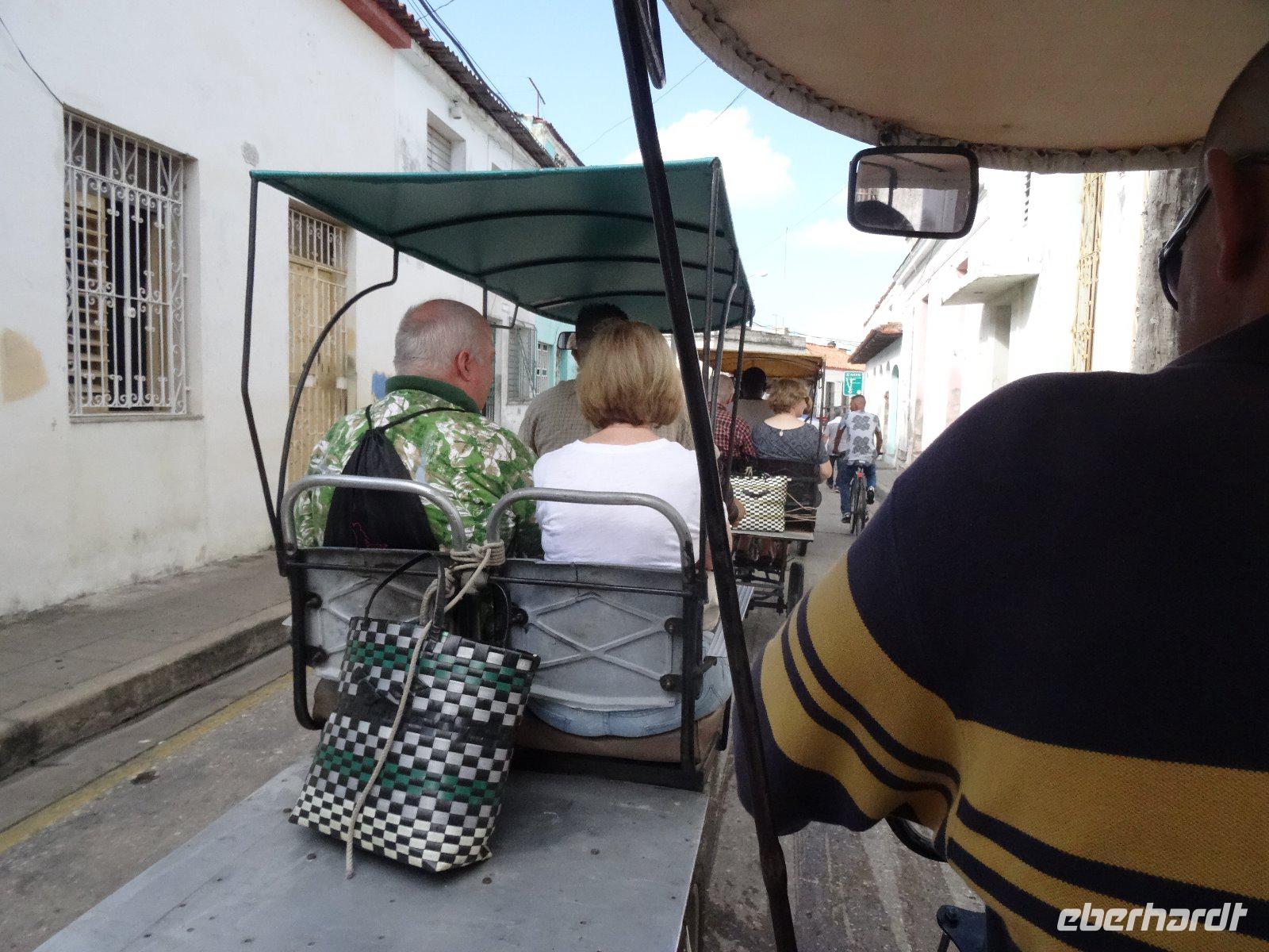 Wir beladen unseren Bus und steigen dann auf Fahrradtaxen um. So macht der Stadtrundgang mehr Spaß und man sieht auch mehr. Wir besuchen die schönen Plätze San Juan de Dios, Platz der Arbeiter und das Provinzialtheater. In der dreischiffigen Kathedrale beeindruckt uns besonders der silberne Altar. Auf dem Carmen -Platz stehen mehrere hübsche Skulpturen, wir vereinigen uns mit den "Klatschweibern" zum Gruppenbild. Interessant sind die für Camagüey typischen Tonkrüge, die Tinajones. In ihnen wurde das Regenwasser aufgefangen, Wasser war ein kostbares Gut und vor allem in der Trockenzeit nicht immer zu haben. Am Geburtshaus von Ignacio Agramonte (er kämpfte gegen die Spanier und verlor sein Leben in einer der ersten Kriegshandlungen) vorbei kehren wir zu unserem Bus zurück und machen uns auf die Fahrt in Richtung Trinidad. Vorher haben wir unsere Mittagspause in Sancti Spiritus, schauen uns etwas die kleine Kolonialstadt an und essen Mittag im Restaurant am Yayabo-Fluss. Es befindet sich direkt neben einer der wenigen noch erhaltenen steinernen Bogenbrücken aus der Mitte des 18. Jahrhunderts.