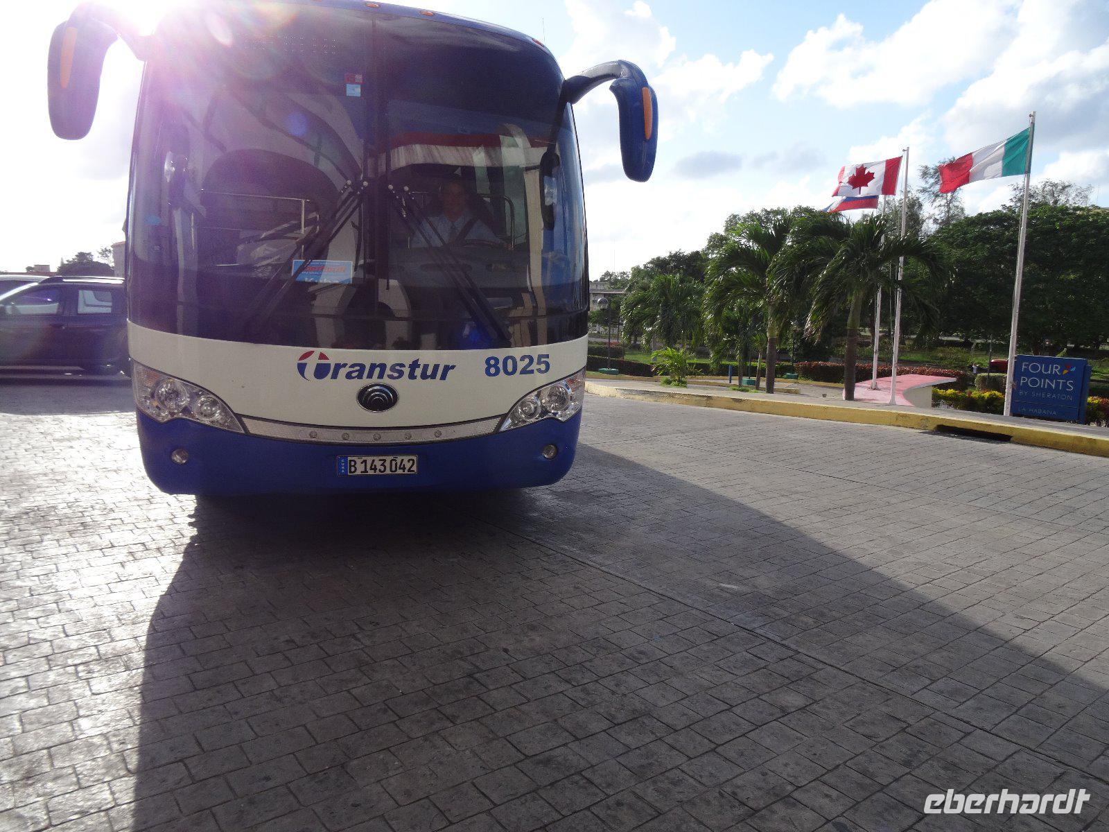 Nach einer kurzen Nacht gibt es 02:30 Uhr einen Morgenkaffee und ein Sandwich und schon bringt uns der Bus wieder zum Flugplatz, diesmal zum Abschnitt für die nationalen Flüge. Wieder heißt es warten und 06:00 Uhr hebt die Maschine ab zum Flug Richtung Osten, nach Santiago de Cuba. Schön ist der Blick auf die Bergkette der Sierra Maestra und nach 11/2 -stündigem Flug landen wir in Santiago de Cuba. Nun erwartet uns hier unser Bus mit dem Fahrer Yunelvis Reina. Er wird uns die nächsten zwei Wochen durch Kuba chauffieren.