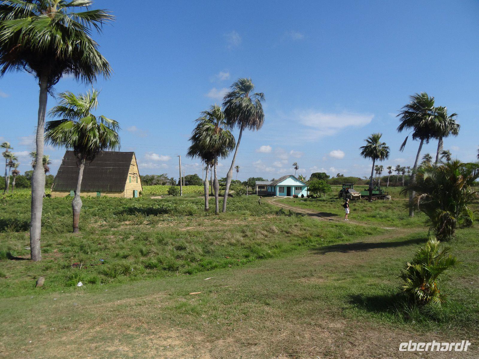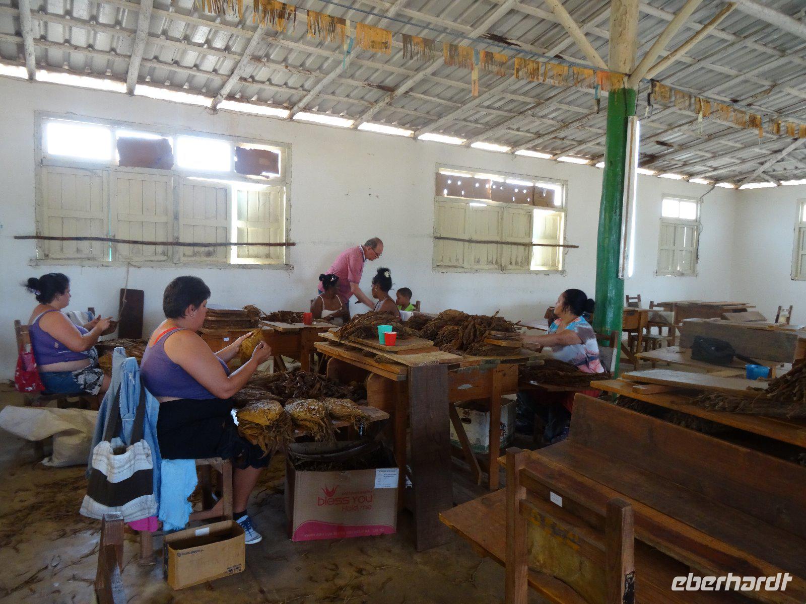 Unser Weg führt uns in Richtung Nordküste, dabei kommen wir durch das Städtchen Camajuani, in dem sich eine Tabakfabrik befindet. Hier wird der Tabak des zweiten großen Anbaugebietes nach dem Vuelta Abajo in Pinar del Rio, des Vuelta Arriba, verarbeitet. Da man in den großen Tabakfabriken in Havanna und in Pinar del Rio den Arbeitern nur von fern zuschauen kann und auch nur wenig Erklärungen bekommt, dies auch noch mit einer großen Zahl von Touristen teilen muss, war die Fabrik in Camajuani wirklich ein Glücksfall. Ganz ohne Drängeln können wir den Arbeiterinnen über die Schulter schauen und sehen, wie sie geschickt die Blätter rollen. Zuerst kommt die Einlage, dann das Umblatt und zuletzt das Deckblatt. Und alles muss immer exakt gleich sein, denn der Raucher stellt besondere Anforderungen an seine Marke. Mit diesen Informationen versehen, machen wir noch einen Besuch bei der Familie meiner Schwiegertochter, trinken einen guten Kaffee, essen einige Kleinigkeiten und schauen uns an, wie man so auf dem Lande wohnt. Aber dann wird es Zeit zum Aufbruch und wir fahren über einen ca. 50 km langen Damm auf die Insel Santa Maria in unser Hotel Sol Cayo Santa Maria. Noch hat sich die Natur nicht gänzlich von den Auswirkungen des Hurricans Irma, der den Norden mit Stärke 5 getroffen hat, erholt, vor allem die Mangroven sehen noch arg zerzaust aus.