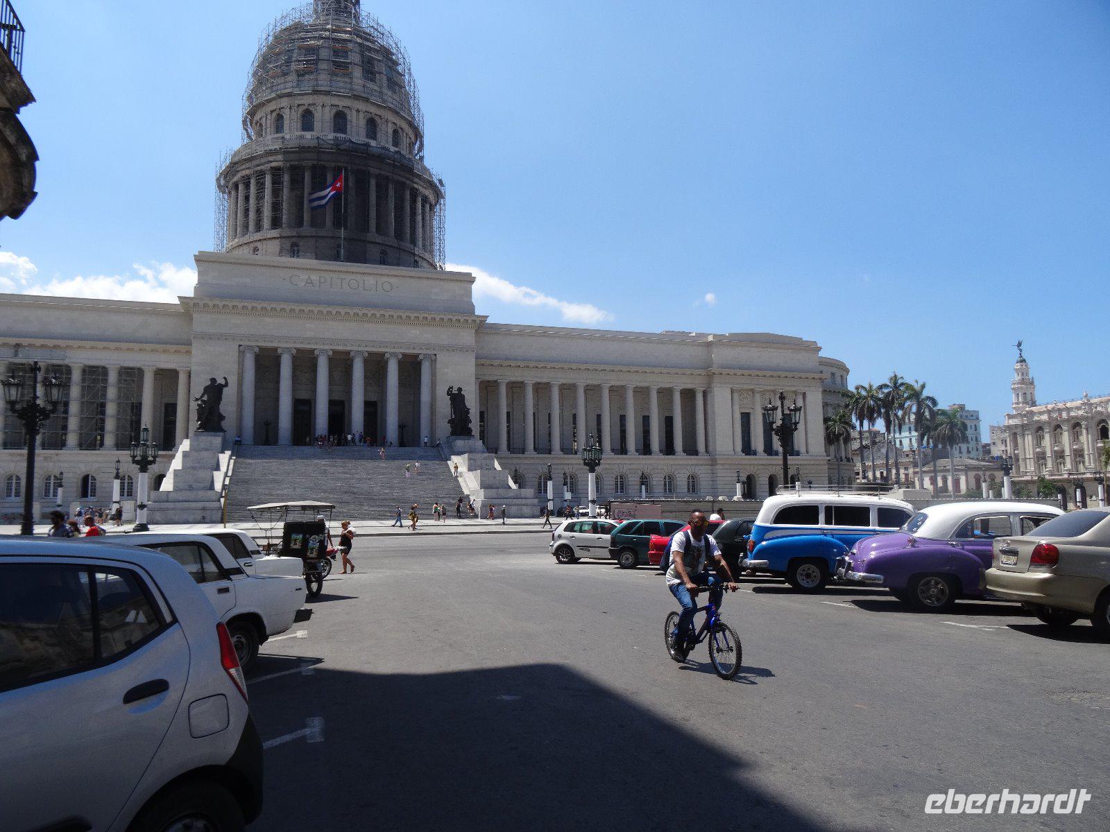 Mit große Erwartungen begeben wir uns nun auf die Erkundung der kubanischen Hauptstadt zu Fuß, mit dem Bus und mit den Oldtimern. Der Fußmarsch gilt Alt-Havanna: vom Platz des Franziskus von Aisisi aus begrüßen wir den legendären Caballero der Paris und fassen seinen Bart an- das soll Glück bringen, allerdings nur dann, wenn man auch gleichzeitig auf seinen Schuh tritt. Schöne Adelspaläste zeugen vom früheren Reichtum der Stadt, an der Plaza Vieja sieht man die Bemühungen um die Erhaltung der Stadt besonders deutlich. Der Gouverneurspalast am Waffenplatz symbolisierte einst Spaniens Herrschaft über die Kolonie. Im Schokoladenmuseum stärken wir uns mit einer kalten Schokolade und wandeln dann ein wenig auf Hemingways Spuren, gehen auf die Terrasse des Hotels Ambos Mundos und besuchen die Bodeguita del Medio und El Floridita. Im Zentrum Havannas essen wir in "Calesa Real" zu Mittag, trinken dazu einen Cuba libre.