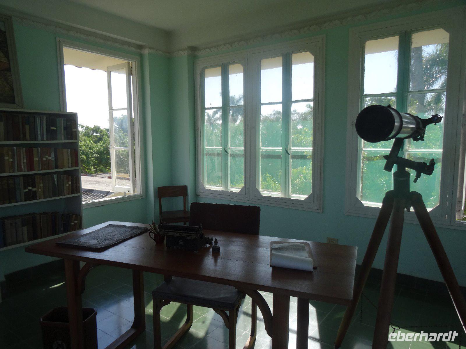 Am Morgen fahren wir zur Finca Vigia, in der Heminway lange Zeit mit seiner 4. Ehefrau lebte. Durch die Fenster kann man die Einrichtung sehen, so, als wäre der Dichter nur eben mal aus dem Zimmer gegangen. Wir sind früh dran und können alles in Ruhe betrachten. Durch den Garten gehen wir zum Swimming Pool und zu seiner Jacht Pilar. Nach dem Rundgang können wir noch ein freudiges Ereignis feiern: ein Ehepaar freut sich über das erste Enkelkind, das ist doch einen Toast wert. Nach einer Stippvisite im Fischerdorf Cojimar, wo Hemingways Boot stationiert war kehren wir nach Havanna zurück und besuchen die Dachterrasse des Hotels Parque Central. Von hier kann man sehr schön das Bacardi-Verwaltungsgebäude fotografieren und hat einen guten Blick über die ganze Stadt. In der angenehm kühlen Lobby essen wir noch etwas und dann heißt es zurück ins Hotel, umziehen, etwas frisch machen und 18:00 Uhr bringt uns der Bus zum Flughafen. Wir verabschieden uns vom Fahrer Janoi und vom Guide Jesús und entladen ein letztes Mal die Koffer.