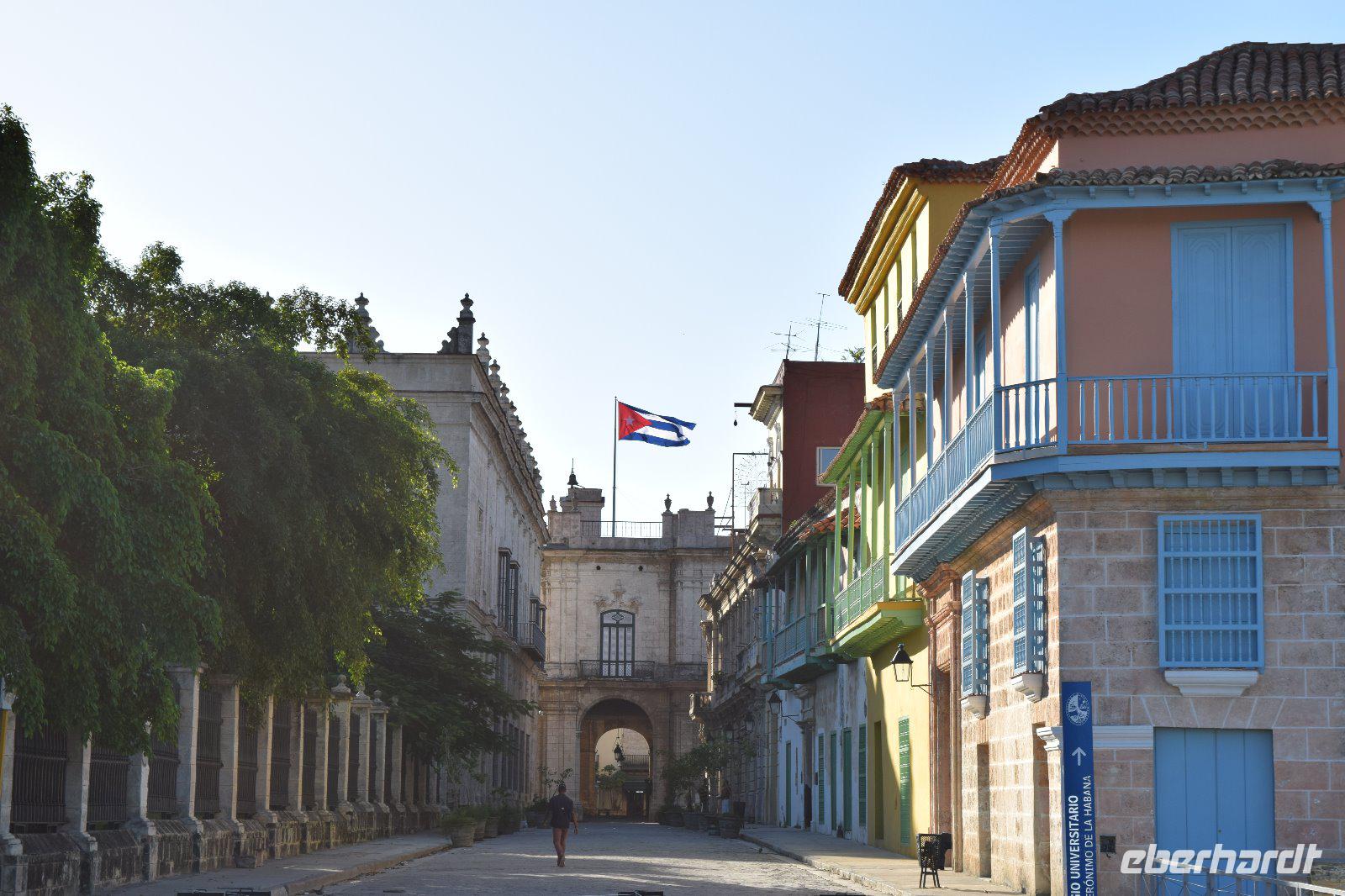 Mit dem Bus unterqueren wir die Hafeneinfahrt und fahren zur Festung El Morro, von hier hat man einen schönen Panoramablick auf die ganze Stadt. Auch den höchstgelegenen Platz der Stadt überqueren wir, den Platz der Revolution mit dem beeindruckenden Denkmal von José Martí. Rund um den Platz befinden sich die Ministerien, die Nationalbibliothek und das Nationaltheater.