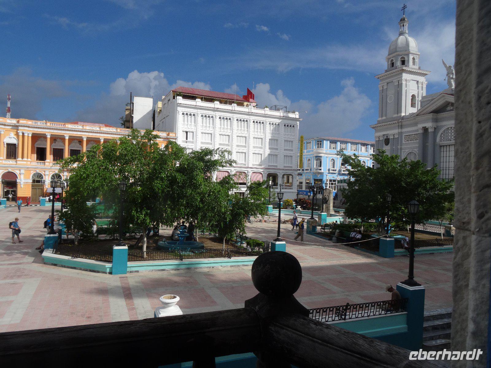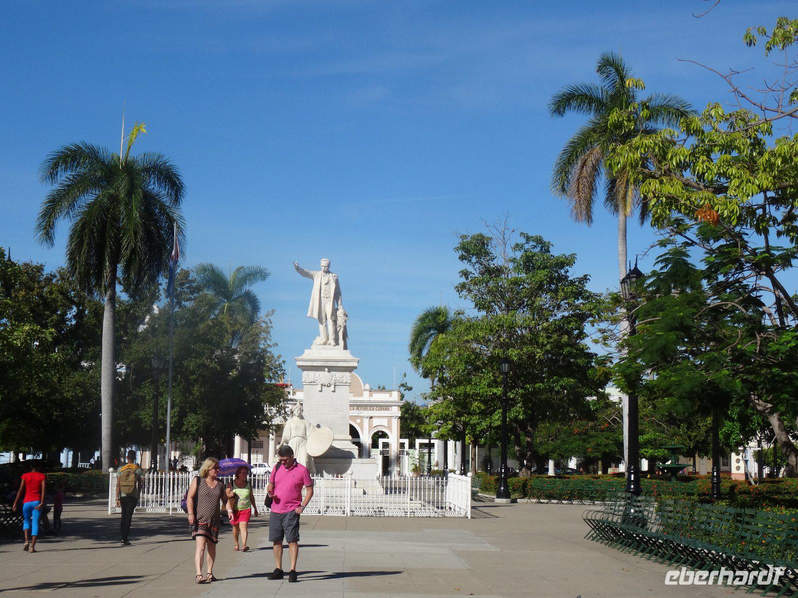 Im Mittelpunkt steht zunächst die Stadt Cienfuegos. Wir gehen zum Hauptplatz und sehen die Gründungsurkunde der Stadt, eingelassen in den Boden des Platzes. Die Stadt ist regelmäßig in Quadraten angelegt und noch recht jung. 1819 wurde sie durch D'Clouet aus Louisiana gegründet und zu Ehren des damaligen Gouverneurs José Cienfuegos benannt. Sie wurde durch den Zuckerexport reich und das sieht man den schönen Gebäuden auch an. Das Rathaus und die Kirche säumen den Platz, ebenso wie das Teatro Terry und der Palacio Ferrer. Das Theater hat eine bemerkenswerte Inneneinrichtung, wird aber noch restauriert. Hier sang Enrico Caruso 1920 und übernachtete im Palacio Ferrer. Um uns das Besichtigen etwas zu erleichtern, durchfahren wir die Stadt mit einem Minizug und so haben wir nunmehr einen guten Eindruck von der "Perle des Südens" gewonnen. Abgerundet wird dies mit einer Bootsfahrt in der Bucht von Cienfuegos. Auf dem Boot lernen wir einen neuen Drink kennen, der erwartungsgemäß "Bucht von Cienfuegos" heißt und beachtliche Mengen an Rum enthält. Nach all diesen Anstrengungen kehren wir im exklusiven Yachtclub auf einen Mittagsimbiss ein und setzen danach unsere Fahrt nach Santa Clara fort.