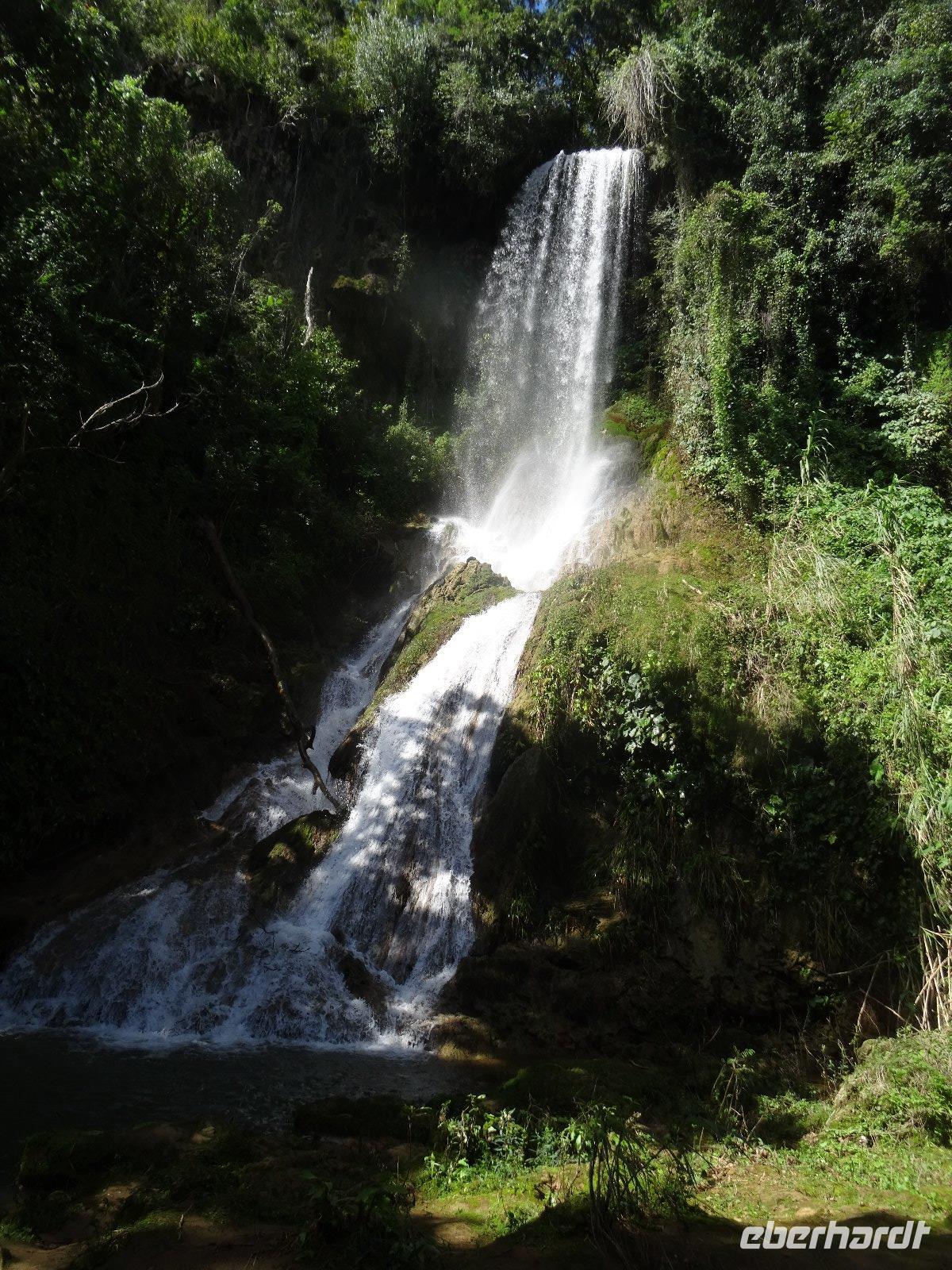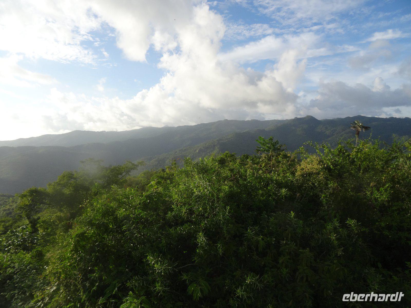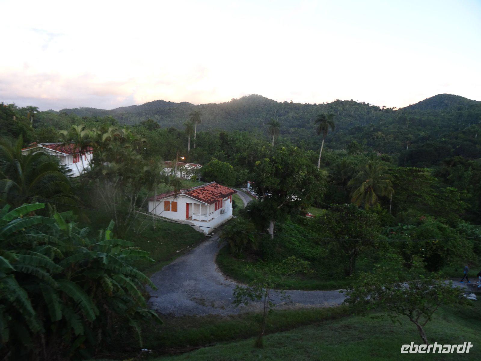 Wie schön - heute erfolgt der Start ohne Koffer, da ist alles viel leichter. Es steht eine Wanderung im Naturschutzgebiet auf dem Plan. Zunächst fahren wir mit russischen LkWs bis zum Startpunkt unserer Wanderung. Gut durchgeschüttelt kommen wir an und machen uns auf den Weg, immer entlang am Fluss Rio Melodioso. Der Weg ist abwechslungsreich und führt vorüber an Kaffeplantagen, Mameybäumen und Zitrus. Einige Male überqueren wir das Flüsschen und dann sind wir am Wasserfall mit einer Badelagune. Einige wagen den Sprung ins kühle Nass und werden mit einer wunderbaren Erfrischung belohnt. Auf dem Rückweg halten wir an einem Obst-und Süßigkeitenstand und kaufen noch etwas ein. Danach gibt es noch einen weiteren Halt an einer Cafeteria. Wir kosten den vollmundigen Gebirgskaffee und staunen über dessen Qualität. Noch einmal schütteln uns die LkWs durch und dann treten wir die Rückfahrt mit dem Bus an, nicht ohne einen Fotostopp auf halber Höhe über den Dächern der Stadt.