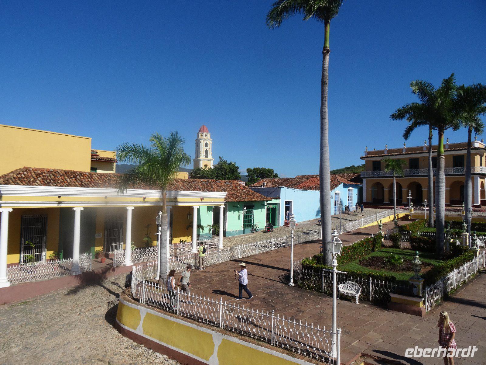 Den nächsten Halt haben wir in Sancti Spiritus, einer hübschen Stadt, die leider im Schatten von Trinidad steht und nicht so oft von Touristen besucht wird. Im Restaurant an der steinernen Brücke essen wir eine Kleinigkeit und trinken dazu das berühmte Getränk Cunyaya, welches aus Zuckerrohrsaft, Honig, Zitronensaft und Rum besteht. Beschwingt geht es weiter nach Manaca Iznaga, dem ehemaligen Landsitz und Gut der gleichnamigen Familie. Ein Teil der Gruppe besteigt den Turm (155 Stufen) und wird mit einer schönen Aussicht belohnt und wir alle sehen im Herrenhaus die Nachbildung einer Zuckerrohrmühle. Natürlich trinken wir auch den Guarapo, den Zuckerrohrsaft mit oder ohne Rum.