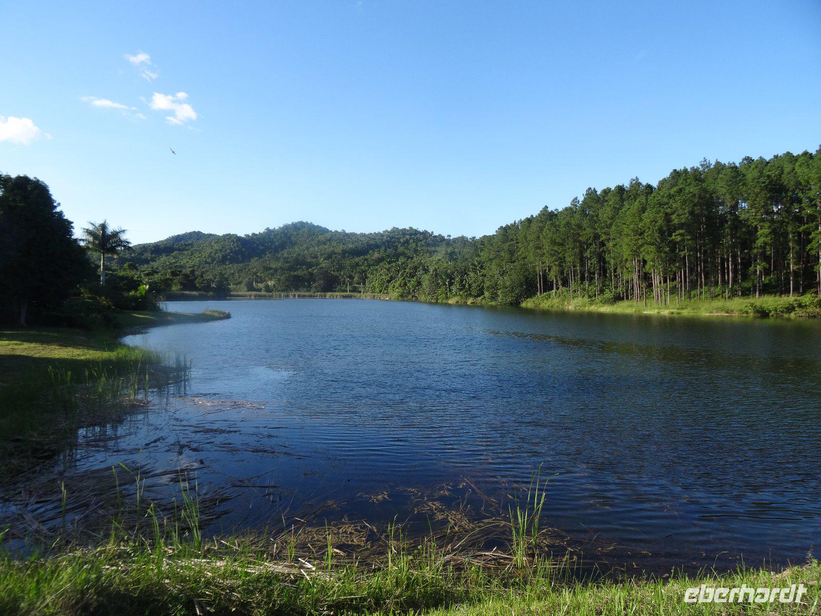 Ein langer Fahrtag steht uns bevor, wir müssen in den Westteil der Insel. Dennoch verlassen wir frohgemut unser Hotel, der erste Halt an km 259 ist nur kurz, die Mittagspause legen wir in der hübschen Raststätte "Fiesta Campesina" ein. Unter Palmen essen wir Sandwiches, trinken Bier oder etwas Stärkeres und bald besteigen wir unseren Bus wieder zur Weiterfahrt. Nach einer weiteren kurzen Rast an der Raststätte 6 vias erreichen wir 16:30 Uhr den Komplex Las Terrazas. Zunächst hören wir etwas über die Ziele und den Aufbau dieser Gemeinschaft. Sie entstand, um den hier wenig ergiebigen Kaffeeanbau abzulösen und den Bauern ein besseres Leben zu ermöglichen. Sie pflanzten Tausende von Bäumen, überwiegend Edelholz, und errichteten Wohnhäuser, Schule, Kindergarten, Werkstätten, ein Hotel. Sie arbeiten alle gemeinsam und verdienen gegenwärtig ihr Geld mit dem Tourismus. Die umgebende Natur ist streng geschützt und so konnte ein funktionierendes Ökosystem erhalten werden. Wir kehren im Kaffee Maria ein und trinken einen guten Kaffee, danach checken wir im Hotel ein und allen gefällt die Lage und die Ruhe.